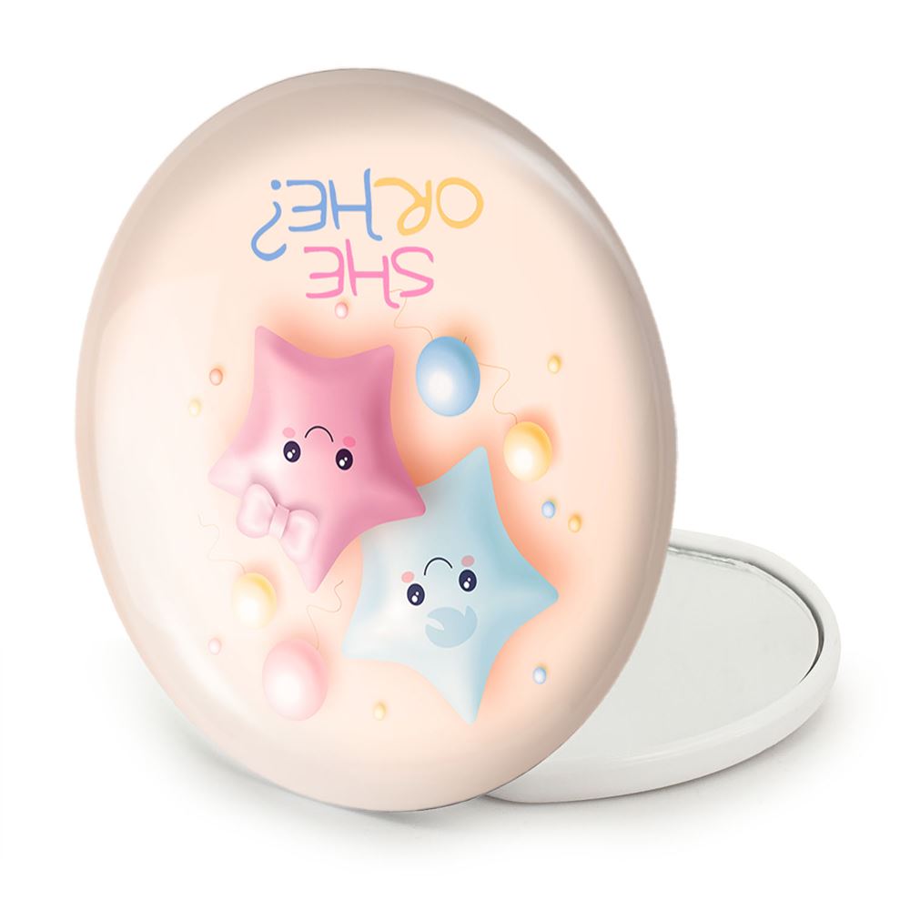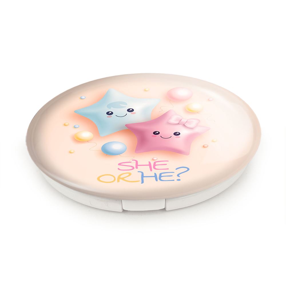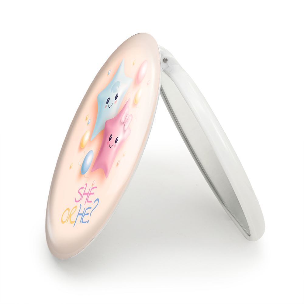 آینه های تاشو تعیین جنسیت خندالو، از جنس پلاستیک فشرده ABS تولید شده و به رنگ سفید می باشد. یکی از آینه ها ابعاد واقعی را نشان داده و دیگری با قابلیت بزرگنمایی، جزئیات را بهتر نمایش می دهد. ابعاد هر یک از آینه ها، دایره ای به قطر 7.5 سانت می باشد که نه خیلی بزرگ و غیر قابل استفاده در کیف آرایشی ست و نه خیلی کوچک که تصویر خاصی در آن مشاهده نشود. آینه تاشو تعیین جنسیت سایزی استاندارد و کارآمد دارد و در هر کیفی جا میگیرد. چاپ طرح بوسیله چاپگرهای دیجیتال شش رنگ با شفافیت و کیفیتی مثال زدنی بر روی یک وجه از بدنه ی آینه انجام گرفته و با روکش لمینت حرارتی پوشیده شده که در مقابل آسیب و خط و خش مقاوم بوده و کیفیت بالایی دارد. درب آینه بوسیله قفل بدنه ی آن، باز نمی ماند و کاملا بسته می شود و مناسب قرار گیری در کیف لوازم آرایش و کیف های کوچک دستی نیز هست. آینه های تاشو تعیین جنسیت خندالو با تنوع طرحی بسیار بالا، سلیقه هر نوع مخاطبی را تامین میکند.