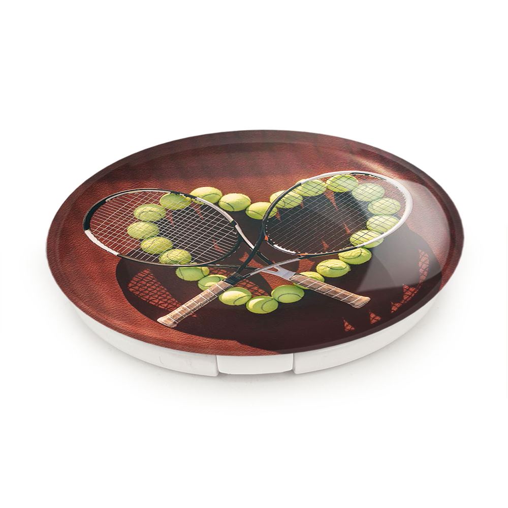 آینه های تاشو تنیس Tennis خندالو، از جنس پلاستیک فشرده ABS تولید شده و به رنگ سفید می باشد. یکی از آینه ها ابعاد واقعی را نشان داده و دیگری با قابلیت بزرگنمایی، جزئیات را بهتر نمایش می دهد. ابعاد هر یک از آینه ها، دایره ای به قطر 7.5 سانت می باشد که نه خیلی بزرگ و غیر قابل استفاده در کیف آرایشی ست و نه خیلی کوچک که تصویر خاصی در آن مشاهده نشود. آینه تاشو تنیس Tennis سایزی استاندارد و کارآمد دارد و در هر کیفی جا میگیرد. چاپ طرح بوسیله چاپگرهای دیجیتال شش رنگ با شفافیت و کیفیتی مثال زدنی بر روی یک وجه از بدنه ی آینه انجام گرفته و با روکش لمینت حرارتی پوشیده شده که در مقابل آسیب و خط و خش مقاوم بوده و کیفیت بالایی دارد. درب آینه بوسیله قفل بدنه ی آن، باز نمی ماند و کاملا بسته می شود و مناسب قرار گیری در کیف لوازم آرایش و کیف های کوچک دستی نیز هست. آینه های تاشو تنیس Tennis خندالو با تنوع طرحی بسیار بالا، سلیقه هر نوع مخاطبی را تامین میکند.