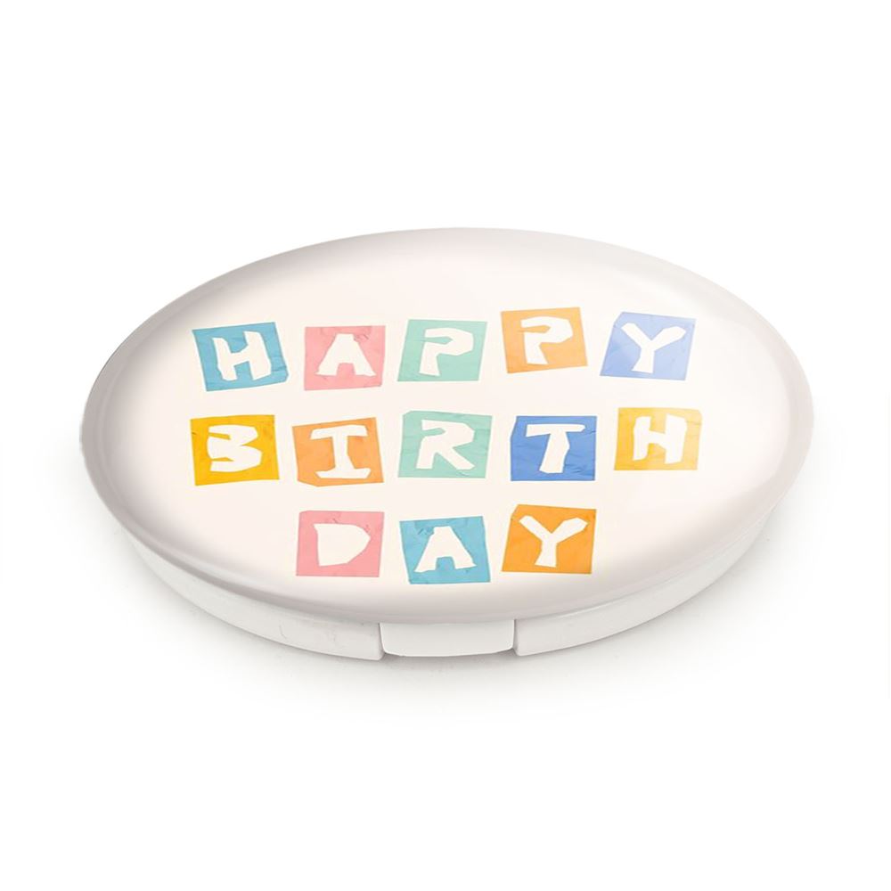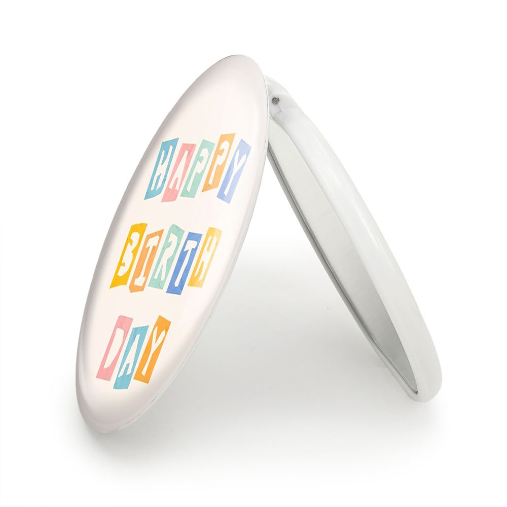 آینه های تاشو تولد خندالو، از جنس پلاستیک فشرده ABS تولید شده و به رنگ سفید می باشد. یکی از آینه ها ابعاد واقعی را نشان داده و دیگری با قابلیت بزرگنمایی، جزئیات را بهتر نمایش می دهد. ابعاد هر یک از آینه ها، دایره ای به قطر 7.5 سانت می باشد که نه خیلی بزرگ و غیر قابل استفاده در کیف آرایشی ست و نه خیلی کوچک که تصویر خاصی در آن مشاهده نشود. آینه تاشو تولد سایزی استاندارد و کارآمد دارد و در هر کیفی جا میگیرد. چاپ طرح بوسیله چاپگرهای دیجیتال شش رنگ با شفافیت و کیفیتی مثال زدنی بر روی یک وجه از بدنه ی آینه انجام گرفته و با روکش لمینت حرارتی پوشیده شده که در مقابل آسیب و خط و خش مقاوم بوده و کیفیت بالایی دارد. درب آینه بوسیله قفل بدنه ی آن، باز نمی ماند و کاملا بسته می شود و مناسب قرار گیری در کیف لوازم آرایش و کیف های کوچک دستی نیز هست. آینه های تاشو تولد خندالو با تنوع طرحی بسیار بالا، سلیقه هر نوع مخاطبی را تامین میکند.