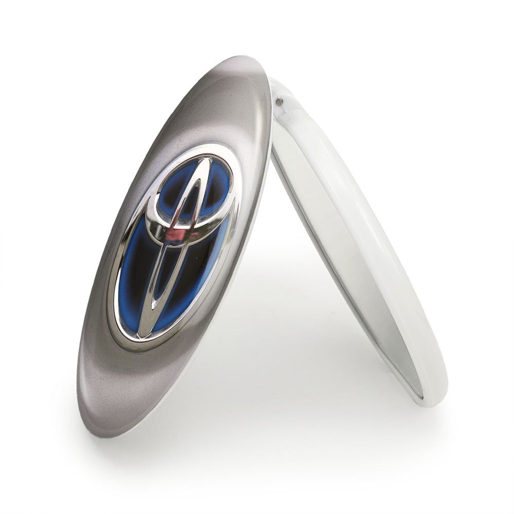 آینه های تاشو تویوتا Toyota خندالو، از جنس پلاستیک فشرده ABS تولید شده و به رنگ سفید می باشد. یکی از آینه ها ابعاد واقعی را نشان داده و دیگری با قابلیت بزرگنمایی، جزئیات را بهتر نمایش می دهد. ابعاد هر یک از آینه ها، دایره ای به قطر 7.5 سانت می باشد که نه خیلی بزرگ و غیر قابل استفاده در کیف آرایشی ست و نه خیلی کوچک که تصویر خاصی در آن مشاهده نشود. آینه تاشو تویوتا Toyota سایزی استاندارد و کارآمد دارد و در هر کیفی جا میگیرد. چاپ طرح بوسیله چاپگرهای دیجیتال شش رنگ با شفافیت و کیفیتی مثال زدنی بر روی یک وجه از بدنه ی آینه انجام گرفته و با روکش لمینت حرارتی پوشیده شده که در مقابل آسیب و خط و خش مقاوم بوده و کیفیت بالایی دارد. درب آینه بوسیله قفل بدنه ی آن، باز نمی ماند و کاملا بسته می شود و مناسب قرار گیری در کیف لوازم آرایش و کیف های کوچک دستی نیز هست. آینه های تاشو تویوتا Toyota خندالو با تنوع طرحی بسیار بالا، سلیقه هر نوع مخاطبی را تامین میکند.