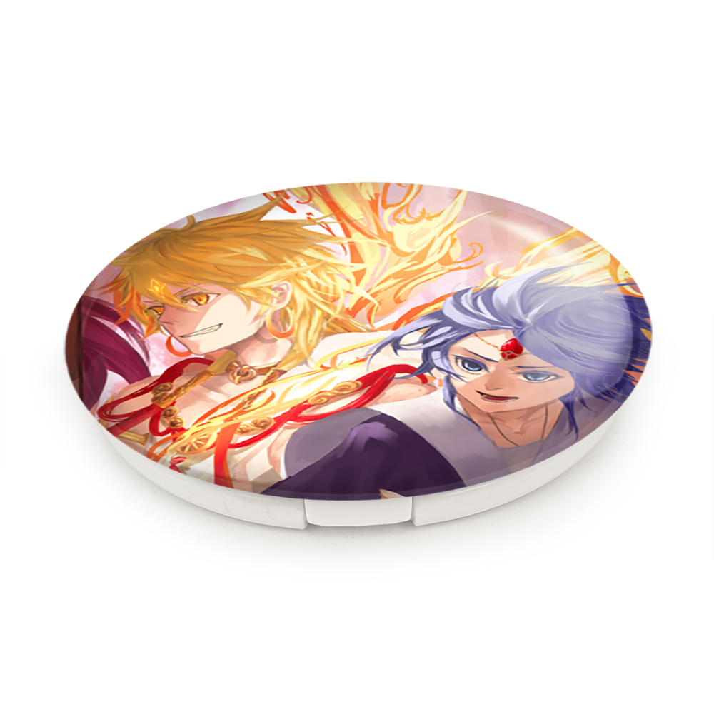 آینه های تاشو تیتوس انیمه ماگی هزارتوی سحر و جادو خندالو، از جنس پلاستیک فشرده ABS تولید شده و به رنگ سفید می باشد. یکی از آینه ها ابعاد واقعی را نشان داده و دیگری با قابلیت بزرگنمایی، جزئیات را بهتر نمایش می دهد. ابعاد هر یک از آینه ها، دایره ای به قطر 7.5 سانت می باشد که نه خیلی بزرگ و غیر قابل استفاده در کیف آرایشی ست و نه خیلی کوچک که تصویر خاصی در آن مشاهده نشود. آینه تاشو تیتوس انیمه ماگی هزارتوی سحر و جادو سایزی استاندارد و کارآمد دارد و در هر کیفی جا میگیرد. چاپ طرح بوسیله چاپگرهای دیجیتال شش رنگ با شفافیت و کیفیتی مثال زدنی بر روی یک وجه از بدنه ی آینه انجام گرفته و با روکش لمینت حرارتی پوشیده شده که در مقابل آسیب و خط و خش مقاوم بوده و کیفیت بالایی دارد. درب آینه بوسیله قفل بدنه ی آن، باز نمی ماند و کاملا بسته می شود و مناسب قرار گیری در کیف لوازم آرایش و کیف های کوچک دستی نیز هست. آینه های تاشو تیتوس انیمه ماگی هزارتوی سحر و جادو خندالو با تنوع طرحی بسیار بالا، سلیقه هر نوع مخاطبی را تامین میکند.