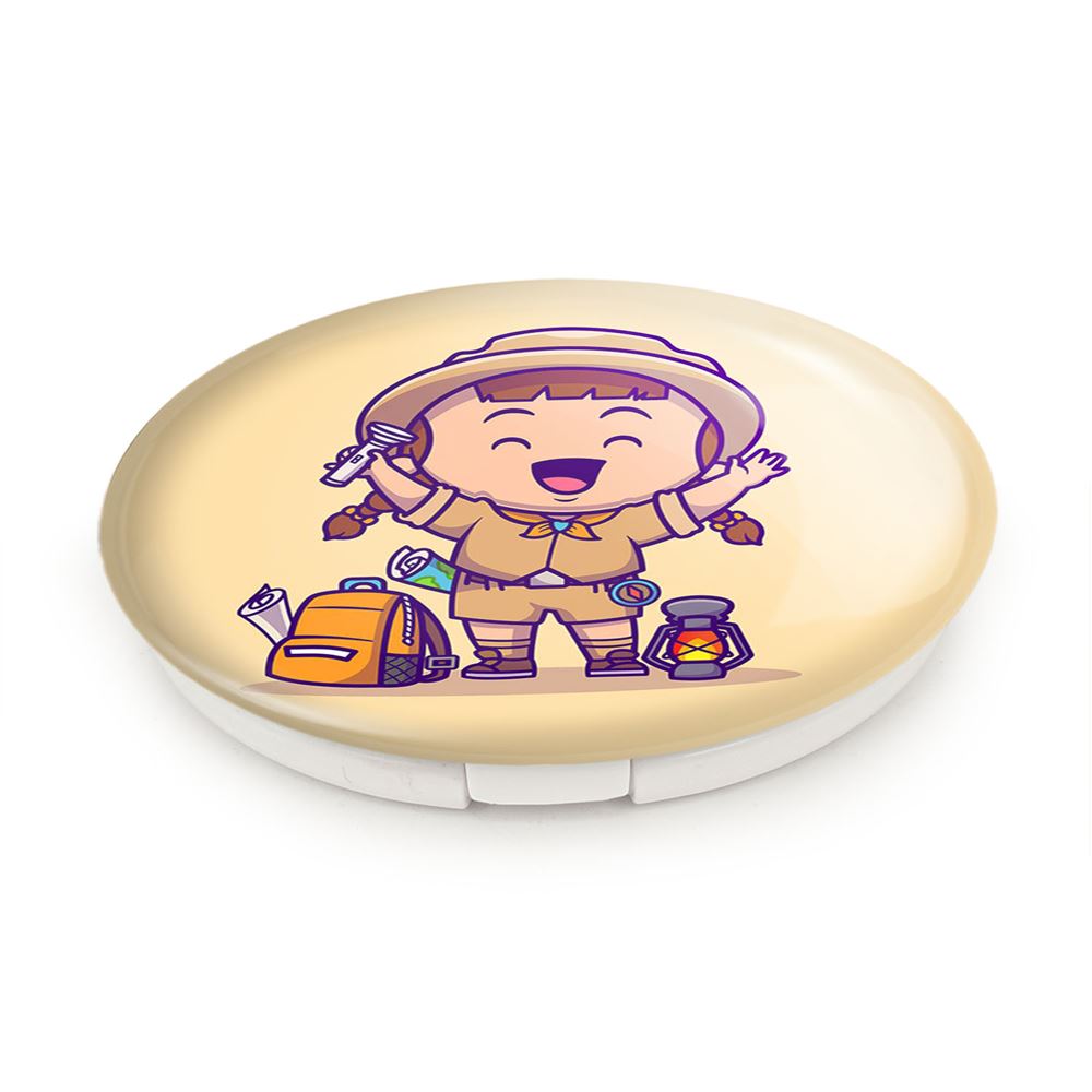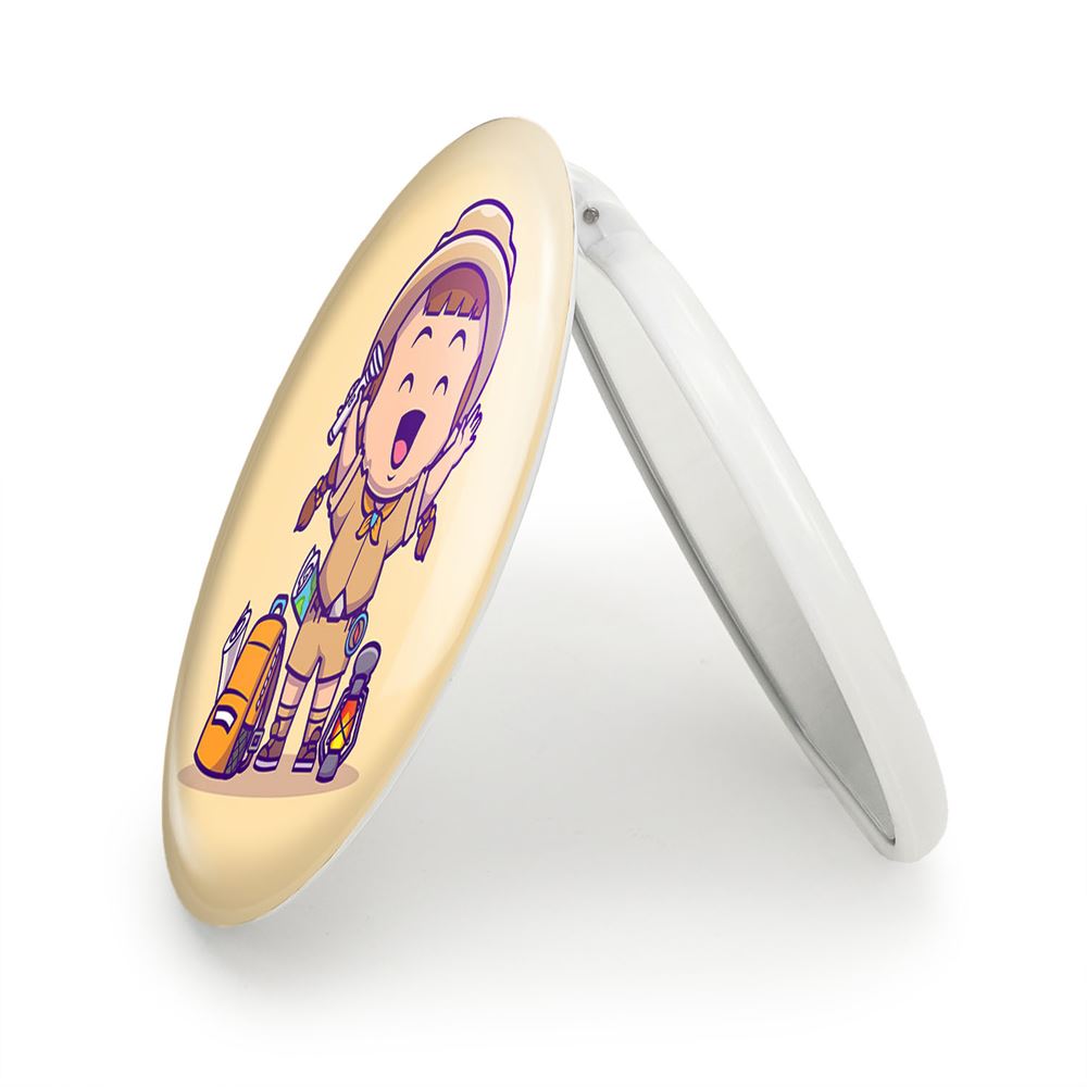 آینه های تاشو جهانگرد خندالو، از جنس پلاستیک فشرده ABS تولید شده و به رنگ سفید می باشد. یکی از آینه ها ابعاد واقعی را نشان داده و دیگری با قابلیت بزرگنمایی، جزئیات را بهتر نمایش می دهد. ابعاد هر یک از آینه ها، دایره ای به قطر 7.5 سانت می باشد که نه خیلی بزرگ و غیر قابل استفاده در کیف آرایشی ست و نه خیلی کوچک که تصویر خاصی در آن مشاهده نشود. آینه تاشو جهانگرد سایزی استاندارد و کارآمد دارد و در هر کیفی جا میگیرد. چاپ طرح بوسیله چاپگرهای دیجیتال شش رنگ با شفافیت و کیفیتی مثال زدنی بر روی یک وجه از بدنه ی آینه انجام گرفته و با روکش لمینت حرارتی پوشیده شده که در مقابل آسیب و خط و خش مقاوم بوده و کیفیت بالایی دارد. درب آینه بوسیله قفل بدنه ی آن، باز نمی ماند و کاملا بسته می شود و مناسب قرار گیری در کیف لوازم آرایش و کیف های کوچک دستی نیز هست. آینه های تاشو جهانگرد خندالو با تنوع طرحی بسیار بالا، سلیقه هر نوع مخاطبی را تامین میکند.