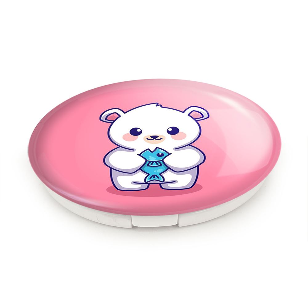 آینه های تاشو حیوانات بامزه خرس قطبی خندالو، از جنس پلاستیک فشرده ABS تولید شده و به رنگ سفید می باشد. یکی از آینه ها ابعاد واقعی را نشان داده و دیگری با قابلیت بزرگنمایی، جزئیات را بهتر نمایش می دهد. ابعاد هر یک از آینه ها، دایره ای به قطر 7.5 سانت می باشد که نه خیلی بزرگ و غیر قابل استفاده در کیف آرایشی ست و نه خیلی کوچک که تصویر خاصی در آن مشاهده نشود. آینه تاشو حیوانات بامزه خرس قطبی سایزی استاندارد و کارآمد دارد و در هر کیفی جا میگیرد. چاپ طرح بوسیله چاپگرهای دیجیتال شش رنگ با شفافیت و کیفیتی مثال زدنی بر روی یک وجه از بدنه ی آینه انجام گرفته و با روکش لمینت حرارتی پوشیده شده که در مقابل آسیب و خط و خش مقاوم بوده و کیفیت بالایی دارد. درب آینه بوسیله قفل بدنه ی آن، باز نمی ماند و کاملا بسته می شود و مناسب قرار گیری در کیف لوازم آرایش و کیف های کوچک دستی نیز هست. آینه های تاشو حیوانات بامزه خرس قطبی خندالو با تنوع طرحی بسیار بالا، سلیقه هر نوع مخاطبی را تامین میکند.