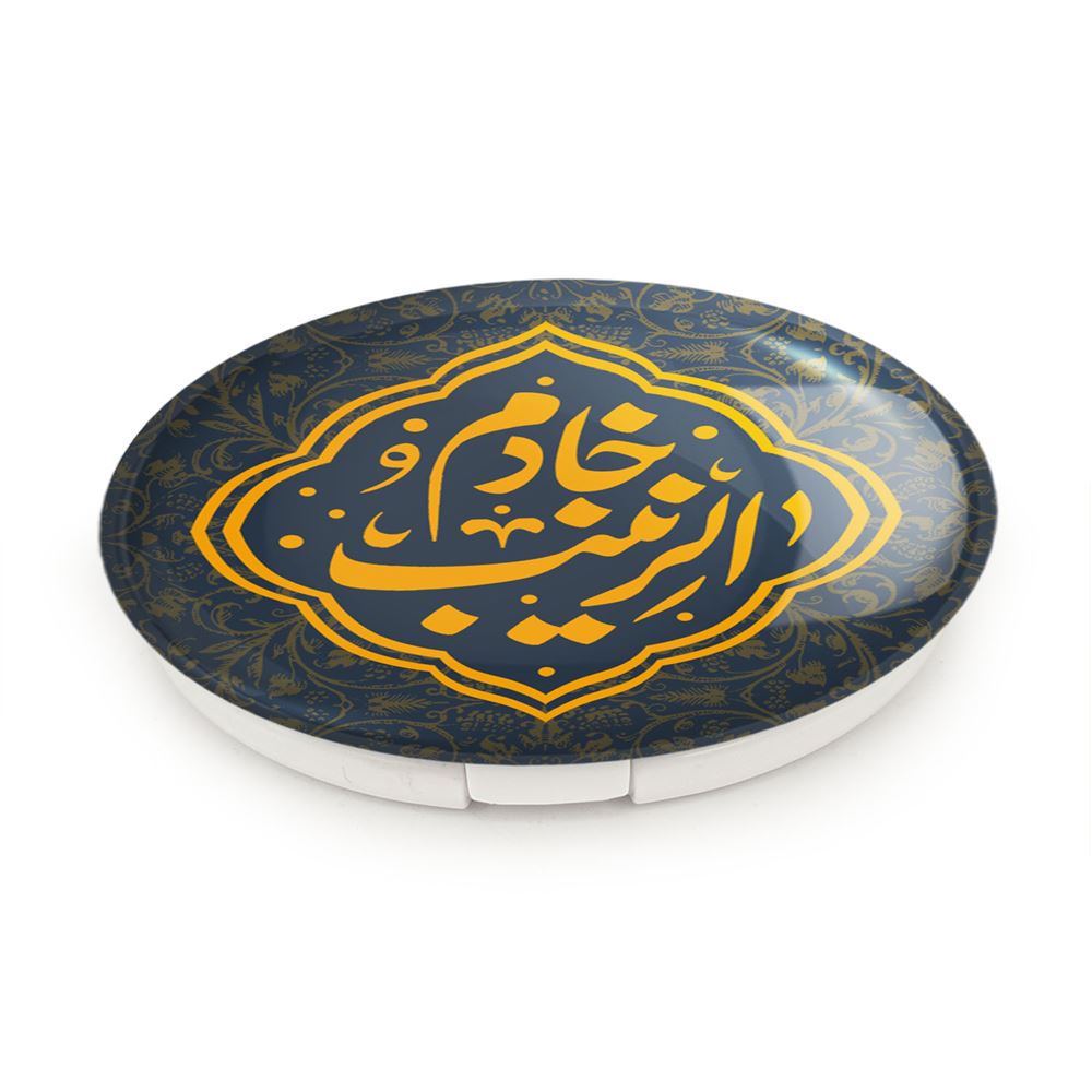 آینه های تاشو خادم الزینب خندالو، از جنس پلاستیک فشرده ABS تولید شده و به رنگ سفید می باشد. یکی از آینه ها ابعاد واقعی را نشان داده و دیگری با قابلیت بزرگنمایی، جزئیات را بهتر نمایش می دهد. ابعاد هر یک از آینه ها، دایره ای به قطر 7.5 سانت می باشد که نه خیلی بزرگ و غیر قابل استفاده در کیف آرایشی ست و نه خیلی کوچک که تصویر خاصی در آن مشاهده نشود. آینه تاشو خادم الزینب سایزی استاندارد و کارآمد دارد و در هر کیفی جا میگیرد. چاپ طرح بوسیله چاپگرهای دیجیتال شش رنگ با شفافیت و کیفیتی مثال زدنی بر روی یک وجه از بدنه ی آینه انجام گرفته و با روکش لمینت حرارتی پوشیده شده که در مقابل آسیب و خط و خش مقاوم بوده و کیفیت بالایی دارد. درب آینه بوسیله قفل بدنه ی آن، باز نمی ماند و کاملا بسته می شود و مناسب قرار گیری در کیف لوازم آرایش و کیف های کوچک دستی نیز هست. آینه های تاشو خادم الزینب خندالو با تنوع طرحی بسیار بالا، سلیقه هر نوع مخاطبی را تامین میکند.
