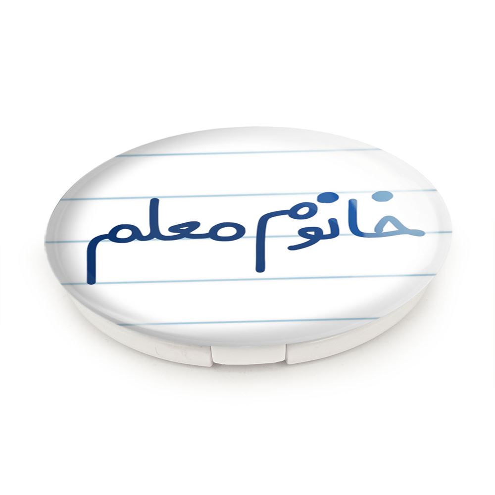 آینه های تاشو خانوم معلم خندالو، از جنس پلاستیک فشرده ABS تولید شده و به رنگ سفید می باشد. یکی از آینه ها ابعاد واقعی را نشان داده و دیگری با قابلیت بزرگنمایی، جزئیات را بهتر نمایش می دهد. ابعاد هر یک از آینه ها، دایره ای به قطر 7.5 سانت می باشد که نه خیلی بزرگ و غیر قابل استفاده در کیف آرایشی ست و نه خیلی کوچک که تصویر خاصی در آن مشاهده نشود. آینه تاشو خانوم معلم سایزی استاندارد و کارآمد دارد و در هر کیفی جا میگیرد. چاپ طرح بوسیله چاپگرهای دیجیتال شش رنگ با شفافیت و کیفیتی مثال زدنی بر روی یک وجه از بدنه ی آینه انجام گرفته و با روکش لمینت حرارتی پوشیده شده که در مقابل آسیب و خط و خش مقاوم بوده و کیفیت بالایی دارد. درب آینه بوسیله قفل بدنه ی آن، باز نمی ماند و کاملا بسته می شود و مناسب قرار گیری در کیف لوازم آرایش و کیف های کوچک دستی نیز هست. آینه های تاشو خانوم معلم خندالو با تنوع طرحی بسیار بالا، سلیقه هر نوع مخاطبی را تامین میکند.