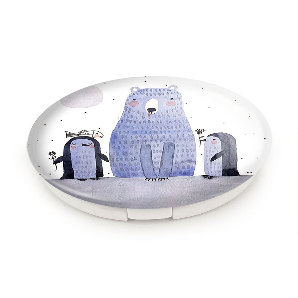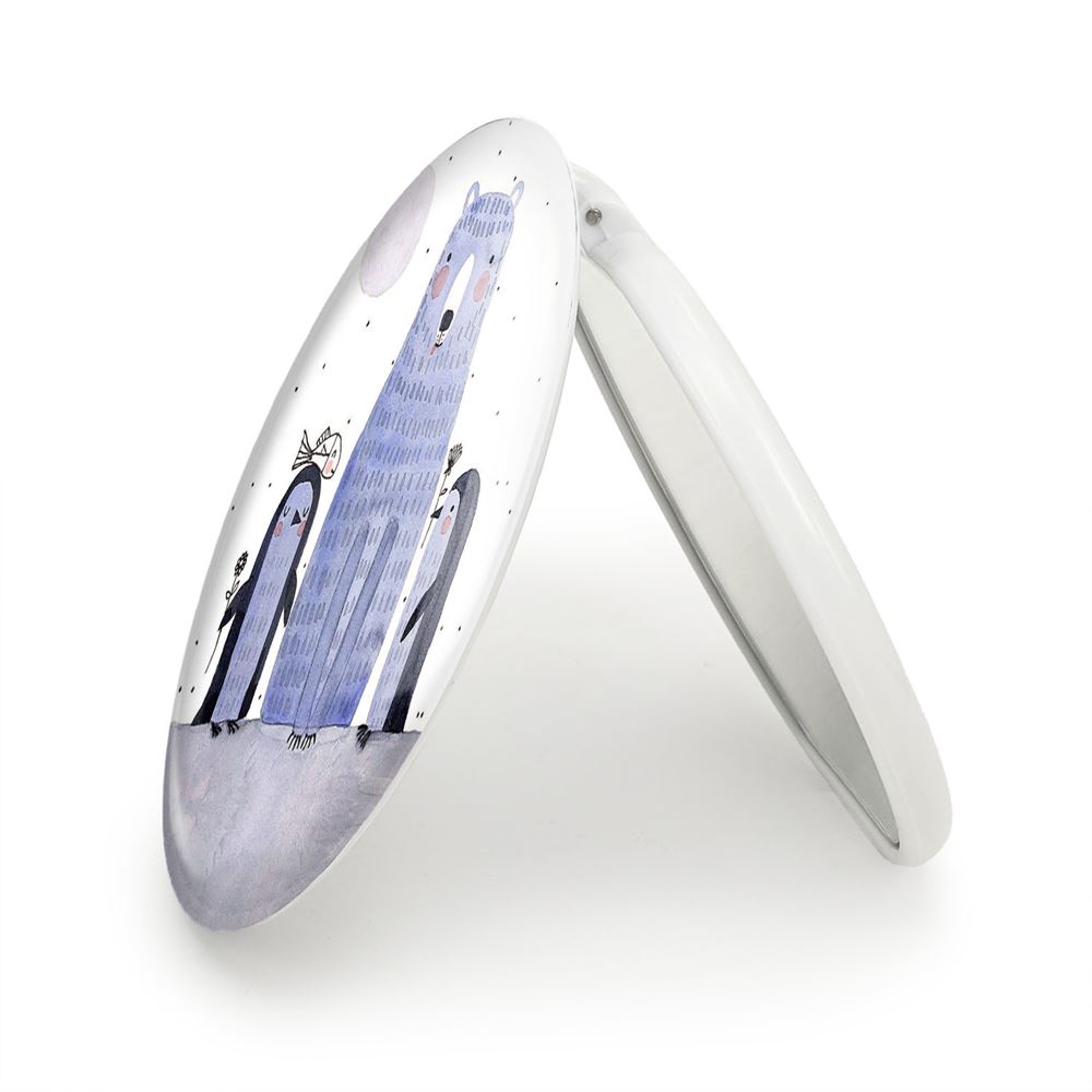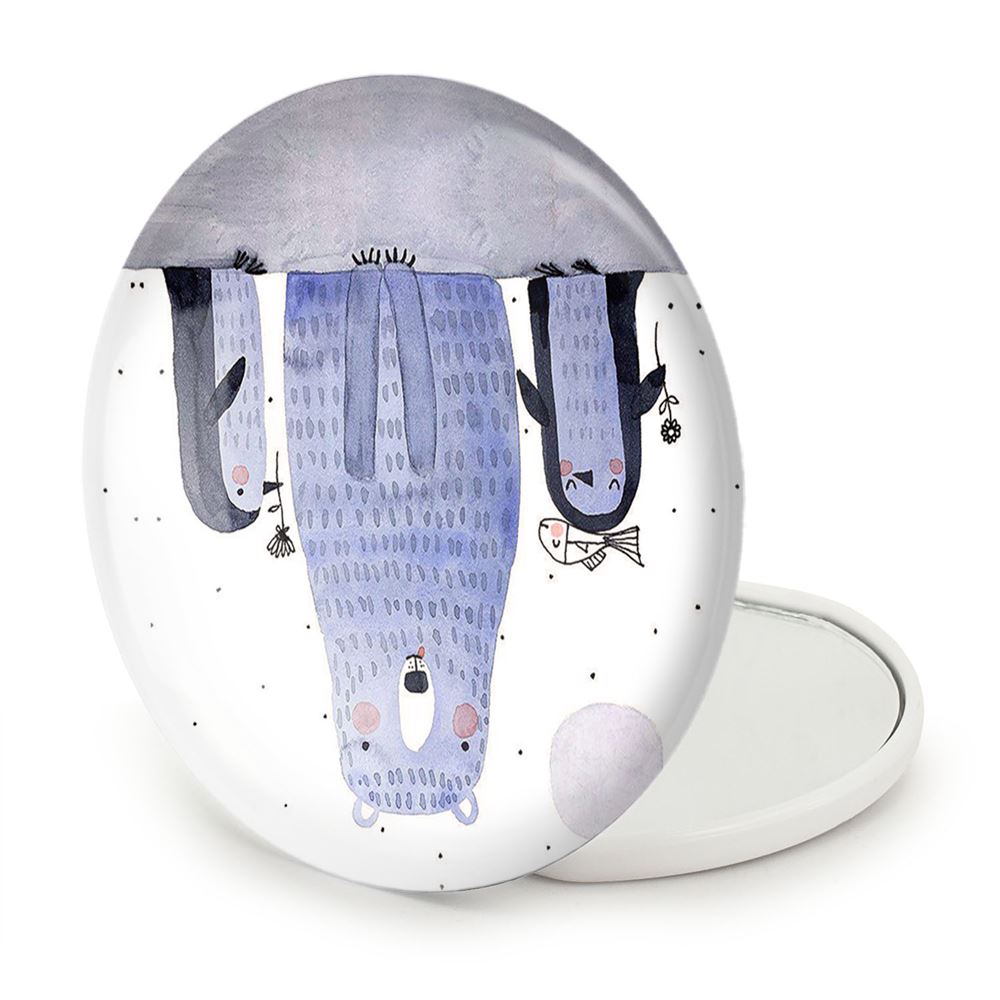 آینه های تاشو خرس و پنگوئن خندالو، از جنس پلاستیک فشرده ABS تولید شده و به رنگ سفید می باشد. یکی از آینه ها ابعاد واقعی را نشان داده و دیگری با قابلیت بزرگنمایی، جزئیات را بهتر نمایش می دهد. ابعاد هر یک از آینه ها، دایره ای به قطر 7.5 سانت می باشد که نه خیلی بزرگ و غیر قابل استفاده در کیف آرایشی ست و نه خیلی کوچک که تصویر خاصی در آن مشاهده نشود. آینه تاشو خرس و پنگوئن سایزی استاندارد و کارآمد دارد و در هر کیفی جا میگیرد. چاپ طرح بوسیله چاپگرهای دیجیتال شش رنگ با شفافیت و کیفیتی مثال زدنی بر روی یک وجه از بدنه ی آینه انجام گرفته و با روکش لمینت حرارتی پوشیده شده که در مقابل آسیب و خط و خش مقاوم بوده و کیفیت بالایی دارد. درب آینه بوسیله قفل بدنه ی آن، باز نمی ماند و کاملا بسته می شود و مناسب قرار گیری در کیف لوازم آرایش و کیف های کوچک دستی نیز هست. آینه های تاشو خرس و پنگوئن خندالو با تنوع طرحی بسیار بالا، سلیقه هر نوع مخاطبی را تامین میکند.