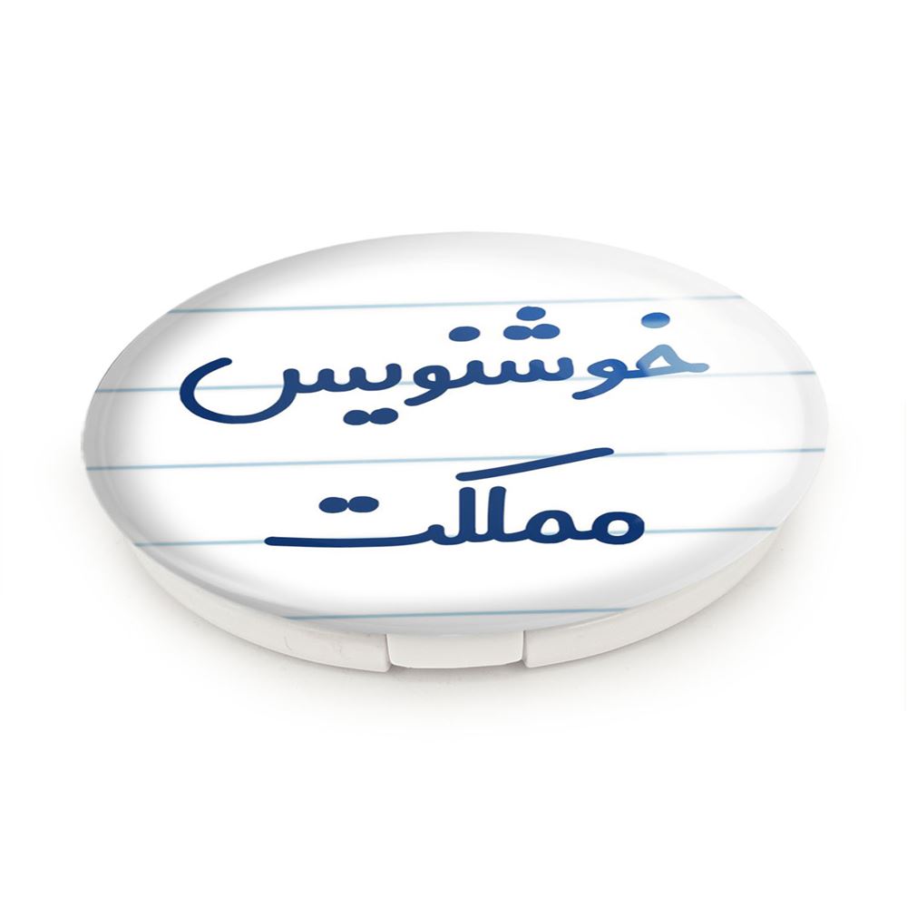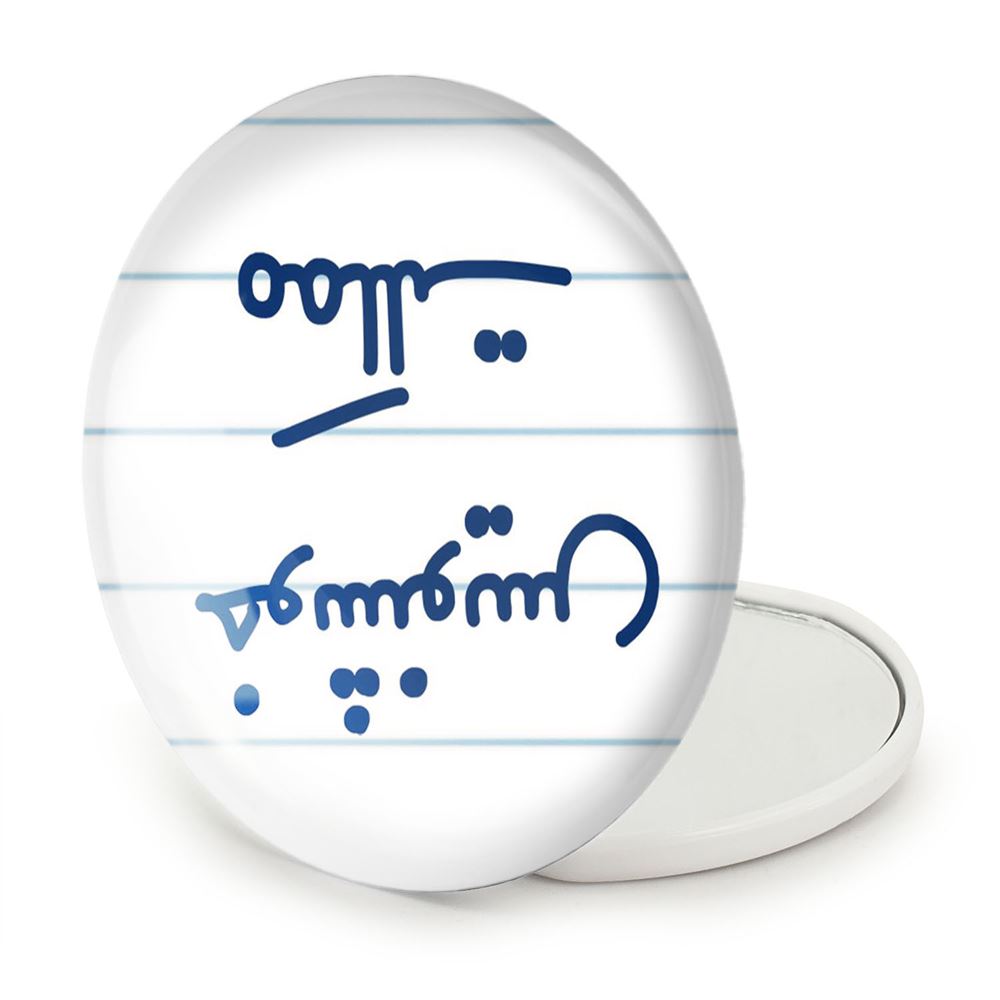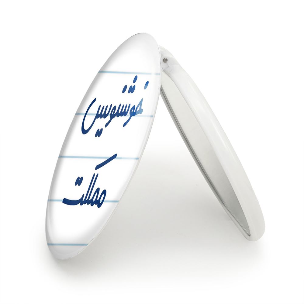 آینه های تاشو خوشنویس مملکت خندالو، از جنس پلاستیک فشرده ABS تولید شده و به رنگ سفید می باشد. یکی از آینه ها ابعاد واقعی را نشان داده و دیگری با قابلیت بزرگنمایی، جزئیات را بهتر نمایش می دهد. ابعاد هر یک از آینه ها، دایره ای به قطر 7.5 سانت می باشد که نه خیلی بزرگ و غیر قابل استفاده در کیف آرایشی ست و نه خیلی کوچک که تصویر خاصی در آن مشاهده نشود. آینه تاشو خوشنویس مملکت سایزی استاندارد و کارآمد دارد و در هر کیفی جا میگیرد. چاپ طرح بوسیله چاپگرهای دیجیتال شش رنگ با شفافیت و کیفیتی مثال زدنی بر روی یک وجه از بدنه ی آینه انجام گرفته و با روکش لمینت حرارتی پوشیده شده که در مقابل آسیب و خط و خش مقاوم بوده و کیفیت بالایی دارد. درب آینه بوسیله قفل بدنه ی آن، باز نمی ماند و کاملا بسته می شود و مناسب قرار گیری در کیف لوازم آرایش و کیف های کوچک دستی نیز هست. آینه های تاشو خوشنویس مملکت خندالو با تنوع طرحی بسیار بالا، سلیقه هر نوع مخاطبی را تامین میکند.