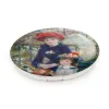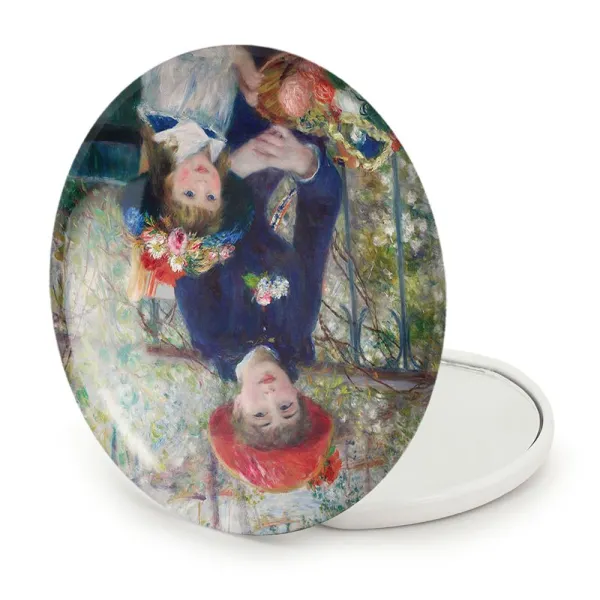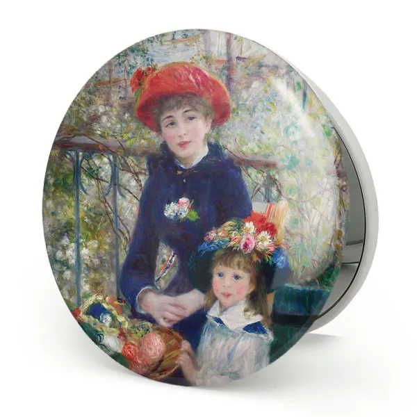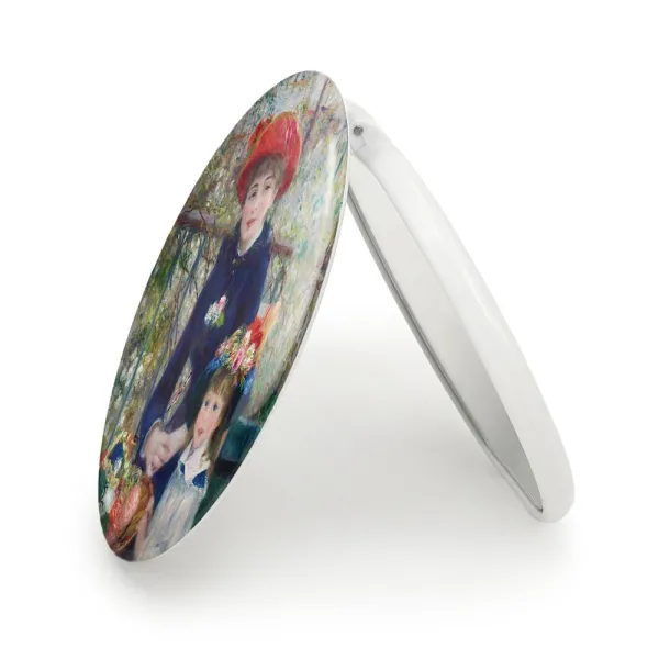 آینه های تاشو دو خواهر روی تراس رنوار خندالو، از جنس پلاستیک فشرده ABS تولید شده و به رنگ سفید می باشد. یکی از آینه ها ابعاد واقعی را نشان داده و دیگری با قابلیت بزرگنمایی، جزئیات را بهتر نمایش می دهد. ابعاد هر یک از آینه ها، دایره ای به قطر 7.5 سانت می باشد که نه خیلی بزرگ و غیر قابل استفاده در کیف آرایشی ست و نه خیلی کوچک که تصویر خاصی در آن مشاهده نشود. آینه تاشو دو خواهر روی تراس رنوار سایزی استاندارد و کارآمد دارد و در هر کیفی جا میگیرد. چاپ طرح بوسیله چاپگرهای دیجیتال شش رنگ با شفافیت و کیفیتی مثال زدنی بر روی یک وجه از بدنه ی آینه انجام گرفته و با روکش لمینت حرارتی پوشیده شده که در مقابل آسیب و خط و خش مقاوم بوده و کیفیت بالایی دارد. درب آینه بوسیله قفل بدنه ی آن، باز نمی ماند و کاملا بسته می شود و مناسب قرار گیری در کیف لوازم آرایش و کیف های کوچک دستی نیز هست. آینه های تاشو دو خواهر روی تراس رنوار خندالو با تنوع طرحی بسیار بالا، سلیقه هر نوع مخاطبی را تامین میکند.