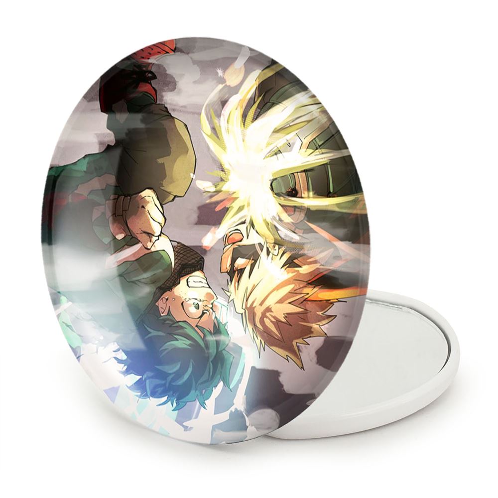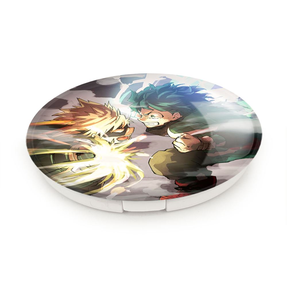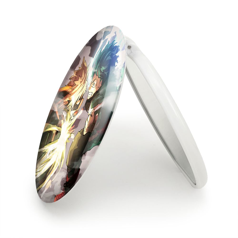 آینه های تاشو دکو و باکوگو انیمه آکادمی قهرمان من My Hero Academia خندالو، از جنس پلاستیک فشرده ABS تولید شده و به رنگ سفید می باشد. یکی از آینه ها ابعاد واقعی را نشان داده و دیگری با قابلیت بزرگنمایی، جزئیات را بهتر نمایش می دهد. ابعاد هر یک از آینه ها، دایره ای به قطر 7.5 سانت می باشد که نه خیلی بزرگ و غیر قابل استفاده در کیف آرایشی ست و نه خیلی کوچک که تصویر خاصی در آن مشاهده نشود. آینه تاشو دکو و باکوگو انیمه آکادمی قهرمان من My Hero Academia سایزی استاندارد و کارآمد دارد و در هر کیفی جا میگیرد. چاپ طرح بوسیله چاپگرهای دیجیتال شش رنگ با شفافیت و کیفیتی مثال زدنی بر روی یک وجه از بدنه ی آینه انجام گرفته و با روکش لمینت حرارتی پوشیده شده که در مقابل آسیب و خط و خش مقاوم بوده و کیفیت بالایی دارد. درب آینه بوسیله قفل بدنه ی آن، باز نمی ماند و کاملا بسته می شود و مناسب قرار گیری در کیف لوازم آرایش و کیف های کوچک دستی نیز هست. آینه های تاشو دکو و باکوگو انیمه آکادمی قهرمان من My Hero Academia خندالو با تنوع طرحی بسیار بالا، سلیقه هر نوع مخاطبی را تامین میکند.