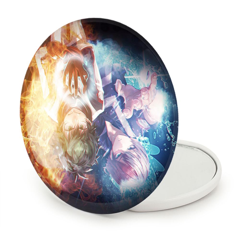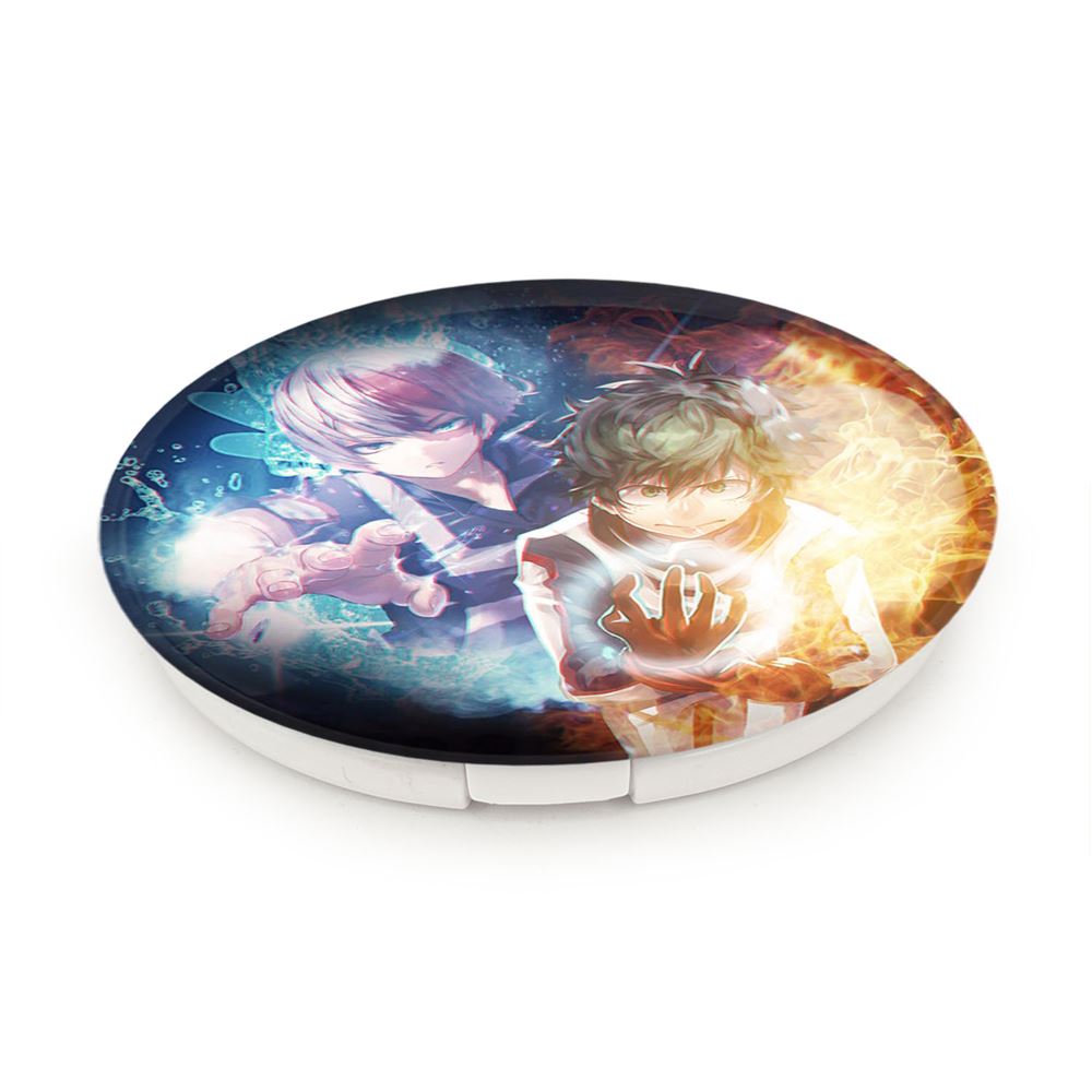 آینه های تاشو دکو و شوتو انیمه آکادمی قهرمان من My Hero Academia خندالو، از جنس پلاستیک فشرده ABS تولید شده و به رنگ سفید می باشد. یکی از آینه ها ابعاد واقعی را نشان داده و دیگری با قابلیت بزرگنمایی، جزئیات را بهتر نمایش می دهد. ابعاد هر یک از آینه ها، دایره ای به قطر 7.5 سانت می باشد که نه خیلی بزرگ و غیر قابل استفاده در کیف آرایشی ست و نه خیلی کوچک که تصویر خاصی در آن مشاهده نشود. آینه تاشو دکو و شوتو انیمه آکادمی قهرمان من My Hero Academia سایزی استاندارد و کارآمد دارد و در هر کیفی جا میگیرد. چاپ طرح بوسیله چاپگرهای دیجیتال شش رنگ با شفافیت و کیفیتی مثال زدنی بر روی یک وجه از بدنه ی آینه انجام گرفته و با روکش لمینت حرارتی پوشیده شده که در مقابل آسیب و خط و خش مقاوم بوده و کیفیت بالایی دارد. درب آینه بوسیله قفل بدنه ی آن، باز نمی ماند و کاملا بسته می شود و مناسب قرار گیری در کیف لوازم آرایش و کیف های کوچک دستی نیز هست. آینه های تاشو دکو و شوتو انیمه آکادمی قهرمان من My Hero Academia خندالو با تنوع طرحی بسیار بالا، سلیقه هر نوع مخاطبی را تامین میکند.