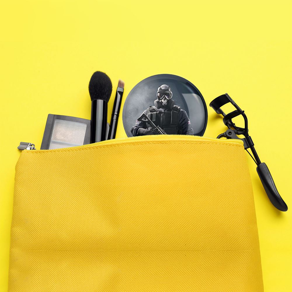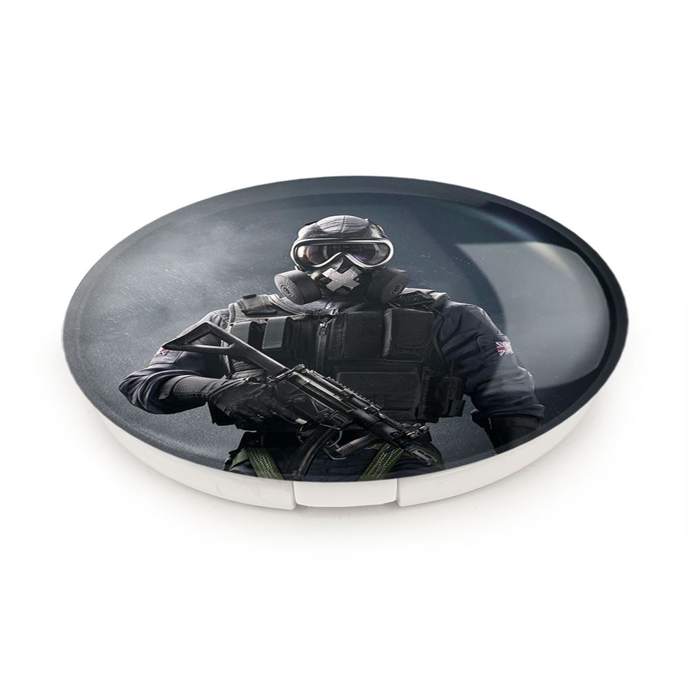 آینه های تاشو رینبو سیکس Rainbow Six خندالو، از جنس پلاستیک فشرده ABS تولید شده و به رنگ سفید می باشد. یکی از آینه ها ابعاد واقعی را نشان داده و دیگری با قابلیت بزرگنمایی، جزئیات را بهتر نمایش می دهد. ابعاد هر یک از آینه ها، دایره ای به قطر 7.5 سانت می باشد که نه خیلی بزرگ و غیر قابل استفاده در کیف آرایشی ست و نه خیلی کوچک که تصویر خاصی در آن مشاهده نشود. آینه تاشو رینبو سیکس Rainbow Six سایزی استاندارد و کارآمد دارد و در هر کیفی جا میگیرد. چاپ طرح بوسیله چاپگرهای دیجیتال شش رنگ با شفافیت و کیفیتی مثال زدنی بر روی یک وجه از بدنه ی آینه انجام گرفته و با روکش لمینت حرارتی پوشیده شده که در مقابل آسیب و خط و خش مقاوم بوده و کیفیت بالایی دارد. درب آینه بوسیله قفل بدنه ی آن، باز نمی ماند و کاملا بسته می شود و مناسب قرار گیری در کیف لوازم آرایش و کیف های کوچک دستی نیز هست. آینه های تاشو رینبو سیکس Rainbow Six خندالو با تنوع طرحی بسیار بالا، سلیقه هر نوع مخاطبی را تامین میکند.