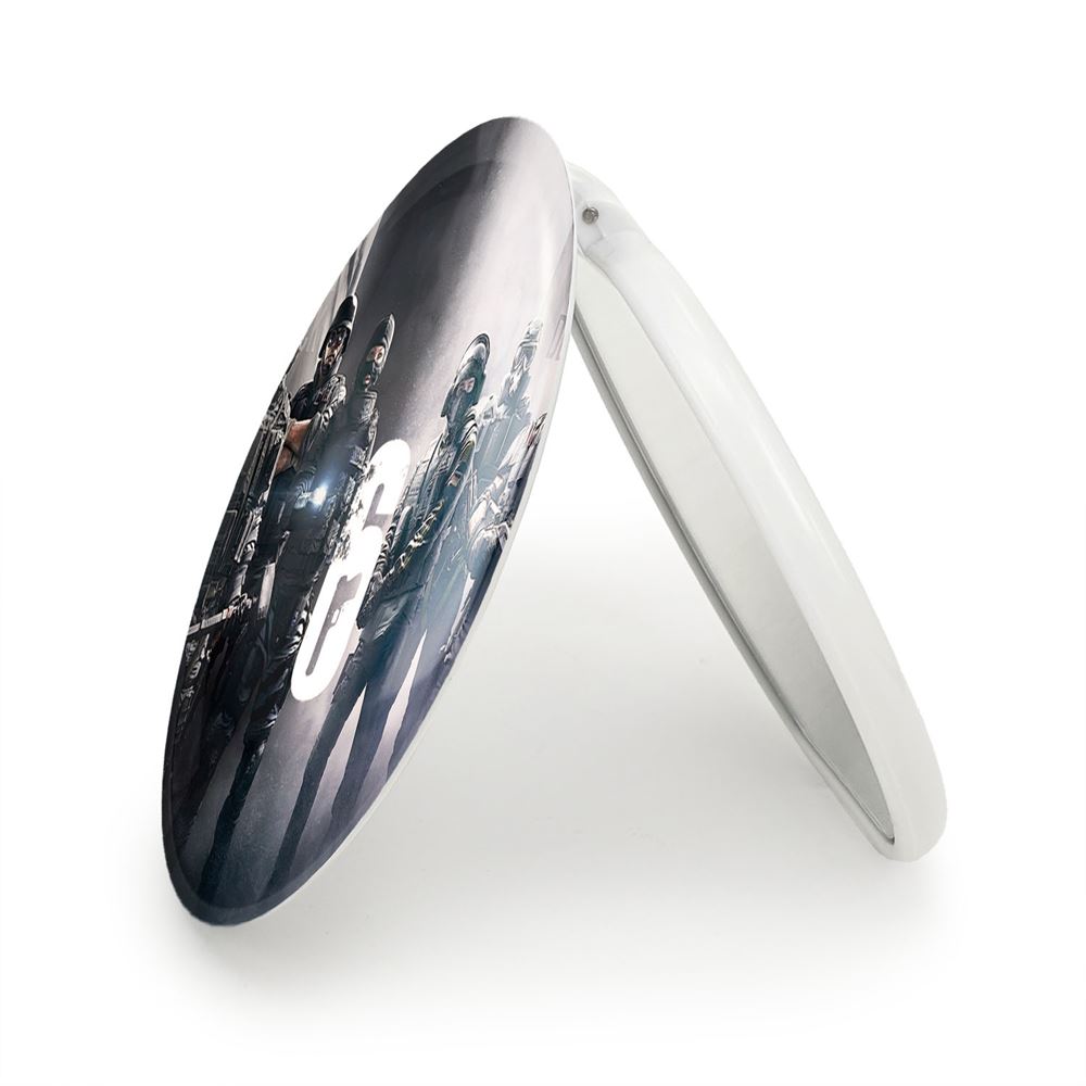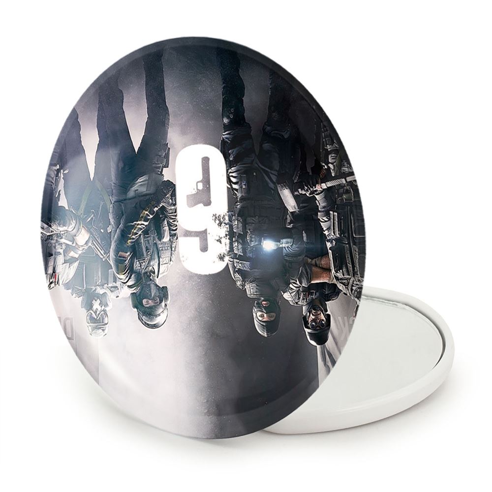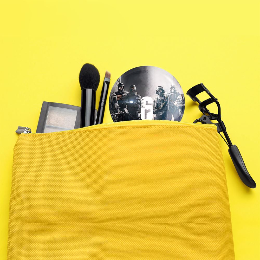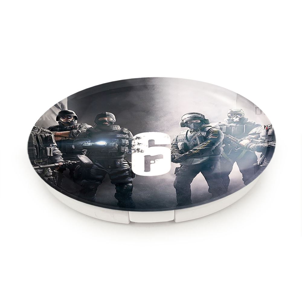 آینه های تاشو رینبو سیکس Rainbow Six خندالو، از جنس پلاستیک فشرده ABS تولید شده و به رنگ سفید می باشد. یکی از آینه ها ابعاد واقعی را نشان داده و دیگری با قابلیت بزرگنمایی، جزئیات را بهتر نمایش می دهد. ابعاد هر یک از آینه ها، دایره ای به قطر 7.5 سانت می باشد که نه خیلی بزرگ و غیر قابل استفاده در کیف آرایشی ست و نه خیلی کوچک که تصویر خاصی در آن مشاهده نشود. آینه تاشو رینبو سیکس Rainbow Six سایزی استاندارد و کارآمد دارد و در هر کیفی جا میگیرد. چاپ طرح بوسیله چاپگرهای دیجیتال شش رنگ با شفافیت و کیفیتی مثال زدنی بر روی یک وجه از بدنه ی آینه انجام گرفته و با روکش لمینت حرارتی پوشیده شده که در مقابل آسیب و خط و خش مقاوم بوده و کیفیت بالایی دارد. درب آینه بوسیله قفل بدنه ی آن، باز نمی ماند و کاملا بسته می شود و مناسب قرار گیری در کیف لوازم آرایش و کیف های کوچک دستی نیز هست. آینه های تاشو رینبو سیکس Rainbow Six خندالو با تنوع طرحی بسیار بالا، سلیقه هر نوع مخاطبی را تامین میکند.