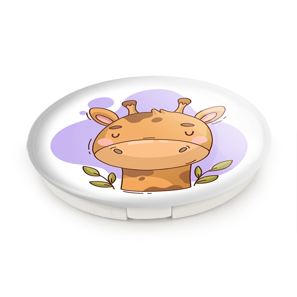 آینه های تاشو زرافه حیوانات بامزه خندالو، از جنس پلاستیک فشرده ABS تولید شده و به رنگ سفید می باشد. یکی از آینه ها ابعاد واقعی را نشان داده و دیگری با قابلیت بزرگنمایی، جزئیات را بهتر نمایش می دهد. ابعاد هر یک از آینه ها، دایره ای به قطر 7.5 سانت می باشد که نه خیلی بزرگ و غیر قابل استفاده در کیف آرایشی ست و نه خیلی کوچک که تصویر خاصی در آن مشاهده نشود. آینه تاشو زرافه حیوانات بامزه سایزی استاندارد و کارآمد دارد و در هر کیفی جا میگیرد. چاپ طرح بوسیله چاپگرهای دیجیتال شش رنگ با شفافیت و کیفیتی مثال زدنی بر روی یک وجه از بدنه ی آینه انجام گرفته و با روکش لمینت حرارتی پوشیده شده که در مقابل آسیب و خط و خش مقاوم بوده و کیفیت بالایی دارد. درب آینه بوسیله قفل بدنه ی آن، باز نمی ماند و کاملا بسته می شود و مناسب قرار گیری در کیف لوازم آرایش و کیف های کوچک دستی نیز هست. آینه های تاشو زرافه حیوانات بامزه خندالو با تنوع طرحی بسیار بالا، سلیقه هر نوع مخاطبی را تامین میکند.