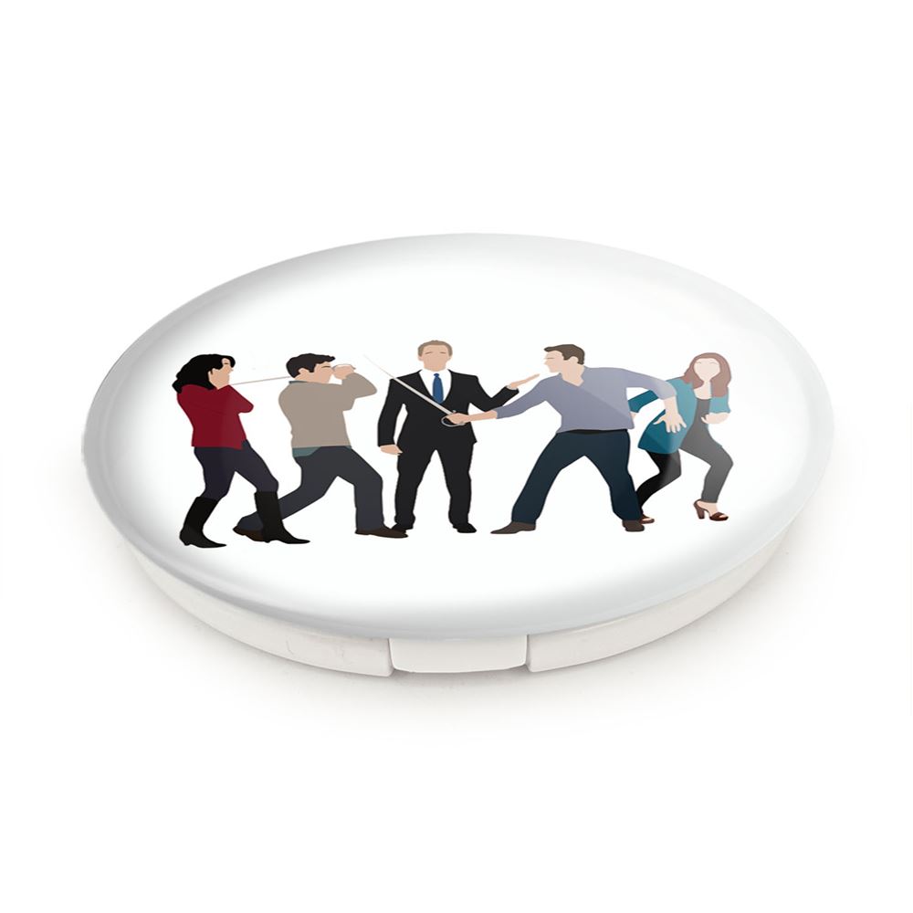 آینه های تاشو سریال آشنایی با مادر How I Met Your Mother خندالو، از جنس پلاستیک فشرده ABS تولید شده و به رنگ سفید می باشد. یکی از آینه ها ابعاد واقعی را نشان داده و دیگری با قابلیت بزرگنمایی، جزئیات را بهتر نمایش می دهد. ابعاد هر یک از آینه ها، دایره ای به قطر 7.5 سانت می باشد که نه خیلی بزرگ و غیر قابل استفاده در کیف آرایشی ست و نه خیلی کوچک که تصویر خاصی در آن مشاهده نشود. آینه تاشو سریال آشنایی با مادر How I Met Your Mother سایزی استاندارد و کارآمد دارد و در هر کیفی جا میگیرد. چاپ طرح بوسیله چاپگرهای دیجیتال شش رنگ با شفافیت و کیفیتی مثال زدنی بر روی یک وجه از بدنه ی آینه انجام گرفته و با روکش لمینت حرارتی پوشیده شده که در مقابل آسیب و خط و خش مقاوم بوده و کیفیت بالایی دارد. درب آینه بوسیله قفل بدنه ی آن، باز نمی ماند و کاملا بسته می شود و مناسب قرار گیری در کیف لوازم آرایش و کیف های کوچک دستی نیز هست. آینه های تاشو سریال آشنایی با مادر How I Met Your Mother خندالو با تنوع طرحی بسیار بالا، سلیقه هر نوع مخاطبی را تامین میکند.