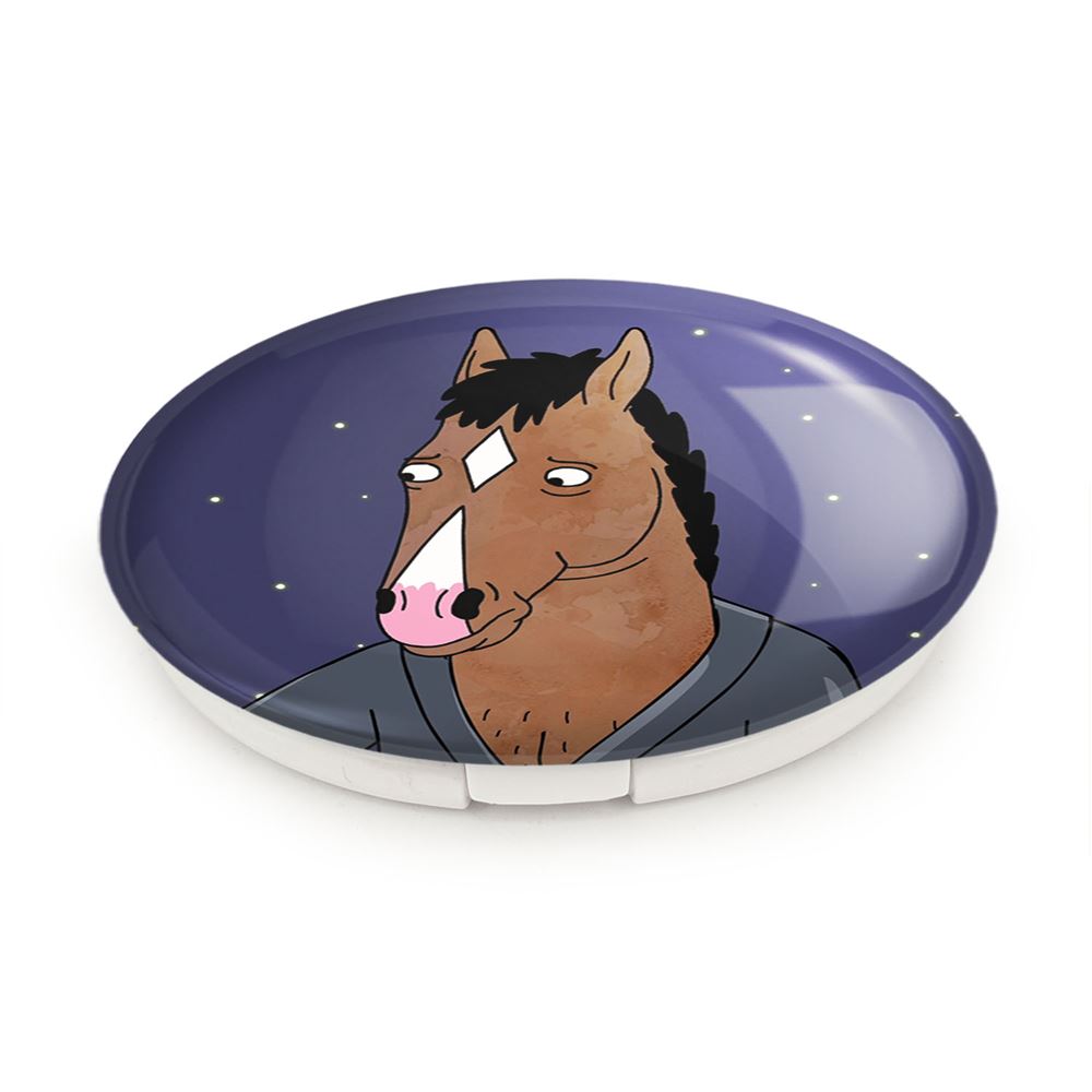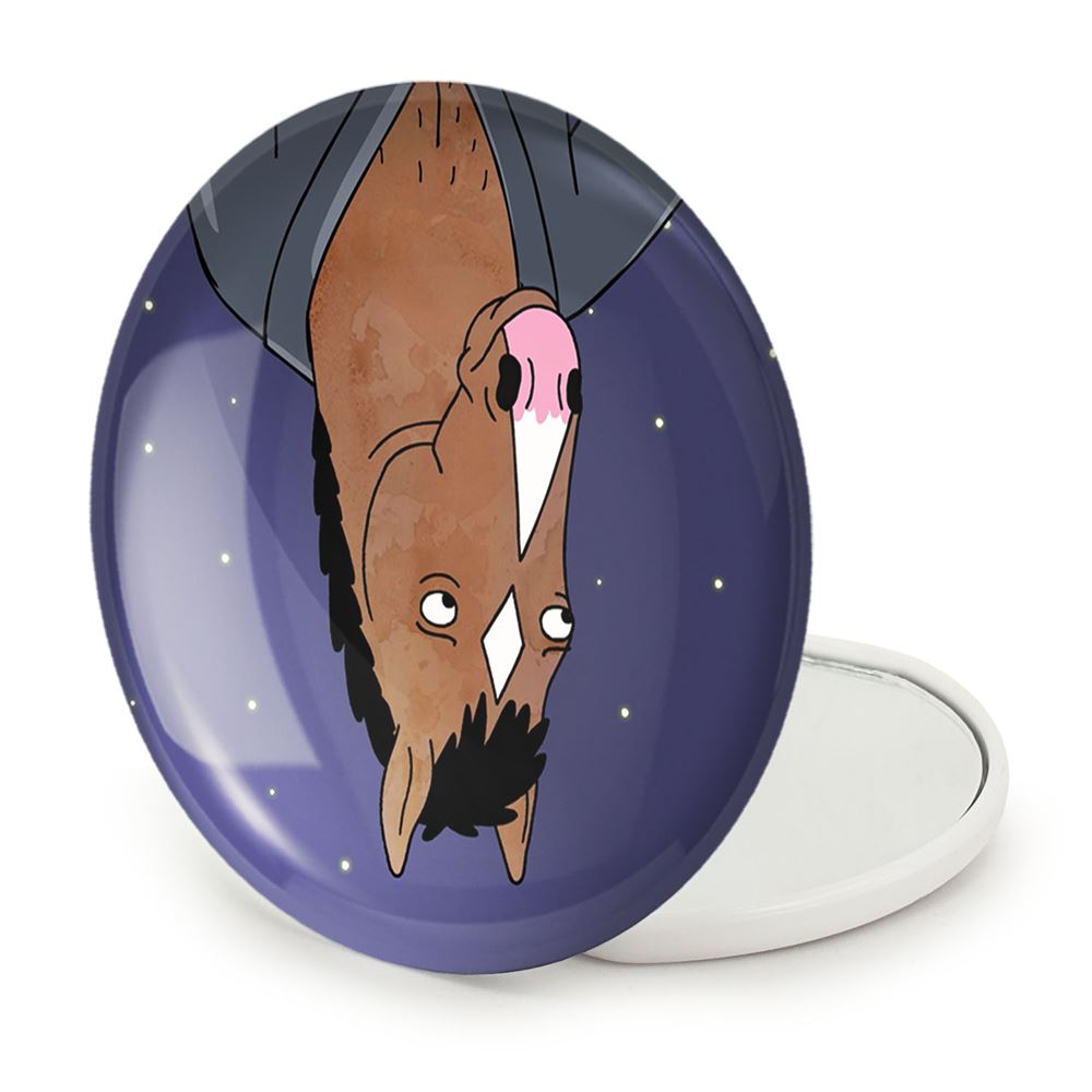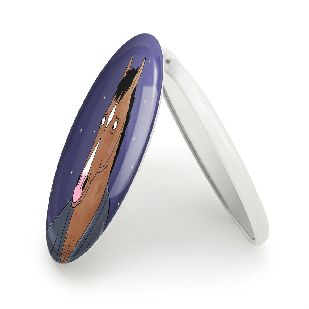 آینه های تاشو سریال بوجک هورسمن Bojack Horseman خندالو، از جنس پلاستیک فشرده ABS تولید شده و به رنگ سفید می باشد. یکی از آینه ها ابعاد واقعی را نشان داده و دیگری با قابلیت بزرگنمایی، جزئیات را بهتر نمایش می دهد. ابعاد هر یک از آینه ها، دایره ای به قطر 7.5 سانت می باشد که نه خیلی بزرگ و غیر قابل استفاده در کیف آرایشی ست و نه خیلی کوچک که تصویر خاصی در آن مشاهده نشود. آینه تاشو سریال بوجک هورسمن Bojack Horseman سایزی استاندارد و کارآمد دارد و در هر کیفی جا میگیرد. چاپ طرح بوسیله چاپگرهای دیجیتال شش رنگ با شفافیت و کیفیتی مثال زدنی بر روی یک وجه از بدنه ی آینه انجام گرفته و با روکش لمینت حرارتی پوشیده شده که در مقابل آسیب و خط و خش مقاوم بوده و کیفیت بالایی دارد. درب آینه بوسیله قفل بدنه ی آن، باز نمی ماند و کاملا بسته می شود و مناسب قرار گیری در کیف لوازم آرایش و کیف های کوچک دستی نیز هست. آینه های تاشو سریال بوجک هورسمن Bojack Horseman خندالو با تنوع طرحی بسیار بالا، سلیقه هر نوع مخاطبی را تامین میکند.