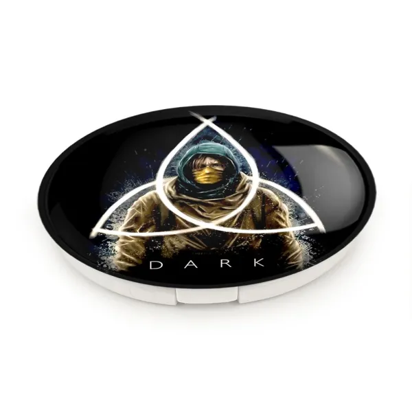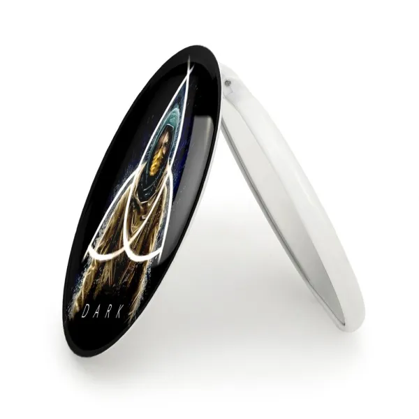 آینه های تاشو سریال دارک Dark خندالو، از جنس پلاستیک فشرده ABS تولید شده و به رنگ سفید می باشد. یکی از آینه ها ابعاد واقعی را نشان داده و دیگری با قابلیت بزرگنمایی، جزئیات را بهتر نمایش می دهد. ابعاد هر یک از آینه ها، دایره ای به قطر 7.5 سانت می باشد که نه خیلی بزرگ و غیر قابل استفاده در کیف آرایشی ست و نه خیلی کوچک که تصویر خاصی در آن مشاهده نشود. آینه تاشو سریال دارک Dark سایزی استاندارد و کارآمد دارد و در هر کیفی جا میگیرد. چاپ طرح بوسیله چاپگرهای دیجیتال شش رنگ با شفافیت و کیفیتی مثال زدنی بر روی یک وجه از بدنه ی آینه انجام گرفته و با روکش لمینت حرارتی پوشیده شده که در مقابل آسیب و خط و خش مقاوم بوده و کیفیت بالایی دارد. درب آینه بوسیله قفل بدنه ی آن، باز نمی ماند و کاملا بسته می شود و مناسب قرار گیری در کیف لوازم آرایش و کیف های کوچک دستی نیز هست. آینه های تاشو سریال دارک Dark خندالو با تنوع طرحی بسیار بالا، سلیقه هر نوع مخاطبی را تامین میکند.