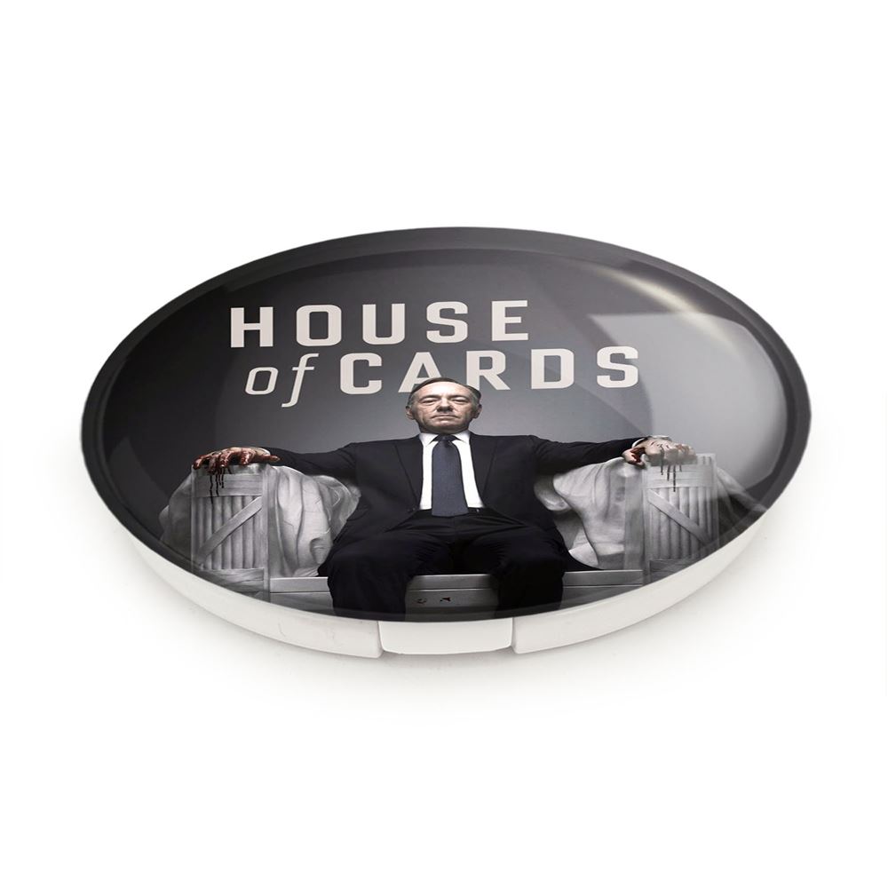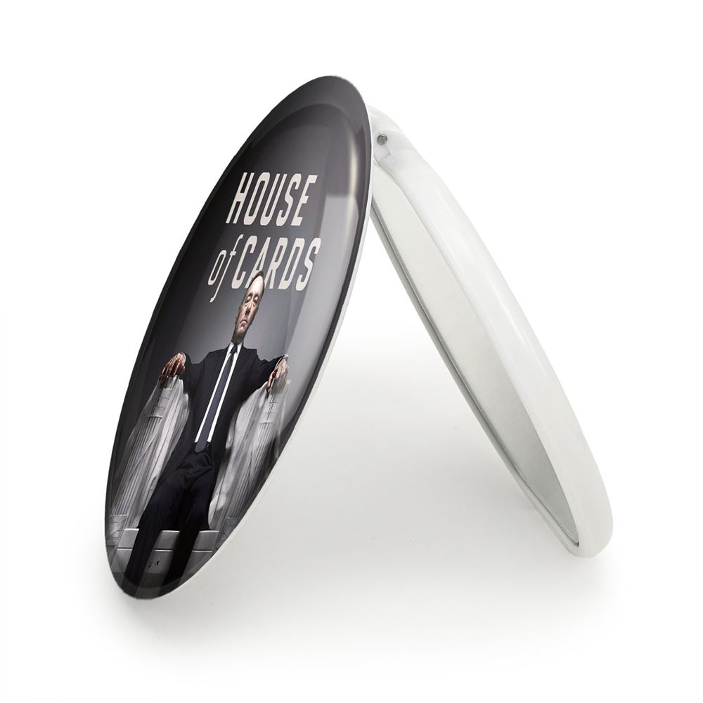 آینه های تاشو سریال House Of Cards خندالو، از جنس پلاستیک فشرده ABS تولید شده و به رنگ سفید می باشد. یکی از آینه ها ابعاد واقعی را نشان داده و دیگری با قابلیت بزرگنمایی، جزئیات را بهتر نمایش می دهد. ابعاد هر یک از آینه ها، دایره ای به قطر 7.5 سانت می باشد که نه خیلی بزرگ و غیر قابل استفاده در کیف آرایشی ست و نه خیلی کوچک که تصویر خاصی در آن مشاهده نشود. آینه تاشو سریال House Of Cards سایزی استاندارد و کارآمد دارد و در هر کیفی جا میگیرد. چاپ طرح بوسیله چاپگرهای دیجیتال شش رنگ با شفافیت و کیفیتی مثال زدنی بر روی یک وجه از بدنه ی آینه انجام گرفته و با روکش لمینت حرارتی پوشیده شده که در مقابل آسیب و خط و خش مقاوم بوده و کیفیت بالایی دارد. درب آینه بوسیله قفل بدنه ی آن، باز نمی ماند و کاملا بسته می شود و مناسب قرار گیری در کیف لوازم آرایش و کیف های کوچک دستی نیز هست. آینه های تاشو سریال House Of Cards خندالو با تنوع طرحی بسیار بالا، سلیقه هر نوع مخاطبی را تامین میکند.