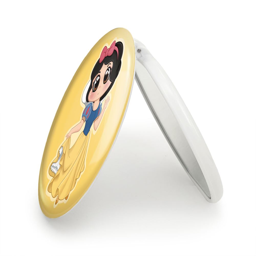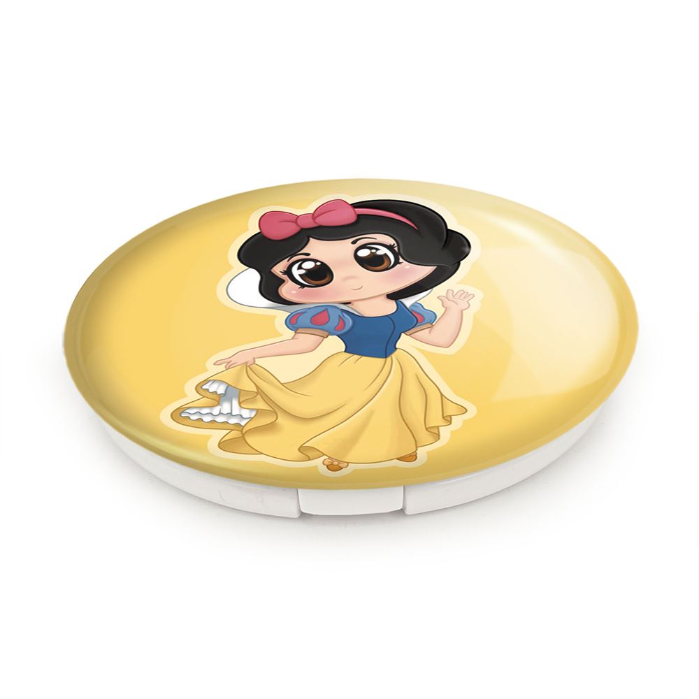 آینه های تاشو سفید برفی Snow White خندالو، از جنس پلاستیک فشرده ABS تولید شده و به رنگ سفید می باشد. یکی از آینه ها ابعاد واقعی را نشان داده و دیگری با قابلیت بزرگنمایی، جزئیات را بهتر نمایش می دهد. ابعاد هر یک از آینه ها، دایره ای به قطر 7.5 سانت می باشد که نه خیلی بزرگ و غیر قابل استفاده در کیف آرایشی ست و نه خیلی کوچک که تصویر خاصی در آن مشاهده نشود. آینه تاشو سفید برفی Snow White سایزی استاندارد و کارآمد دارد و در هر کیفی جا میگیرد. چاپ طرح بوسیله چاپگرهای دیجیتال شش رنگ با شفافیت و کیفیتی مثال زدنی بر روی یک وجه از بدنه ی آینه انجام گرفته و با روکش لمینت حرارتی پوشیده شده که در مقابل آسیب و خط و خش مقاوم بوده و کیفیت بالایی دارد. درب آینه بوسیله قفل بدنه ی آن، باز نمی ماند و کاملا بسته می شود و مناسب قرار گیری در کیف لوازم آرایش و کیف های کوچک دستی نیز هست. آینه های تاشو سفید برفی Snow White خندالو با تنوع طرحی بسیار بالا، سلیقه هر نوع مخاطبی را تامین میکند.