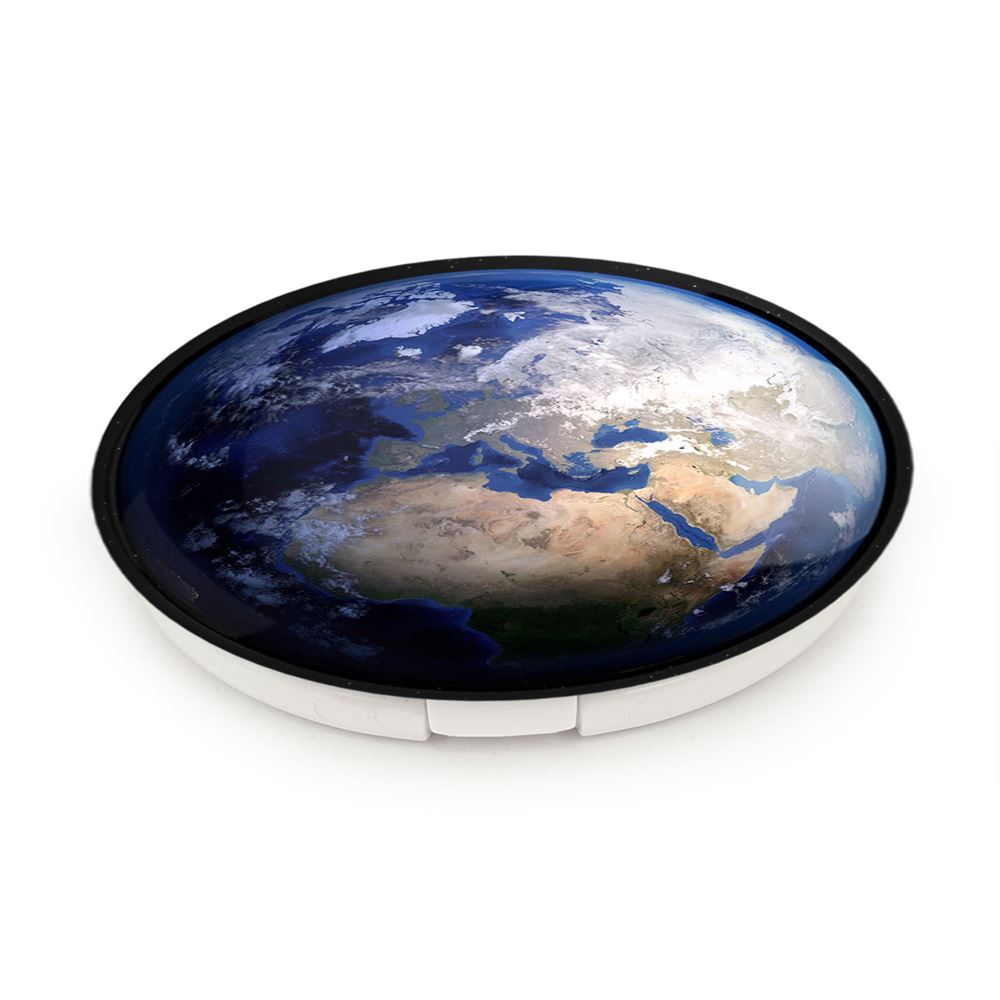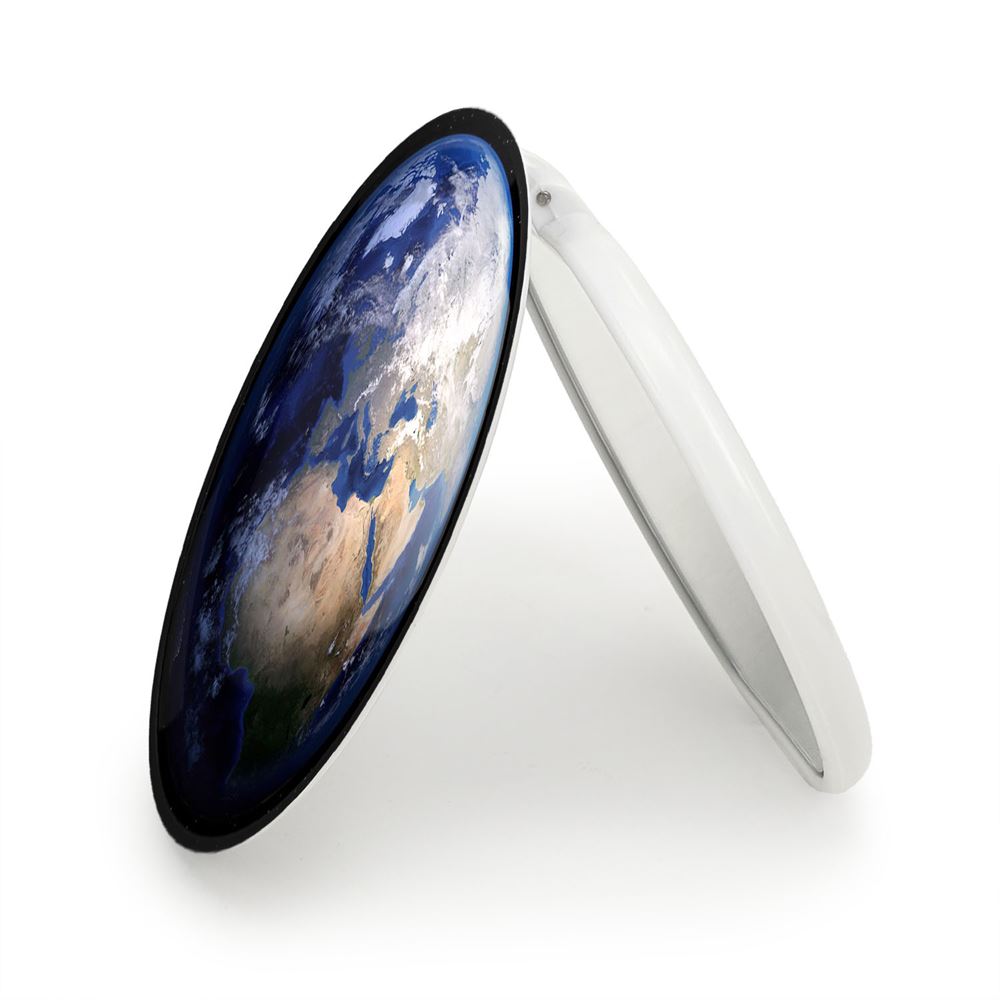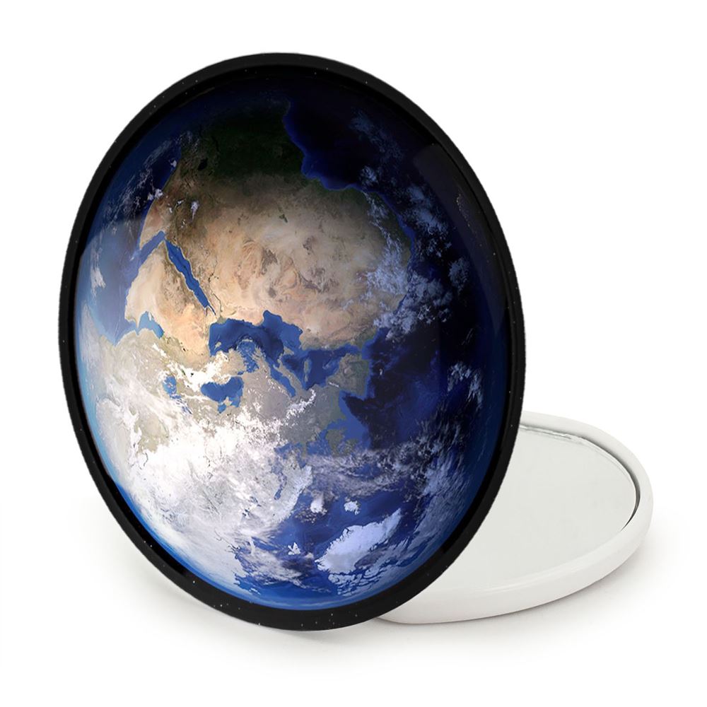 آینه های تاشو سیاره زمین خندالو، از جنس پلاستیک فشرده ABS تولید شده و به رنگ سفید می باشد. یکی از آینه ها ابعاد واقعی را نشان داده و دیگری با قابلیت بزرگنمایی، جزئیات را بهتر نمایش می دهد. ابعاد هر یک از آینه ها، دایره ای به قطر 7.5 سانت می باشد که نه خیلی بزرگ و غیر قابل استفاده در کیف آرایشی ست و نه خیلی کوچک که تصویر خاصی در آن مشاهده نشود. آینه تاشو سیاره زمین سایزی استاندارد و کارآمد دارد و در هر کیفی جا میگیرد. چاپ طرح بوسیله چاپگرهای دیجیتال شش رنگ با شفافیت و کیفیتی مثال زدنی بر روی یک وجه از بدنه ی آینه انجام گرفته و با روکش لمینت حرارتی پوشیده شده که در مقابل آسیب و خط و خش مقاوم بوده و کیفیت بالایی دارد. درب آینه بوسیله قفل بدنه ی آن، باز نمی ماند و کاملا بسته می شود و مناسب قرار گیری در کیف لوازم آرایش و کیف های کوچک دستی نیز هست. آینه های تاشو سیاره زمین خندالو با تنوع طرحی بسیار بالا، سلیقه هر نوع مخاطبی را تامین میکند.