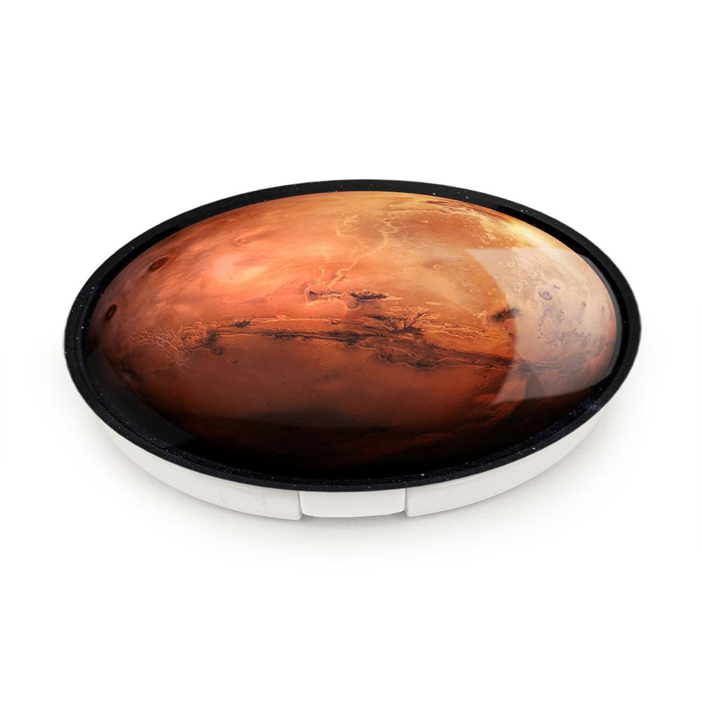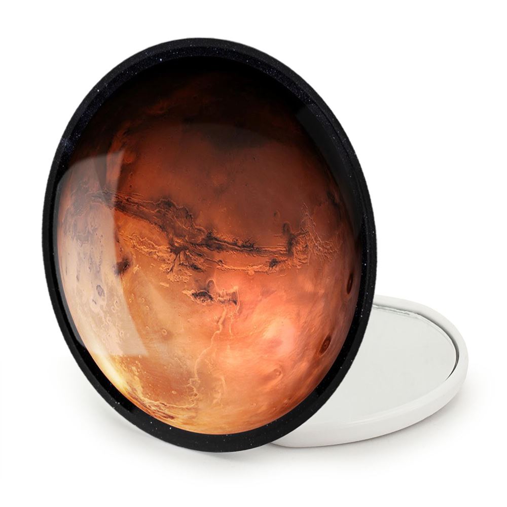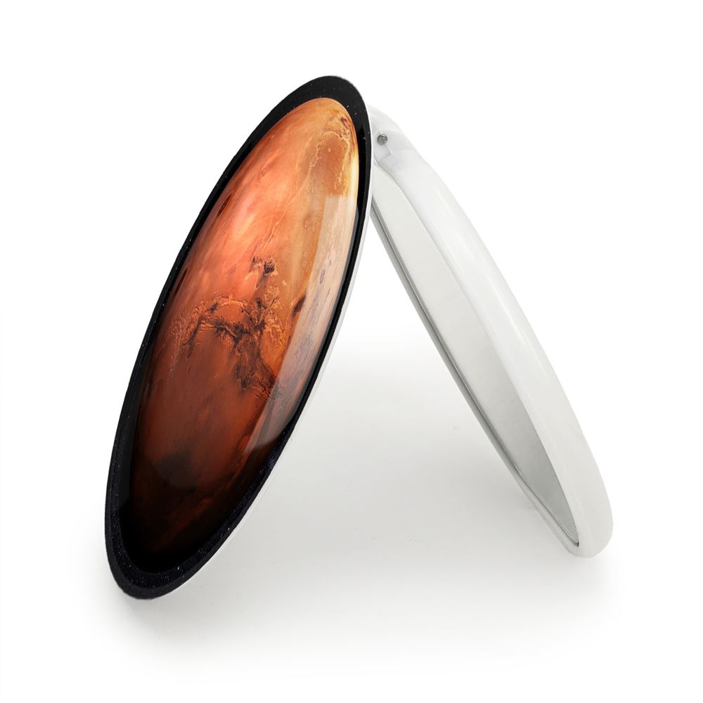 آینه های تاشو سیاره مریخ خندالو، از جنس پلاستیک فشرده ABS تولید شده و به رنگ سفید می باشد. یکی از آینه ها ابعاد واقعی را نشان داده و دیگری با قابلیت بزرگنمایی، جزئیات را بهتر نمایش می دهد. ابعاد هر یک از آینه ها، دایره ای به قطر 7.5 سانت می باشد که نه خیلی بزرگ و غیر قابل استفاده در کیف آرایشی ست و نه خیلی کوچک که تصویر خاصی در آن مشاهده نشود. آینه تاشو سیاره مریخ سایزی استاندارد و کارآمد دارد و در هر کیفی جا میگیرد. چاپ طرح بوسیله چاپگرهای دیجیتال شش رنگ با شفافیت و کیفیتی مثال زدنی بر روی یک وجه از بدنه ی آینه انجام گرفته و با روکش لمینت حرارتی پوشیده شده که در مقابل آسیب و خط و خش مقاوم بوده و کیفیت بالایی دارد. درب آینه بوسیله قفل بدنه ی آن، باز نمی ماند و کاملا بسته می شود و مناسب قرار گیری در کیف لوازم آرایش و کیف های کوچک دستی نیز هست. آینه های تاشو سیاره مریخ خندالو با تنوع طرحی بسیار بالا، سلیقه هر نوع مخاطبی را تامین میکند.