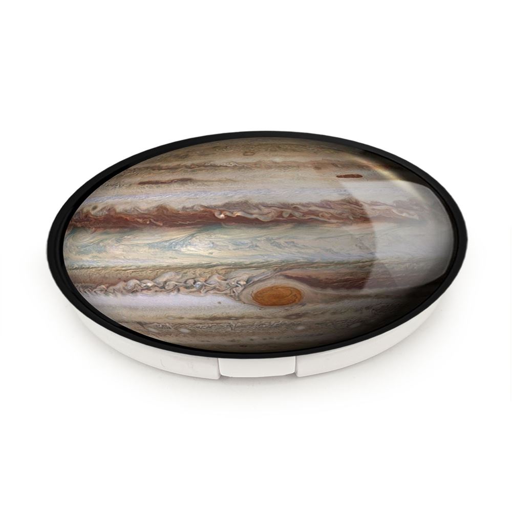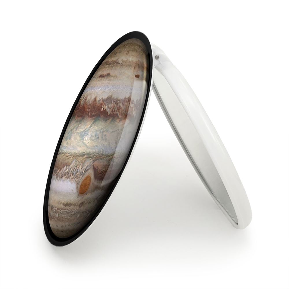 آینه های تاشو سیاره مشتری خندالو، از جنس پلاستیک فشرده ABS تولید شده و به رنگ سفید می باشد. یکی از آینه ها ابعاد واقعی را نشان داده و دیگری با قابلیت بزرگنمایی، جزئیات را بهتر نمایش می دهد. ابعاد هر یک از آینه ها، دایره ای به قطر 7.5 سانت می باشد که نه خیلی بزرگ و غیر قابل استفاده در کیف آرایشی ست و نه خیلی کوچک که تصویر خاصی در آن مشاهده نشود. آینه تاشو سیاره مشتری سایزی استاندارد و کارآمد دارد و در هر کیفی جا میگیرد. چاپ طرح بوسیله چاپگرهای دیجیتال شش رنگ با شفافیت و کیفیتی مثال زدنی بر روی یک وجه از بدنه ی آینه انجام گرفته و با روکش لمینت حرارتی پوشیده شده که در مقابل آسیب و خط و خش مقاوم بوده و کیفیت بالایی دارد. درب آینه بوسیله قفل بدنه ی آن، باز نمی ماند و کاملا بسته می شود و مناسب قرار گیری در کیف لوازم آرایش و کیف های کوچک دستی نیز هست. آینه های تاشو سیاره مشتری خندالو با تنوع طرحی بسیار بالا، سلیقه هر نوع مخاطبی را تامین میکند.