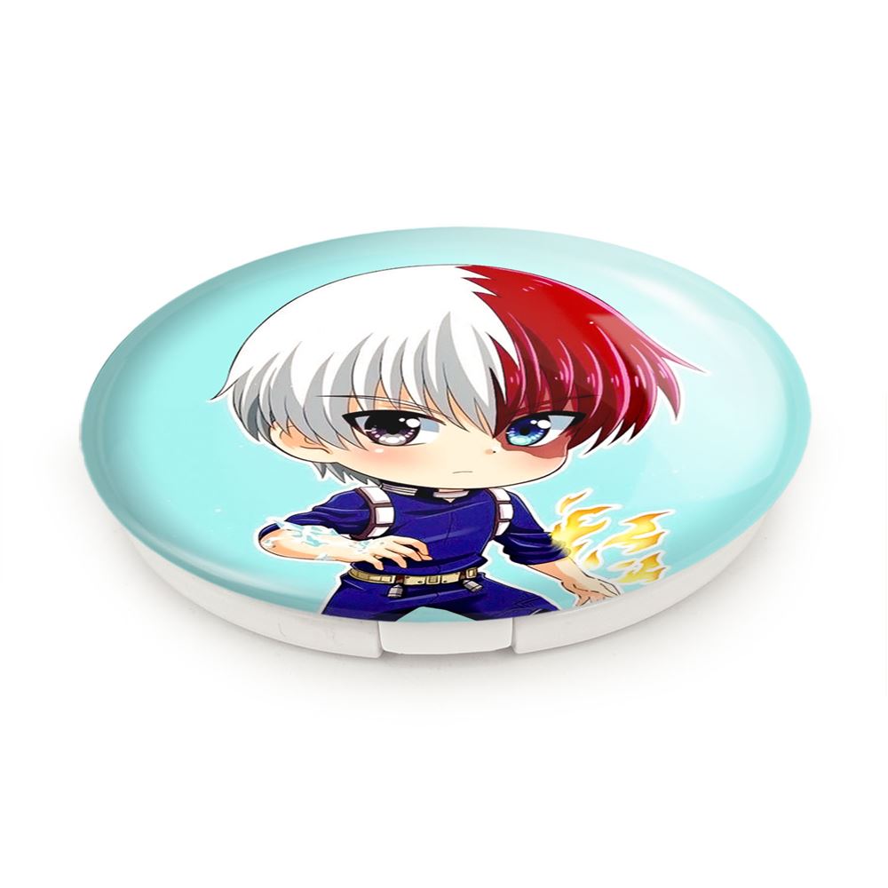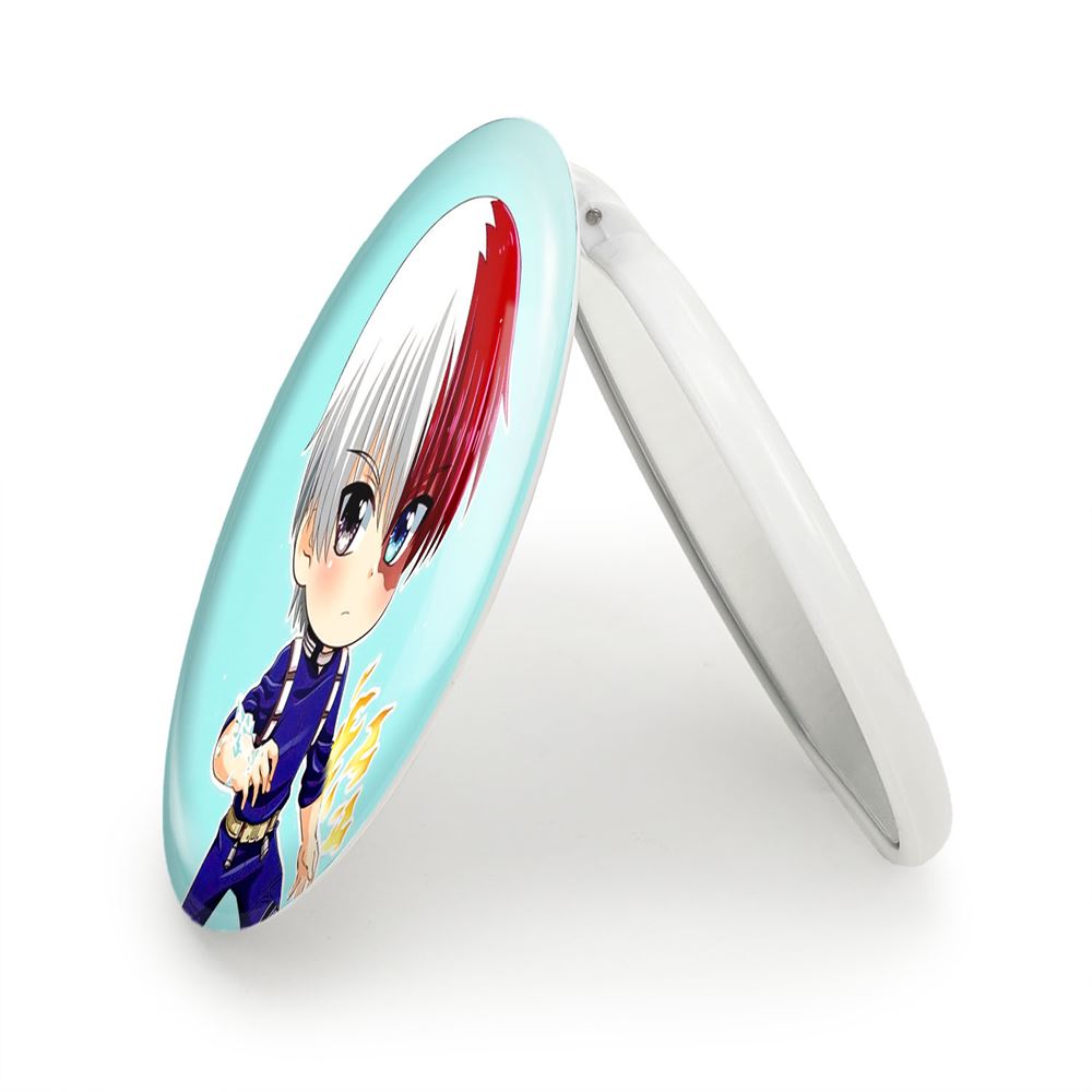 آینه های تاشو شوتو تودوروکی انیمه آکادمی قهرمان من My Hero Academia خندالو، از جنس پلاستیک فشرده ABS تولید شده و به رنگ سفید می باشد. یکی از آینه ها ابعاد واقعی را نشان داده و دیگری با قابلیت بزرگنمایی، جزئیات را بهتر نمایش می دهد. ابعاد هر یک از آینه ها، دایره ای به قطر 7.5 سانت می باشد که نه خیلی بزرگ و غیر قابل استفاده در کیف آرایشی ست و نه خیلی کوچک که تصویر خاصی در آن مشاهده نشود. آینه تاشو شوتو تودوروکی انیمه آکادمی قهرمان من My Hero Academia سایزی استاندارد و کارآمد دارد و در هر کیفی جا میگیرد. چاپ طرح بوسیله چاپگرهای دیجیتال شش رنگ با شفافیت و کیفیتی مثال زدنی بر روی یک وجه از بدنه ی آینه انجام گرفته و با روکش لمینت حرارتی پوشیده شده که در مقابل آسیب و خط و خش مقاوم بوده و کیفیت بالایی دارد. درب آینه بوسیله قفل بدنه ی آن، باز نمی ماند و کاملا بسته می شود و مناسب قرار گیری در کیف لوازم آرایش و کیف های کوچک دستی نیز هست. آینه های تاشو شوتو تودوروکی انیمه آکادمی قهرمان من My Hero Academia خندالو با تنوع طرحی بسیار بالا، سلیقه هر نوع مخاطبی را تامین میکند.