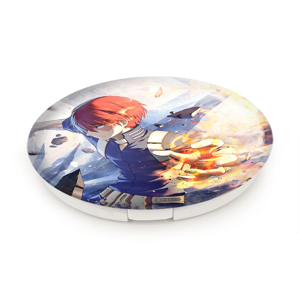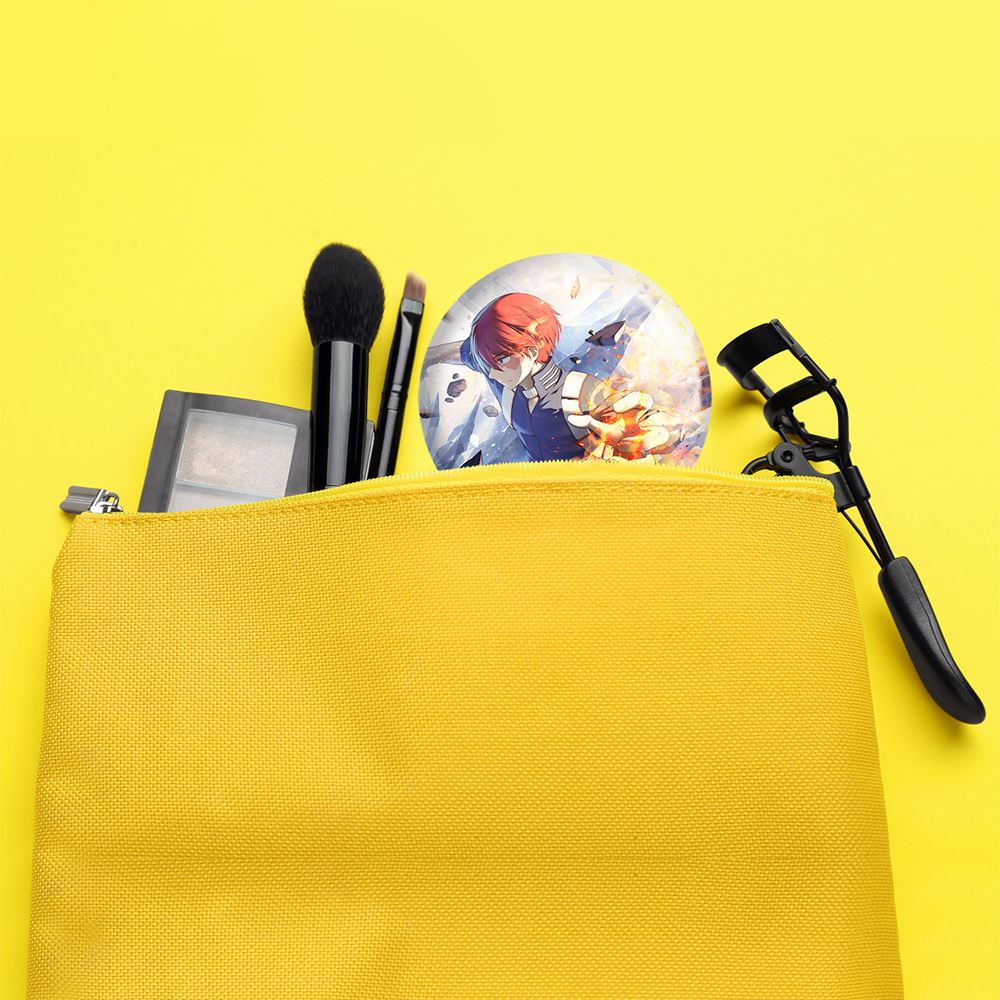 آینه های تاشو شوتو تودوروکی انیمه آکادمی قهرمان من خندالو، از جنس پلاستیک فشرده ABS تولید شده و به رنگ سفید می باشد. یکی از آینه ها ابعاد واقعی را نشان داده و دیگری با قابلیت بزرگنمایی، جزئیات را بهتر نمایش می دهد. ابعاد هر یک از آینه ها، دایره ای به قطر 7.5 سانت می باشد که نه خیلی بزرگ و غیر قابل استفاده در کیف آرایشی ست و نه خیلی کوچک که تصویر خاصی در آن مشاهده نشود. آینه تاشو شوتو تودوروکی انیمه آکادمی قهرمان من سایزی استاندارد و کارآمد دارد و در هر کیفی جا میگیرد. چاپ طرح بوسیله چاپگرهای دیجیتال شش رنگ با شفافیت و کیفیتی مثال زدنی بر روی یک وجه از بدنه ی آینه انجام گرفته و با روکش لمینت حرارتی پوشیده شده که در مقابل آسیب و خط و خش مقاوم بوده و کیفیت بالایی دارد. درب آینه بوسیله قفل بدنه ی آن، باز نمی ماند و کاملا بسته می شود و مناسب قرار گیری در کیف لوازم آرایش و کیف های کوچک دستی نیز هست. آینه های تاشو شوتو تودوروکی انیمه آکادمی قهرمان من خندالو با تنوع طرحی بسیار بالا، سلیقه هر نوع مخاطبی را تامین میکند.