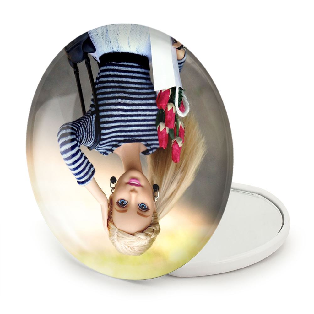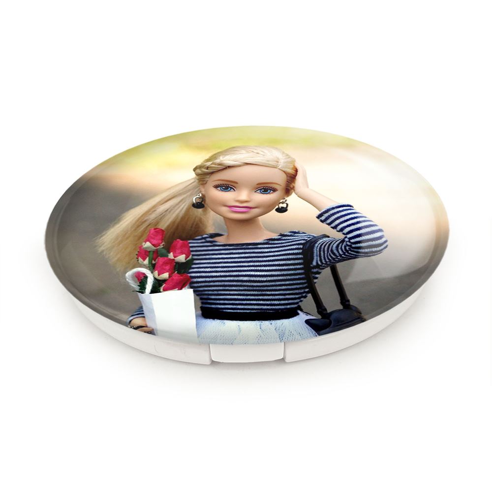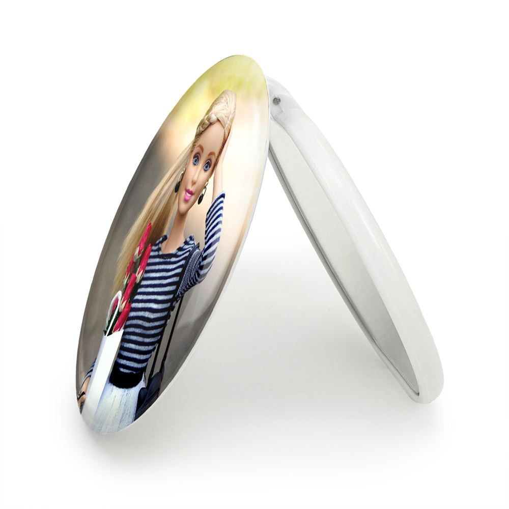 آینه های تاشو عروسک باربی خندالو، از جنس پلاستیک فشرده ABS تولید شده و به رنگ سفید می باشد. یکی از آینه ها ابعاد واقعی را نشان داده و دیگری با قابلیت بزرگنمایی، جزئیات را بهتر نمایش می دهد. ابعاد هر یک از آینه ها، دایره ای به قطر 7.5 سانت می باشد که نه خیلی بزرگ و غیر قابل استفاده در کیف آرایشی ست و نه خیلی کوچک که تصویر خاصی در آن مشاهده نشود. آینه تاشو عروسک باربی سایزی استاندارد و کارآمد دارد و در هر کیفی جا میگیرد. چاپ طرح بوسیله چاپگرهای دیجیتال شش رنگ با شفافیت و کیفیتی مثال زدنی بر روی یک وجه از بدنه ی آینه انجام گرفته و با روکش لمینت حرارتی پوشیده شده که در مقابل آسیب و خط و خش مقاوم بوده و کیفیت بالایی دارد. درب آینه بوسیله قفل بدنه ی آن، باز نمی ماند و کاملا بسته می شود و مناسب قرار گیری در کیف لوازم آرایش و کیف های کوچک دستی نیز هست. آینه های تاشو عروسک باربی خندالو با تنوع طرحی بسیار بالا، سلیقه هر نوع مخاطبی را تامین میکند.