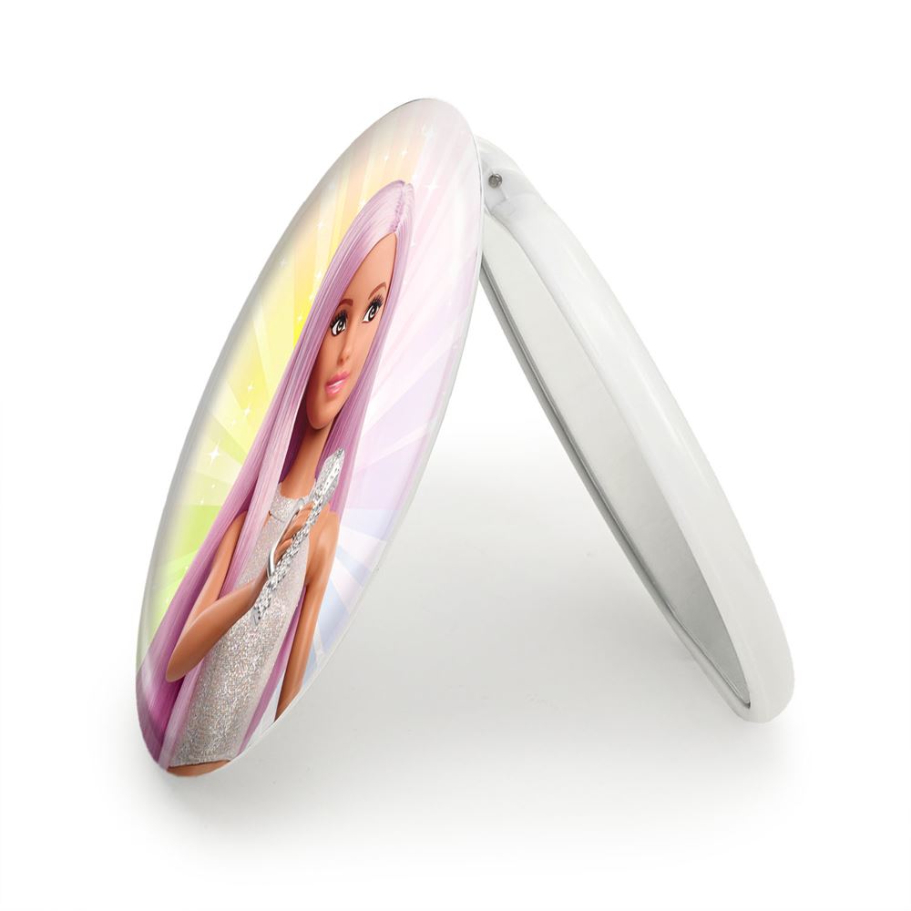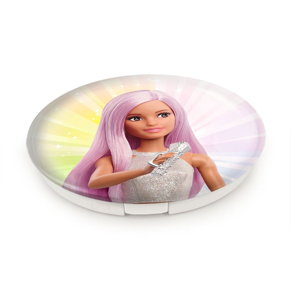 آینه های تاشو عروسک باربی خندالو، از جنس پلاستیک فشرده ABS تولید شده و به رنگ سفید می باشد. یکی از آینه ها ابعاد واقعی را نشان داده و دیگری با قابلیت بزرگنمایی، جزئیات را بهتر نمایش می دهد. ابعاد هر یک از آینه ها، دایره ای به قطر 7.5 سانت می باشد که نه خیلی بزرگ و غیر قابل استفاده در کیف آرایشی ست و نه خیلی کوچک که تصویر خاصی در آن مشاهده نشود. آینه تاشو عروسک باربی سایزی استاندارد و کارآمد دارد و در هر کیفی جا میگیرد. چاپ طرح بوسیله چاپگرهای دیجیتال شش رنگ با شفافیت و کیفیتی مثال زدنی بر روی یک وجه از بدنه ی آینه انجام گرفته و با روکش لمینت حرارتی پوشیده شده که در مقابل آسیب و خط و خش مقاوم بوده و کیفیت بالایی دارد. درب آینه بوسیله قفل بدنه ی آن، باز نمی ماند و کاملا بسته می شود و مناسب قرار گیری در کیف لوازم آرایش و کیف های کوچک دستی نیز هست. آینه های تاشو عروسک باربی خندالو با تنوع طرحی بسیار بالا، سلیقه هر نوع مخاطبی را تامین میکند.