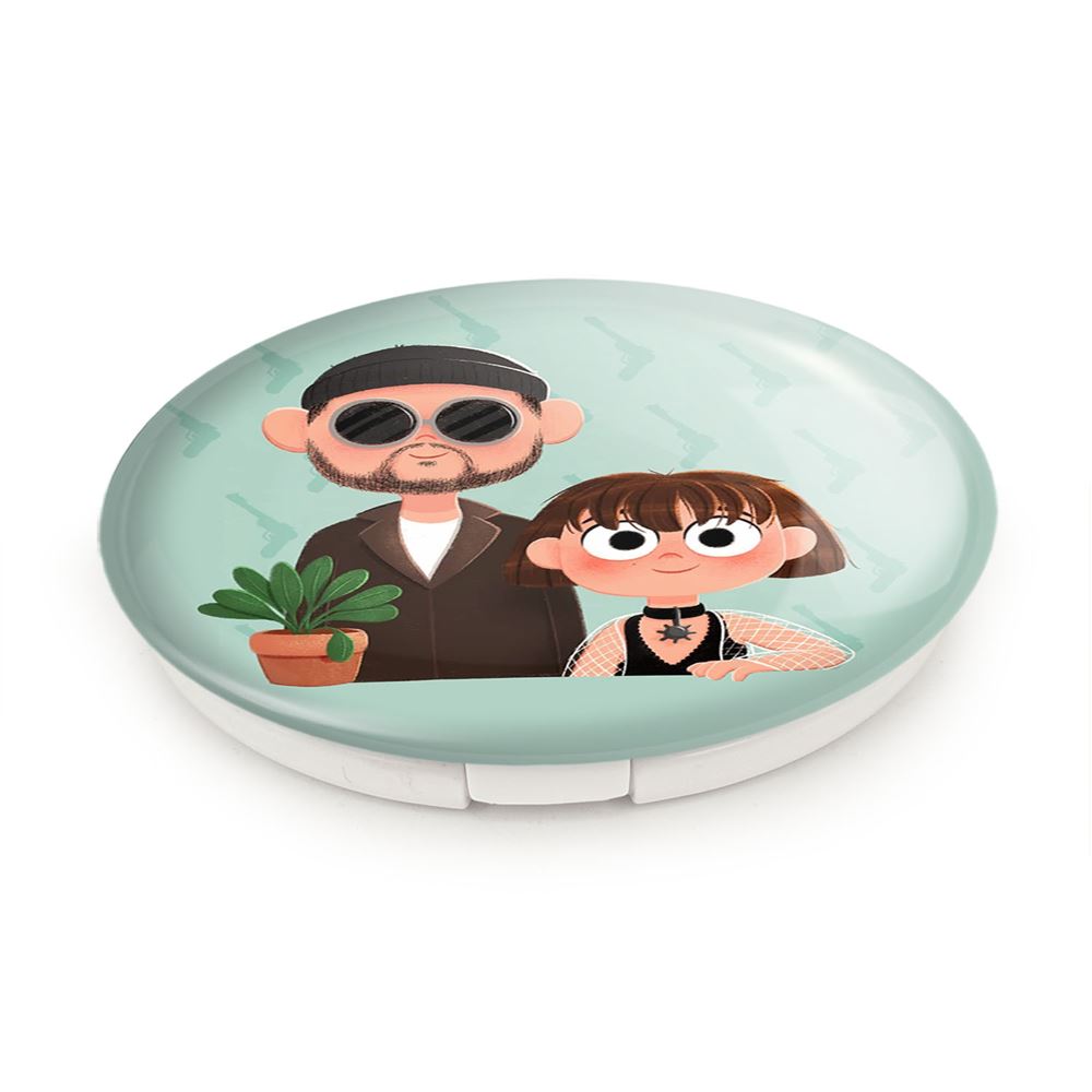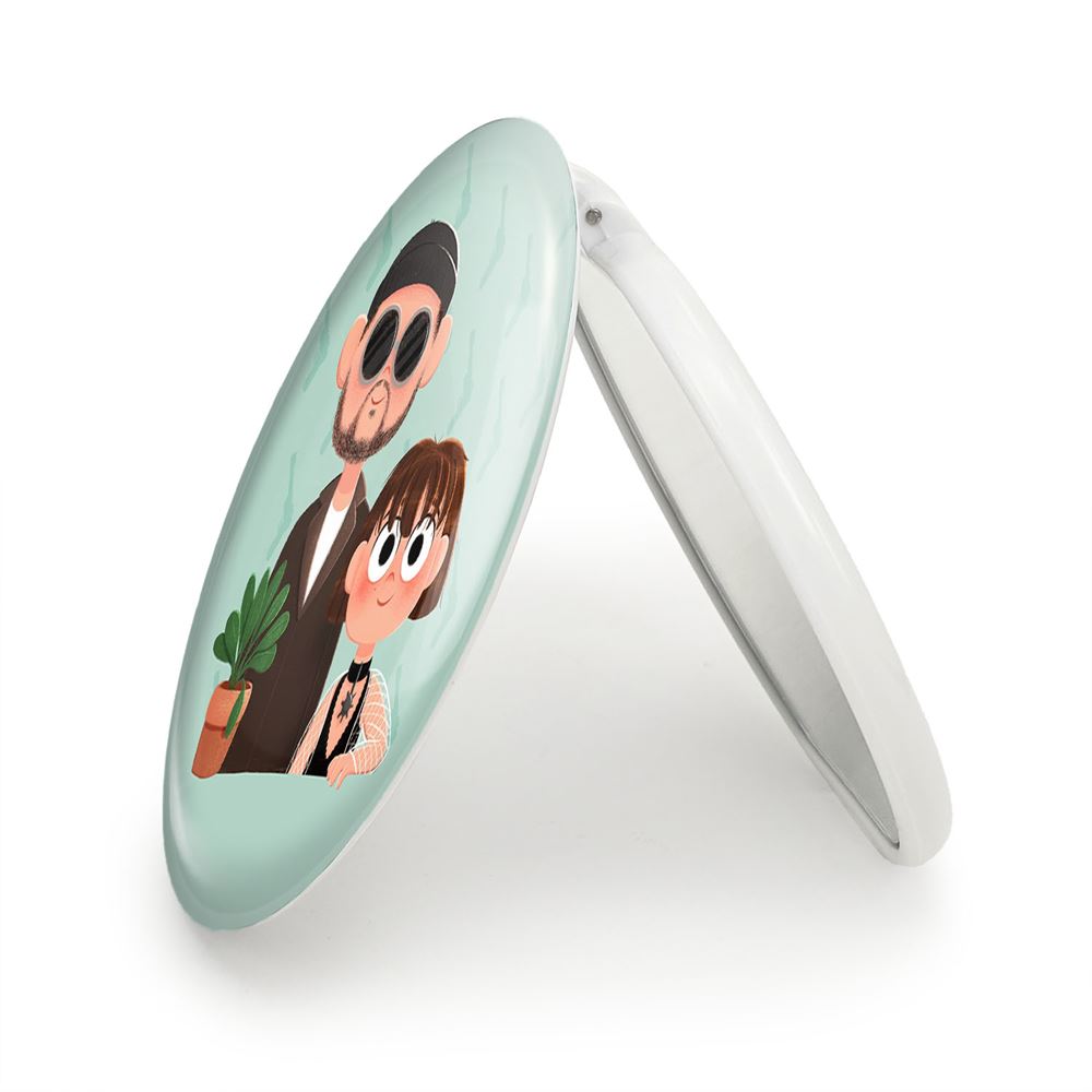 آینه های تاشو لئون و ماتیلدا خندالو، از جنس پلاستیک فشرده ABS تولید شده و به رنگ سفید می باشد. یکی از آینه ها ابعاد واقعی را نشان داده و دیگری با قابلیت بزرگنمایی، جزئیات را بهتر نمایش می دهد. ابعاد هر یک از آینه ها، دایره ای به قطر 7.5 سانت می باشد که نه خیلی بزرگ و غیر قابل استفاده در کیف آرایشی ست و نه خیلی کوچک که تصویر خاصی در آن مشاهده نشود. آینه تاشو لئون و ماتیلدا سایزی استاندارد و کارآمد دارد و در هر کیفی جا میگیرد. چاپ طرح بوسیله چاپگرهای دیجیتال شش رنگ با شفافیت و کیفیتی مثال زدنی بر روی یک وجه از بدنه ی آینه انجام گرفته و با روکش لمینت حرارتی پوشیده شده که در مقابل آسیب و خط و خش مقاوم بوده و کیفیت بالایی دارد. درب آینه بوسیله قفل بدنه ی آن، باز نمی ماند و کاملا بسته می شود و مناسب قرار گیری در کیف لوازم آرایش و کیف های کوچک دستی نیز هست. آینه های تاشو لئون و ماتیلدا خندالو با تنوع طرحی بسیار بالا، سلیقه هر نوع مخاطبی را تامین میکند.