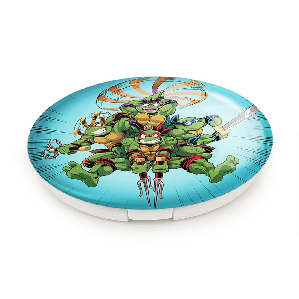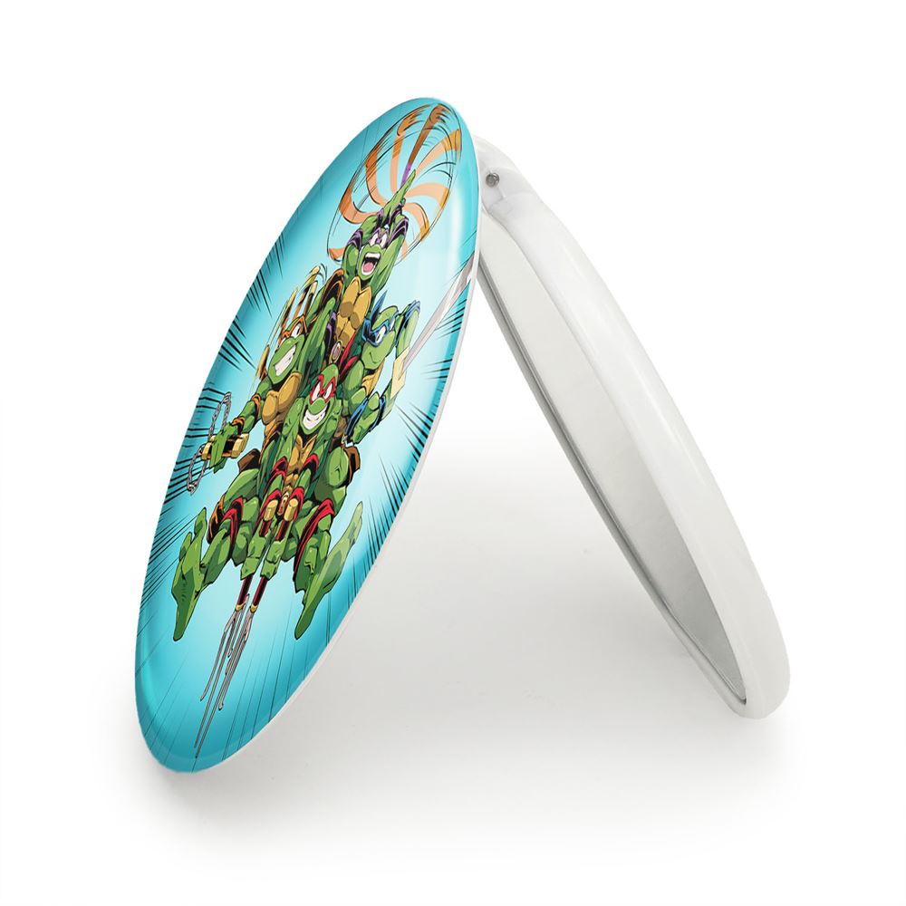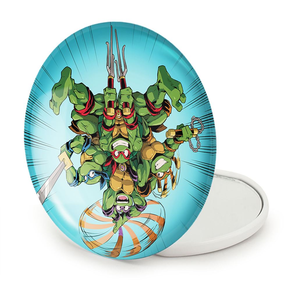آینه های تاشو لاکپشت های نینجا خندالو، از جنس پلاستیک فشرده ABS تولید شده و به رنگ سفید می باشد. یکی از آینه ها ابعاد واقعی را نشان داده و دیگری با قابلیت بزرگنمایی، جزئیات را بهتر نمایش می دهد. ابعاد هر یک از آینه ها، دایره ای به قطر 7.5 سانت می باشد که نه خیلی بزرگ و غیر قابل استفاده در کیف آرایشی ست و نه خیلی کوچک که تصویر خاصی در آن مشاهده نشود. آینه تاشو لاکپشت های نینجا سایزی استاندارد و کارآمد دارد و در هر کیفی جا میگیرد. چاپ طرح بوسیله چاپگرهای دیجیتال شش رنگ با شفافیت و کیفیتی مثال زدنی بر روی یک وجه از بدنه ی آینه انجام گرفته و با روکش لمینت حرارتی پوشیده شده که در مقابل آسیب و خط و خش مقاوم بوده و کیفیت بالایی دارد. درب آینه بوسیله قفل بدنه ی آن، باز نمی ماند و کاملا بسته می شود و مناسب قرار گیری در کیف لوازم آرایش و کیف های کوچک دستی نیز هست. آینه های تاشو لاکپشت های نینجا خندالو با تنوع طرحی بسیار بالا، سلیقه هر نوع مخاطبی را تامین میکند.