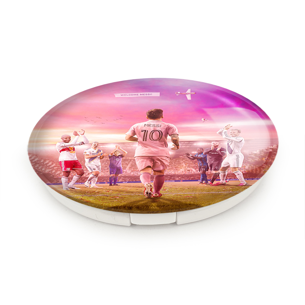 آینه های تاشو لیونل مسی خندالو، از جنس پلاستیک فشرده ABS تولید شده و به رنگ سفید می باشد. یکی از آینه ها ابعاد واقعی را نشان داده و دیگری با قابلیت بزرگنمایی، جزئیات را بهتر نمایش می دهد. ابعاد هر یک از آینه ها، دایره ای به قطر 7.5 سانت می باشد که نه خیلی بزرگ و غیر قابل استفاده در کیف آرایشی ست و نه خیلی کوچک که تصویر خاصی در آن مشاهده نشود. آینه تاشو لیونل مسی سایزی استاندارد و کارآمد دارد و در هر کیفی جا میگیرد. چاپ طرح بوسیله چاپگرهای دیجیتال شش رنگ با شفافیت و کیفیتی مثال زدنی بر روی یک وجه از بدنه ی آینه انجام گرفته و با روکش لمینت حرارتی پوشیده شده که در مقابل آسیب و خط و خش مقاوم بوده و کیفیت بالایی دارد. درب آینه بوسیله قفل بدنه ی آن، باز نمی ماند و کاملا بسته می شود و مناسب قرار گیری در کیف لوازم آرایش و کیف های کوچک دستی نیز هست. آینه های تاشو لیونل مسی خندالو با تنوع طرحی بسیار بالا، سلیقه هر نوع مخاطبی را تامین میکند.