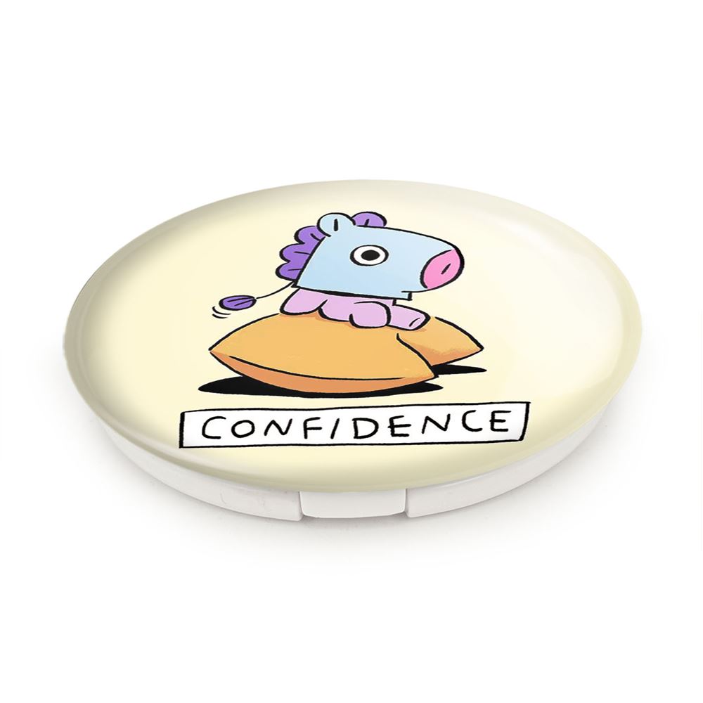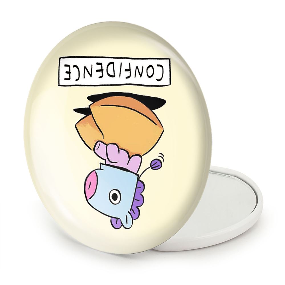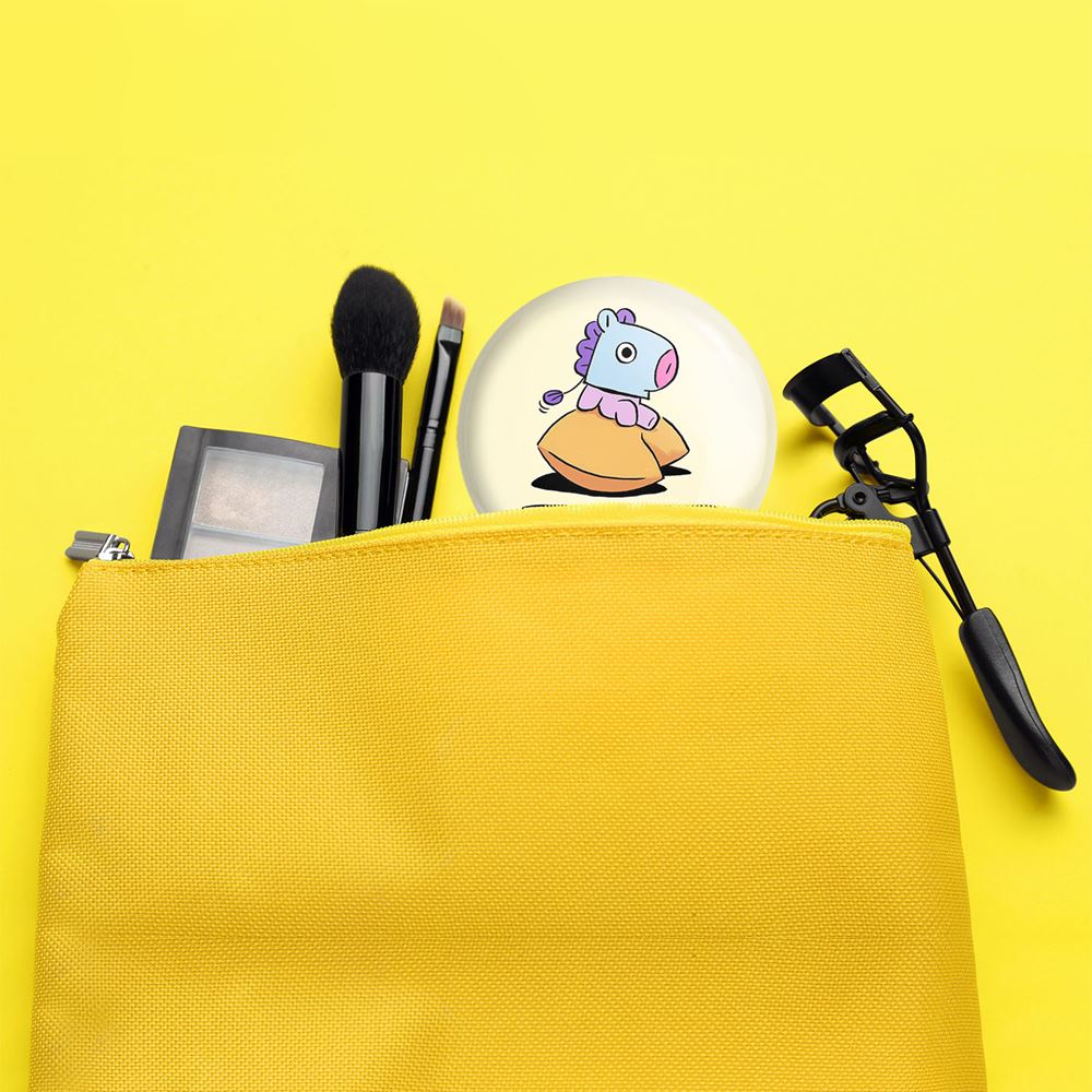 آینه های تاشو مانگ BT21 Mang خندالو، از جنس پلاستیک فشرده ABS تولید شده و به رنگ سفید می باشد. یکی از آینه ها ابعاد واقعی را نشان داده و دیگری با قابلیت بزرگنمایی، جزئیات را بهتر نمایش می دهد. ابعاد هر یک از آینه ها، دایره ای به قطر 7.5 سانت می باشد که نه خیلی بزرگ و غیر قابل استفاده در کیف آرایشی ست و نه خیلی کوچک که تصویر خاصی در آن مشاهده نشود. آینه تاشو مانگ BT21 Mang سایزی استاندارد و کارآمد دارد و در هر کیفی جا میگیرد. چاپ طرح بوسیله چاپگرهای دیجیتال شش رنگ با شفافیت و کیفیتی مثال زدنی بر روی یک وجه از بدنه ی آینه انجام گرفته و با روکش لمینت حرارتی پوشیده شده که در مقابل آسیب و خط و خش مقاوم بوده و کیفیت بالایی دارد. درب آینه بوسیله قفل بدنه ی آن، باز نمی ماند و کاملا بسته می شود و مناسب قرار گیری در کیف لوازم آرایش و کیف های کوچک دستی نیز هست. آینه های تاشو مانگ BT21 Mang خندالو با تنوع طرحی بسیار بالا، سلیقه هر نوع مخاطبی را تامین میکند.