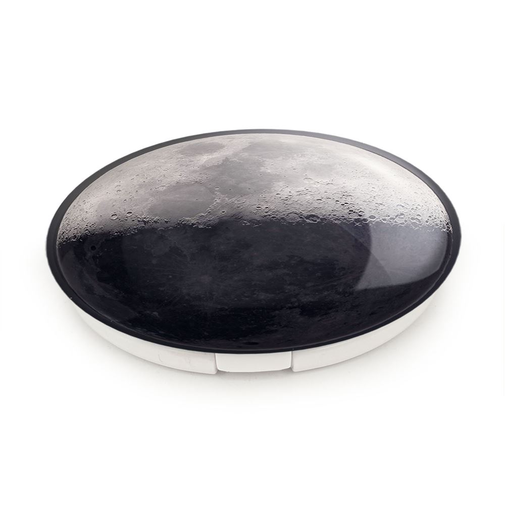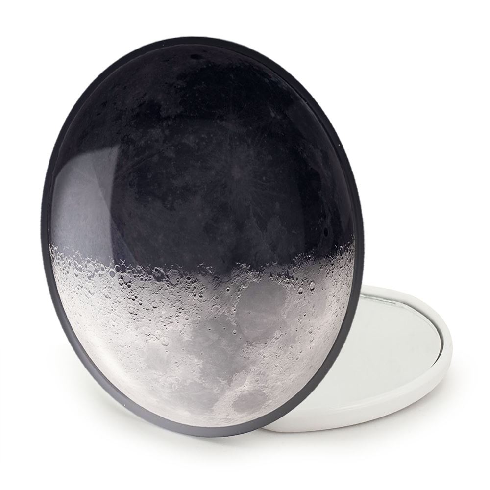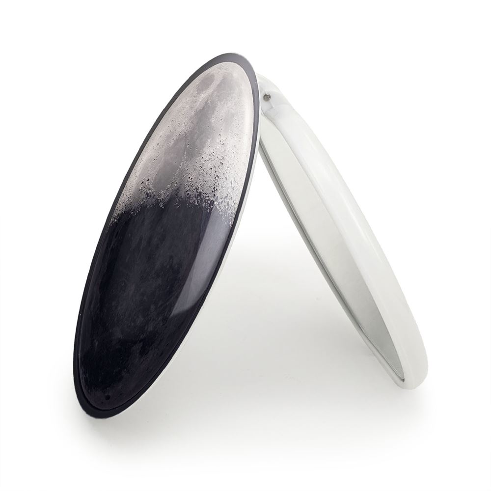 آینه های تاشو ماه خندالو، از جنس پلاستیک فشرده ABS تولید شده و به رنگ سفید می باشد. یکی از آینه ها ابعاد واقعی را نشان داده و دیگری با قابلیت بزرگنمایی، جزئیات را بهتر نمایش می دهد. ابعاد هر یک از آینه ها، دایره ای به قطر 7.5 سانت می باشد که نه خیلی بزرگ و غیر قابل استفاده در کیف آرایشی ست و نه خیلی کوچک که تصویر خاصی در آن مشاهده نشود. آینه تاشو ماه سایزی استاندارد و کارآمد دارد و در هر کیفی جا میگیرد. چاپ طرح بوسیله چاپگرهای دیجیتال شش رنگ با شفافیت و کیفیتی مثال زدنی بر روی یک وجه از بدنه ی آینه انجام گرفته و با روکش لمینت حرارتی پوشیده شده که در مقابل آسیب و خط و خش مقاوم بوده و کیفیت بالایی دارد. درب آینه بوسیله قفل بدنه ی آن، باز نمی ماند و کاملا بسته می شود و مناسب قرار گیری در کیف لوازم آرایش و کیف های کوچک دستی نیز هست. آینه های تاشو ماه خندالو با تنوع طرحی بسیار بالا، سلیقه هر نوع مخاطبی را تامین میکند.