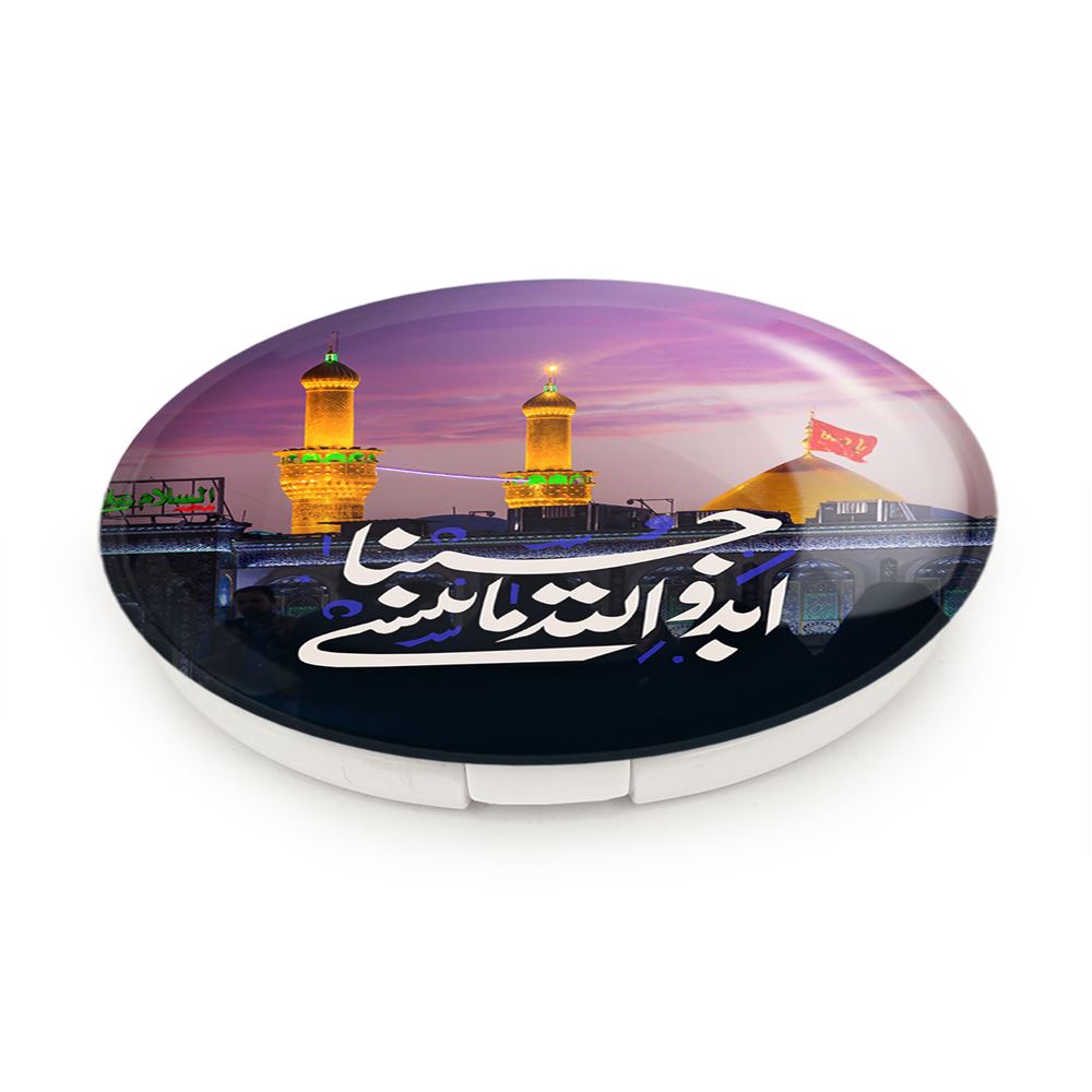 آینه های تاشو محرم ابد والله ما ننسی حسینا خندالو، از جنس پلاستیک فشرده ABS تولید شده و به رنگ سفید می باشد. یکی از آینه ها ابعاد واقعی را نشان داده و دیگری با قابلیت بزرگنمایی، جزئیات را بهتر نمایش می دهد. ابعاد هر یک از آینه ها، دایره ای به قطر 7.5 سانت می باشد که نه خیلی بزرگ و غیر قابل استفاده در کیف آرایشی ست و نه خیلی کوچک که تصویر خاصی در آن مشاهده نشود. آینه تاشو محرم ابد والله ما ننسی حسینا سایزی استاندارد و کارآمد دارد و در هر کیفی جا میگیرد. چاپ طرح بوسیله چاپگرهای دیجیتال شش رنگ با شفافیت و کیفیتی مثال زدنی بر روی یک وجه از بدنه ی آینه انجام گرفته و با روکش لمینت حرارتی پوشیده شده که در مقابل آسیب و خط و خش مقاوم بوده و کیفیت بالایی دارد. درب آینه بوسیله قفل بدنه ی آن، باز نمی ماند و کاملا بسته می شود و مناسب قرار گیری در کیف لوازم آرایش و کیف های کوچک دستی نیز هست. آینه های تاشو محرم ابد والله ما ننسی حسینا خندالو با تنوع طرحی بسیار بالا، سلیقه هر نوع مخاطبی را تامین میکند.
