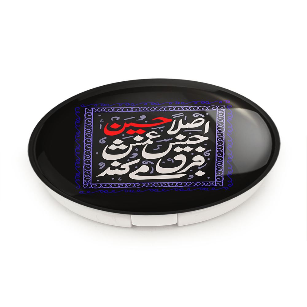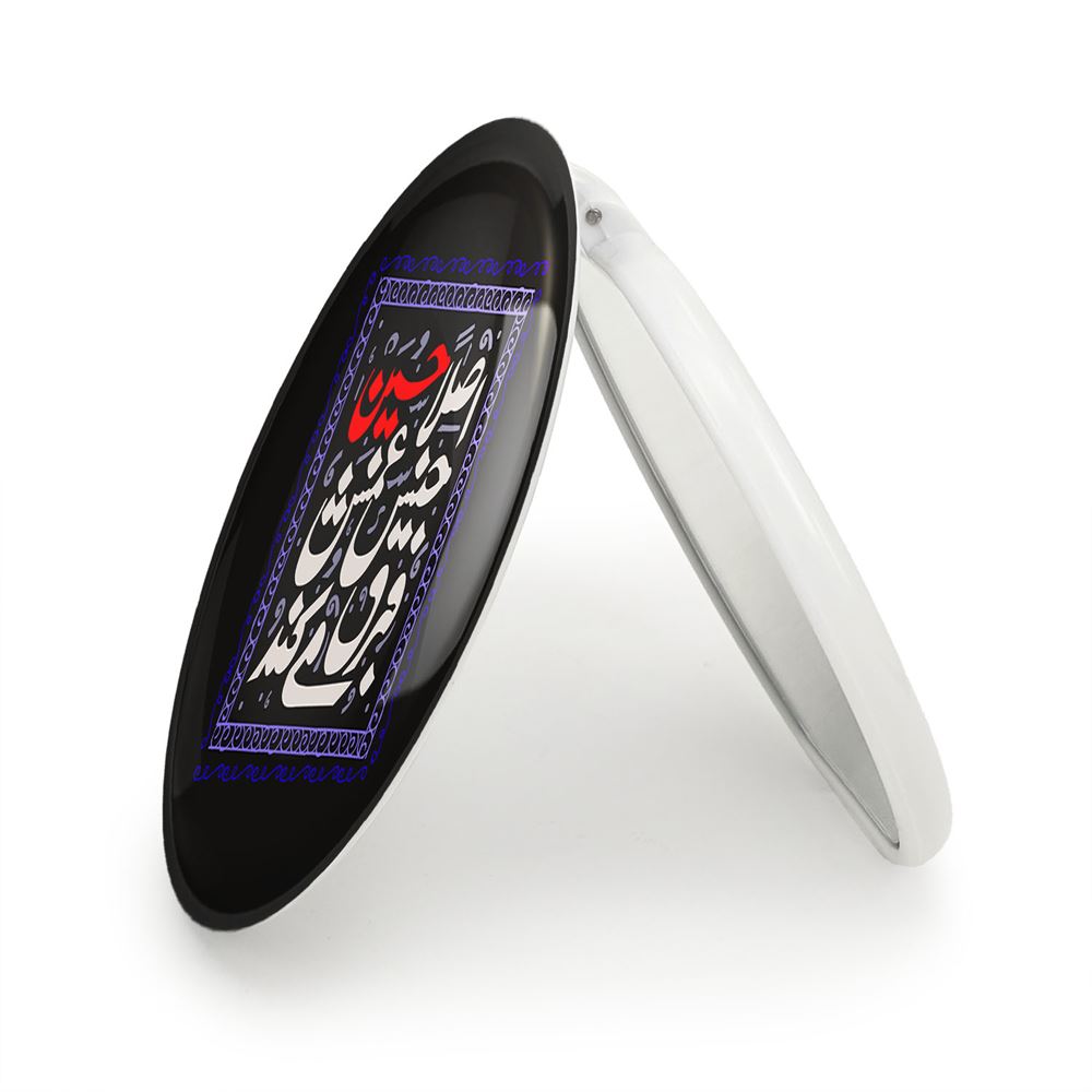 آینه های تاشو محرم اصلا حسین جنس غمش فرق می کند خندالو، از جنس پلاستیک فشرده ABS تولید شده و به رنگ سفید می باشد. یکی از آینه ها ابعاد واقعی را نشان داده و دیگری با قابلیت بزرگنمایی، جزئیات را بهتر نمایش می دهد. ابعاد هر یک از آینه ها، دایره ای به قطر 7.5 سانت می باشد که نه خیلی بزرگ و غیر قابل استفاده در کیف آرایشی ست و نه خیلی کوچک که تصویر خاصی در آن مشاهده نشود. آینه تاشو محرم اصلا حسین جنس غمش فرق می کند سایزی استاندارد و کارآمد دارد و در هر کیفی جا میگیرد. چاپ طرح بوسیله چاپگرهای دیجیتال شش رنگ با شفافیت و کیفیتی مثال زدنی بر روی یک وجه از بدنه ی آینه انجام گرفته و با روکش لمینت حرارتی پوشیده شده که در مقابل آسیب و خط و خش مقاوم بوده و کیفیت بالایی دارد. درب آینه بوسیله قفل بدنه ی آن، باز نمی ماند و کاملا بسته می شود و مناسب قرار گیری در کیف لوازم آرایش و کیف های کوچک دستی نیز هست. آینه های تاشو محرم اصلا حسین جنس غمش فرق می کند خندالو با تنوع طرحی بسیار بالا، سلیقه هر نوع مخاطبی را تامین میکند.