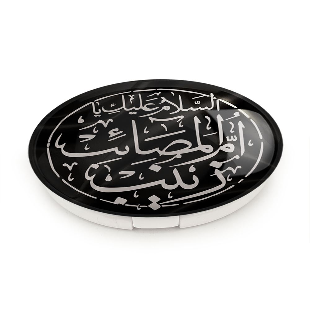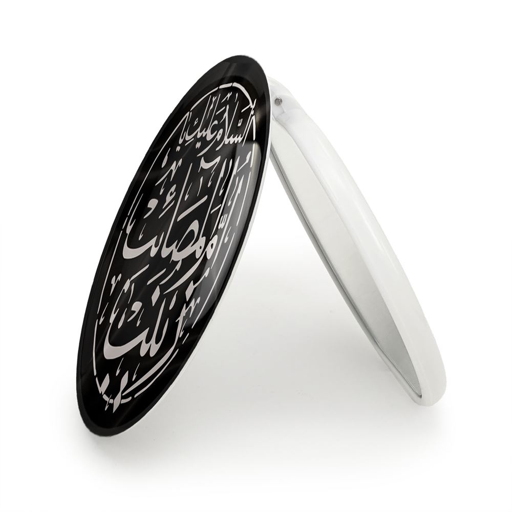 آینه های تاشو محرم السلام علیك یا ام المصائب یا زینب خندالو، از جنس پلاستیک فشرده ABS تولید شده و به رنگ سفید می باشد. یکی از آینه ها ابعاد واقعی را نشان داده و دیگری با قابلیت بزرگنمایی، جزئیات را بهتر نمایش می دهد. ابعاد هر یک از آینه ها، دایره ای به قطر 7.5 سانت می باشد که نه خیلی بزرگ و غیر قابل استفاده در کیف آرایشی ست و نه خیلی کوچک که تصویر خاصی در آن مشاهده نشود. آینه تاشو محرم السلام علیك یا ام المصائب یا زینب سایزی استاندارد و کارآمد دارد و در هر کیفی جا میگیرد. چاپ طرح بوسیله چاپگرهای دیجیتال شش رنگ با شفافیت و کیفیتی مثال زدنی بر روی یک وجه از بدنه ی آینه انجام گرفته و با روکش لمینت حرارتی پوشیده شده که در مقابل آسیب و خط و خش مقاوم بوده و کیفیت بالایی دارد. درب آینه بوسیله قفل بدنه ی آن، باز نمی ماند و کاملا بسته می شود و مناسب قرار گیری در کیف لوازم آرایش و کیف های کوچک دستی نیز هست. آینه های تاشو محرم السلام علیك یا ام المصائب یا زینب خندالو با تنوع طرحی بسیار بالا، سلیقه هر نوع مخاطبی را تامین میکند.