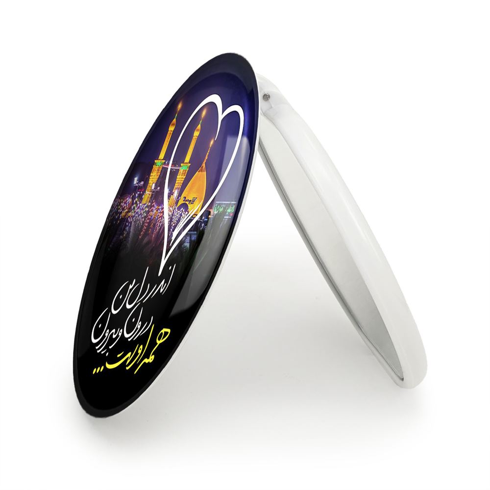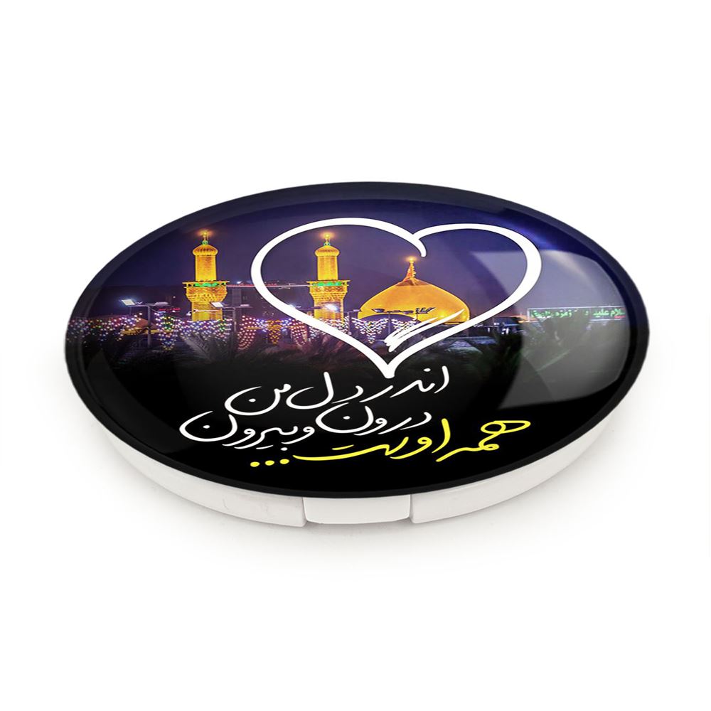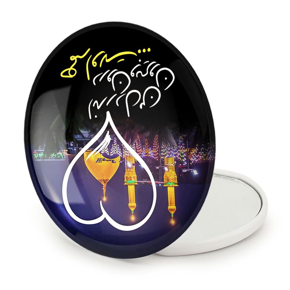 آینه های تاشو محرم اندر دل من درون و بیرون همه اوست خندالو، از جنس پلاستیک فشرده ABS تولید شده و به رنگ سفید می باشد. یکی از آینه ها ابعاد واقعی را نشان داده و دیگری با قابلیت بزرگنمایی، جزئیات را بهتر نمایش می دهد. ابعاد هر یک از آینه ها، دایره ای به قطر 7.5 سانت می باشد که نه خیلی بزرگ و غیر قابل استفاده در کیف آرایشی ست و نه خیلی کوچک که تصویر خاصی در آن مشاهده نشود. آینه تاشو محرم اندر دل من درون و بیرون همه اوست سایزی استاندارد و کارآمد دارد و در هر کیفی جا میگیرد. چاپ طرح بوسیله چاپگرهای دیجیتال شش رنگ با شفافیت و کیفیتی مثال زدنی بر روی یک وجه از بدنه ی آینه انجام گرفته و با روکش لمینت حرارتی پوشیده شده که در مقابل آسیب و خط و خش مقاوم بوده و کیفیت بالایی دارد. درب آینه بوسیله قفل بدنه ی آن، باز نمی ماند و کاملا بسته می شود و مناسب قرار گیری در کیف لوازم آرایش و کیف های کوچک دستی نیز هست. آینه های تاشو محرم اندر دل من درون و بیرون همه اوست خندالو با تنوع طرحی بسیار بالا، سلیقه هر نوع مخاطبی را تامین میکند.