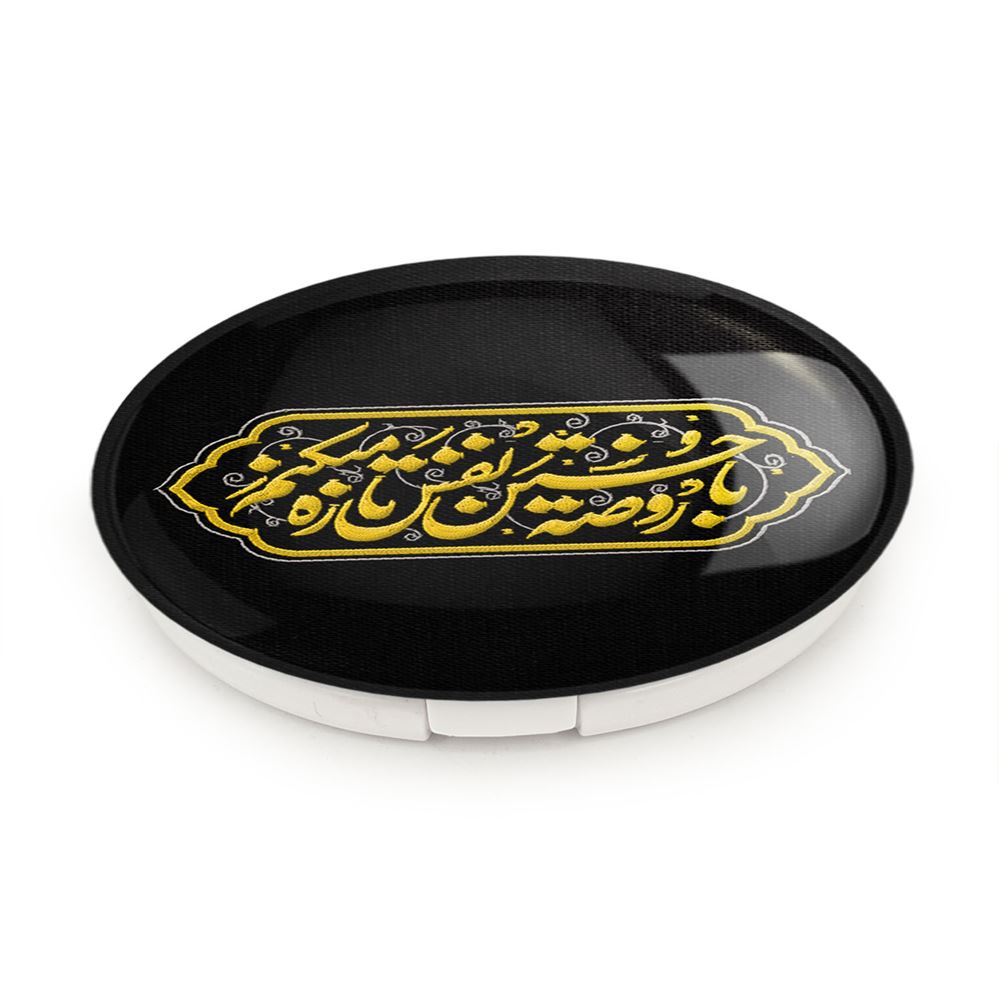 آینه های تاشو محرم با روضه حسین نفس تازه میکنم خندالو، از جنس پلاستیک فشرده ABS تولید شده و به رنگ سفید می باشد. یکی از آینه ها ابعاد واقعی را نشان داده و دیگری با قابلیت بزرگنمایی، جزئیات را بهتر نمایش می دهد. ابعاد هر یک از آینه ها، دایره ای به قطر 7.5 سانت می باشد که نه خیلی بزرگ و غیر قابل استفاده در کیف آرایشی ست و نه خیلی کوچک که تصویر خاصی در آن مشاهده نشود. آینه تاشو محرم با روضه حسین نفس تازه میکنم سایزی استاندارد و کارآمد دارد و در هر کیفی جا میگیرد. چاپ طرح بوسیله چاپگرهای دیجیتال شش رنگ با شفافیت و کیفیتی مثال زدنی بر روی یک وجه از بدنه ی آینه انجام گرفته و با روکش لمینت حرارتی پوشیده شده که در مقابل آسیب و خط و خش مقاوم بوده و کیفیت بالایی دارد. درب آینه بوسیله قفل بدنه ی آن، باز نمی ماند و کاملا بسته می شود و مناسب قرار گیری در کیف لوازم آرایش و کیف های کوچک دستی نیز هست. آینه های تاشو محرم با روضه حسین نفس تازه میکنم خندالو با تنوع طرحی بسیار بالا، سلیقه هر نوع مخاطبی را تامین میکند.