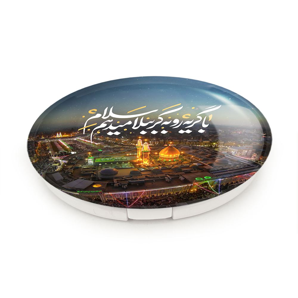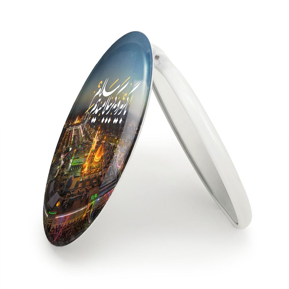 آینه های تاشو محرم با گریه رو به کربُبلا میدهم سلام خندالو، از جنس پلاستیک فشرده ABS تولید شده و به رنگ سفید می باشد. یکی از آینه ها ابعاد واقعی را نشان داده و دیگری با قابلیت بزرگنمایی، جزئیات را بهتر نمایش می دهد. ابعاد هر یک از آینه ها، دایره ای به قطر 7.5 سانت می باشد که نه خیلی بزرگ و غیر قابل استفاده در کیف آرایشی ست و نه خیلی کوچک که تصویر خاصی در آن مشاهده نشود. آینه تاشو محرم با گریه رو به کربُبلا میدهم سلام سایزی استاندارد و کارآمد دارد و در هر کیفی جا میگیرد. چاپ طرح بوسیله چاپگرهای دیجیتال شش رنگ با شفافیت و کیفیتی مثال زدنی بر روی یک وجه از بدنه ی آینه انجام گرفته و با روکش لمینت حرارتی پوشیده شده که در مقابل آسیب و خط و خش مقاوم بوده و کیفیت بالایی دارد. درب آینه بوسیله قفل بدنه ی آن، باز نمی ماند و کاملا بسته می شود و مناسب قرار گیری در کیف لوازم آرایش و کیف های کوچک دستی نیز هست. آینه های تاشو محرم با گریه رو به کربُبلا میدهم سلام خندالو با تنوع طرحی بسیار بالا، سلیقه هر نوع مخاطبی را تامین میکند.