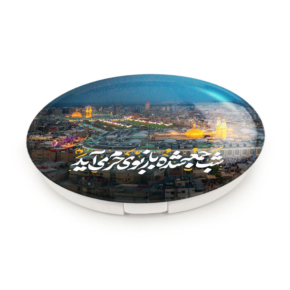آینه های تاشو محرم شب جمعه شده باز بوی حرم می آید خندالو، از جنس پلاستیک فشرده ABS تولید شده و به رنگ سفید می باشد. یکی از آینه ها ابعاد واقعی را نشان داده و دیگری با قابلیت بزرگنمایی، جزئیات را بهتر نمایش می دهد.