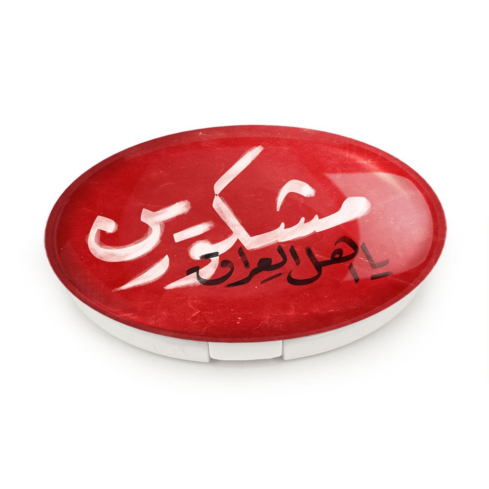 آینه های تاشو محرم مشکورین یا اهل العراق خندالو، از جنس پلاستیک فشرده ABS تولید شده و به رنگ سفید می باشد. یکی از آینه ها ابعاد واقعی را نشان داده و دیگری با قابلیت بزرگنمایی، جزئیات را بهتر نمایش می دهد. ابعاد هر یک از آینه ها، دایره ای به قطر 7.5 سانت می باشد که نه خیلی بزرگ و غیر قابل استفاده در کیف آرایشی ست و نه خیلی کوچک که تصویر خاصی در آن مشاهده نشود. آینه تاشو محرم مشکورین یا اهل العراق سایزی استاندارد و کارآمد دارد و در هر کیفی جا میگیرد. چاپ طرح بوسیله چاپگرهای دیجیتال شش رنگ با شفافیت و کیفیتی مثال زدنی بر روی یک وجه از بدنه ی آینه انجام گرفته و با روکش لمینت حرارتی پوشیده شده که در مقابل آسیب و خط و خش مقاوم بوده و کیفیت بالایی دارد. درب آینه بوسیله قفل بدنه ی آن، باز نمی ماند و کاملا بسته می شود و مناسب قرار گیری در کیف لوازم آرایش و کیف های کوچک دستی نیز هست. آینه های تاشو محرم مشکورین یا اهل العراق خندالو با تنوع طرحی بسیار بالا، سلیقه هر نوع مخاطبی را تامین میکند.