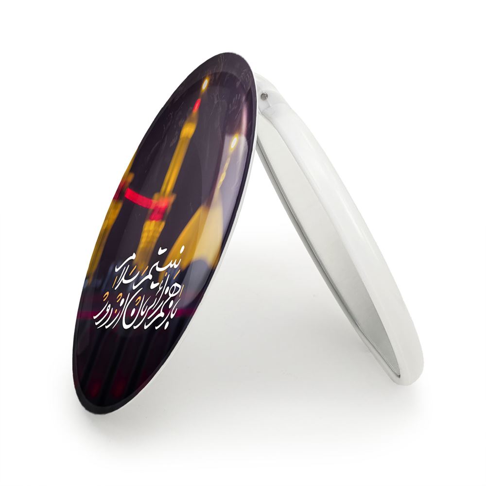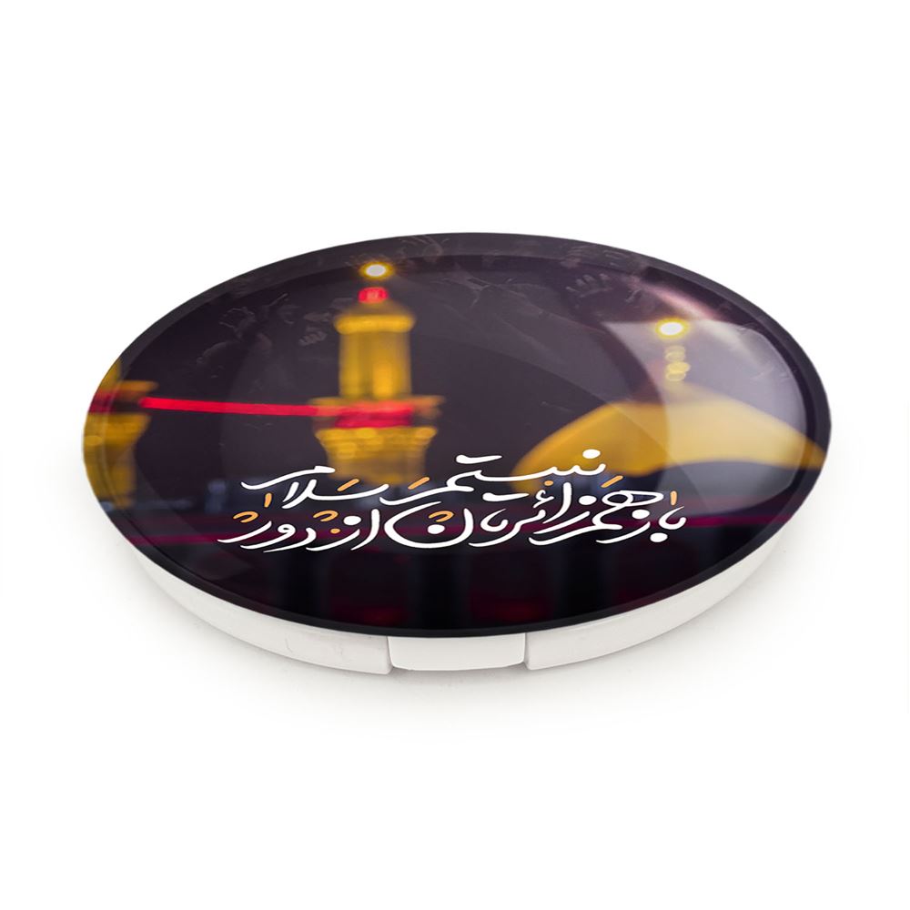 آینه های تاشو محرم کربلا باز هم زائرتان نیستم از دور سلام خندالو، از جنس پلاستیک فشرده ABS تولید شده و به رنگ سفید می باشد. یکی از آینه ها ابعاد واقعی را نشان داده و دیگری با قابلیت بزرگنمایی، جزئیات را بهتر نمایش می دهد. ابعاد هر یک از آینه ها، دایره ای به قطر 7.5 سانت می باشد که نه خیلی بزرگ و غیر قابل استفاده در کیف آرایشی ست و نه خیلی کوچک که تصویر خاصی در آن مشاهده نشود. آینه تاشو محرم کربلا باز هم زائرتان نیستم از دور سلام سایزی استاندارد و کارآمد دارد و در هر کیفی جا میگیرد. چاپ طرح بوسیله چاپگرهای دیجیتال شش رنگ با شفافیت و کیفیتی مثال زدنی بر روی یک وجه از بدنه ی آینه انجام گرفته و با روکش لمینت حرارتی پوشیده شده که در مقابل آسیب و خط و خش مقاوم بوده و کیفیت بالایی دارد. درب آینه بوسیله قفل بدنه ی آن، باز نمی ماند و کاملا بسته می شود و مناسب قرار گیری در کیف لوازم آرایش و کیف های کوچک دستی نیز هست. آینه های تاشو محرم کربلا باز هم زائرتان نیستم از دور سلام خندالو با تنوع طرحی بسیار بالا، سلیقه هر نوع مخاطبی را تامین میکند.