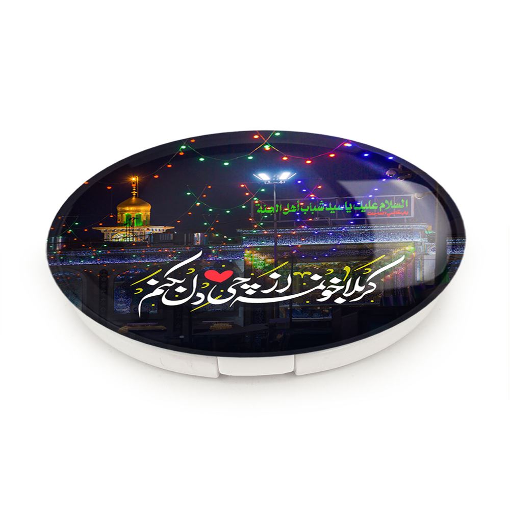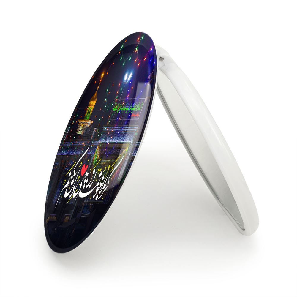 آینه های تاشو محرم کربلا خونمه از چی دل بکنم خندالو، از جنس پلاستیک فشرده ABS تولید شده و به رنگ سفید می باشد. یکی از آینه ها ابعاد واقعی را نشان داده و دیگری با قابلیت بزرگنمایی، جزئیات را بهتر نمایش می دهد. ابعاد هر یک از آینه ها، دایره ای به قطر 7.5 سانت می باشد که نه خیلی بزرگ و غیر قابل استفاده در کیف آرایشی ست و نه خیلی کوچک که تصویر خاصی در آن مشاهده نشود. آینه تاشو محرم کربلا خونمه از چی دل بکنم سایزی استاندارد و کارآمد دارد و در هر کیفی جا میگیرد. چاپ طرح بوسیله چاپگرهای دیجیتال شش رنگ با شفافیت و کیفیتی مثال زدنی بر روی یک وجه از بدنه ی آینه انجام گرفته و با روکش لمینت حرارتی پوشیده شده که در مقابل آسیب و خط و خش مقاوم بوده و کیفیت بالایی دارد. درب آینه بوسیله قفل بدنه ی آن، باز نمی ماند و کاملا بسته می شود و مناسب قرار گیری در کیف لوازم آرایش و کیف های کوچک دستی نیز هست. آینه های تاشو محرم کربلا خونمه از چی دل بکنم خندالو با تنوع طرحی بسیار بالا، سلیقه هر نوع مخاطبی را تامین میکند.