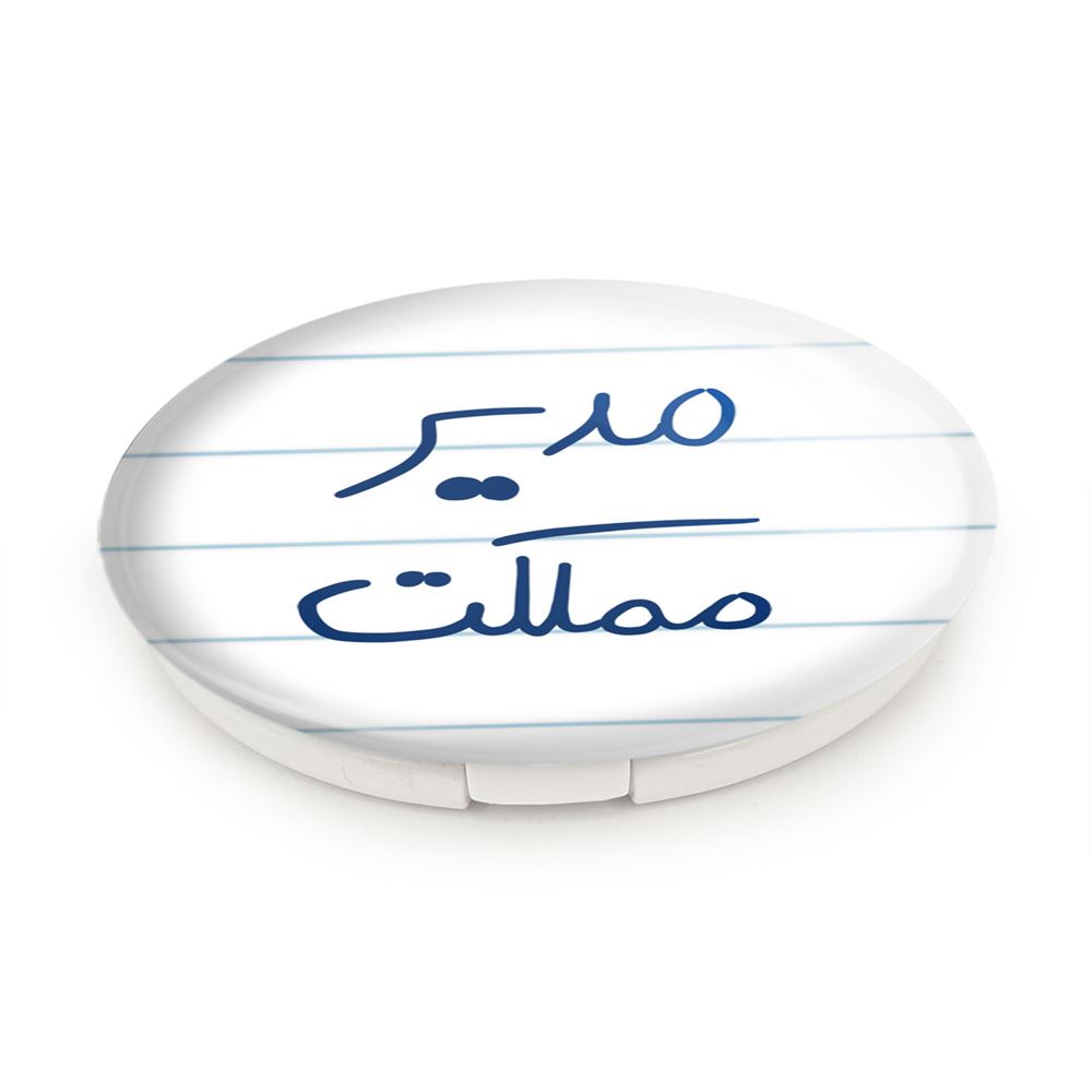 آینه های تاشو مدیر مملکت خندالو، از جنس پلاستیک فشرده ABS تولید شده و به رنگ سفید می باشد. یکی از آینه ها ابعاد واقعی را نشان داده و دیگری با قابلیت بزرگنمایی، جزئیات را بهتر نمایش می دهد. ابعاد هر یک از آینه ها، دایره ای به قطر 7.5 سانت می باشد که نه خیلی بزرگ و غیر قابل استفاده در کیف آرایشی ست و نه خیلی کوچک که تصویر خاصی در آن مشاهده نشود. آینه تاشو مدیر مملکت سایزی استاندارد و کارآمد دارد و در هر کیفی جا میگیرد. چاپ طرح بوسیله چاپگرهای دیجیتال شش رنگ با شفافیت و کیفیتی مثال زدنی بر روی یک وجه از بدنه ی آینه انجام گرفته و با روکش لمینت حرارتی پوشیده شده که در مقابل آسیب و خط و خش مقاوم بوده و کیفیت بالایی دارد. درب آینه بوسیله قفل بدنه ی آن، باز نمی ماند و کاملا بسته می شود و مناسب قرار گیری در کیف لوازم آرایش و کیف های کوچک دستی نیز هست. آینه های تاشو مدیر مملکت خندالو با تنوع طرحی بسیار بالا، سلیقه هر نوع مخاطبی را تامین میکند.