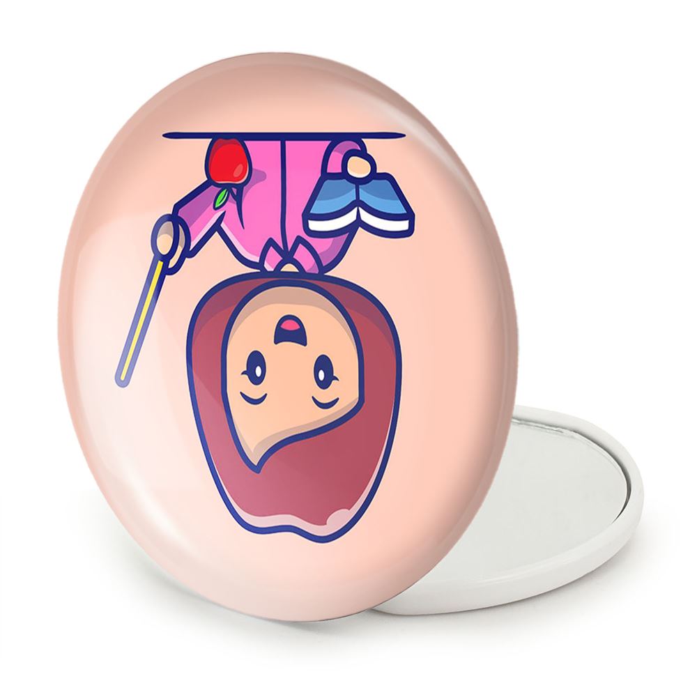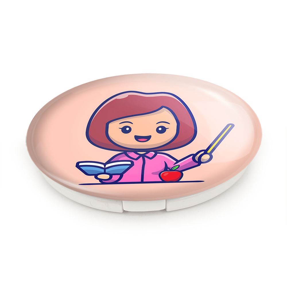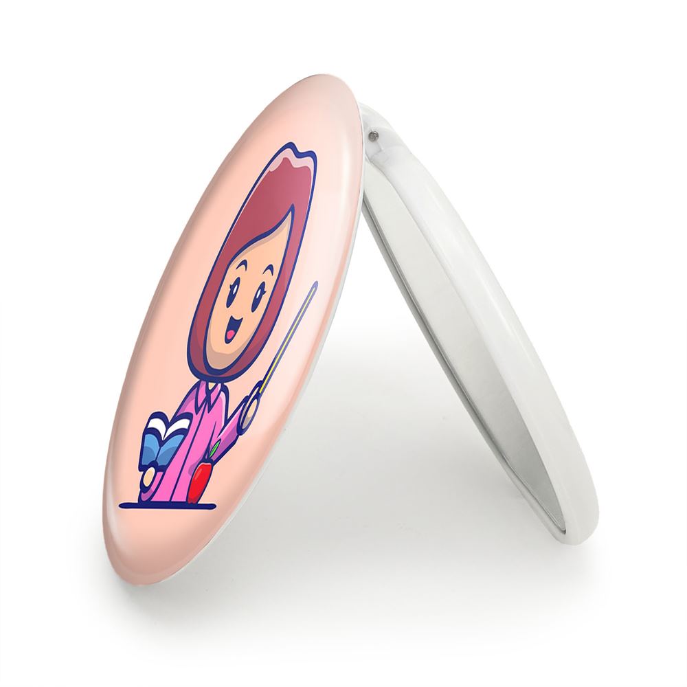 آینه های تاشو معلم خندالو، از جنس پلاستیک فشرده ABS تولید شده و به رنگ سفید می باشد. یکی از آینه ها ابعاد واقعی را نشان داده و دیگری با قابلیت بزرگنمایی، جزئیات را بهتر نمایش می دهد. ابعاد هر یک از آینه ها، دایره ای به قطر 7.5 سانت می باشد که نه خیلی بزرگ و غیر قابل استفاده در کیف آرایشی ست و نه خیلی کوچک که تصویر خاصی در آن مشاهده نشود. آینه تاشو معلم سایزی استاندارد و کارآمد دارد و در هر کیفی جا میگیرد. چاپ طرح بوسیله چاپگرهای دیجیتال شش رنگ با شفافیت و کیفیتی مثال زدنی بر روی یک وجه از بدنه ی آینه انجام گرفته و با روکش لمینت حرارتی پوشیده شده که در مقابل آسیب و خط و خش مقاوم بوده و کیفیت بالایی دارد. درب آینه بوسیله قفل بدنه ی آن، باز نمی ماند و کاملا بسته می شود و مناسب قرار گیری در کیف لوازم آرایش و کیف های کوچک دستی نیز هست. آینه های تاشو معلم خندالو با تنوع طرحی بسیار بالا، سلیقه هر نوع مخاطبی را تامین میکند.