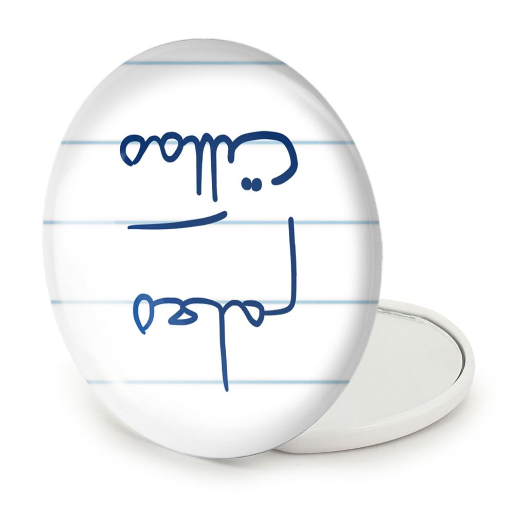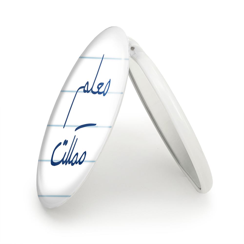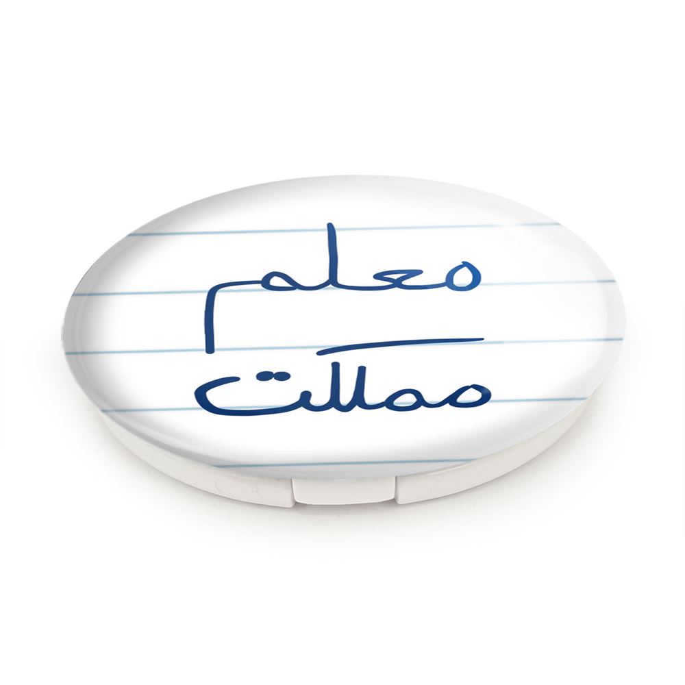 آینه های تاشو معلم مملکت خندالو، از جنس پلاستیک فشرده ABS تولید شده و به رنگ سفید می باشد. یکی از آینه ها ابعاد واقعی را نشان داده و دیگری با قابلیت بزرگنمایی، جزئیات را بهتر نمایش می دهد. ابعاد هر یک از آینه ها، دایره ای به قطر 7.5 سانت می باشد که نه خیلی بزرگ و غیر قابل استفاده در کیف آرایشی ست و نه خیلی کوچک که تصویر خاصی در آن مشاهده نشود. آینه تاشو معلم مملکت سایزی استاندارد و کارآمد دارد و در هر کیفی جا میگیرد. چاپ طرح بوسیله چاپگرهای دیجیتال شش رنگ با شفافیت و کیفیتی مثال زدنی بر روی یک وجه از بدنه ی آینه انجام گرفته و با روکش لمینت حرارتی پوشیده شده که در مقابل آسیب و خط و خش مقاوم بوده و کیفیت بالایی دارد. درب آینه بوسیله قفل بدنه ی آن، باز نمی ماند و کاملا بسته می شود و مناسب قرار گیری در کیف لوازم آرایش و کیف های کوچک دستی نیز هست. آینه های تاشو معلم مملکت خندالو با تنوع طرحی بسیار بالا، سلیقه هر نوع مخاطبی را تامین میکند.