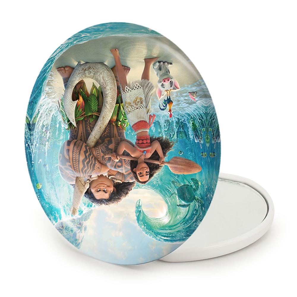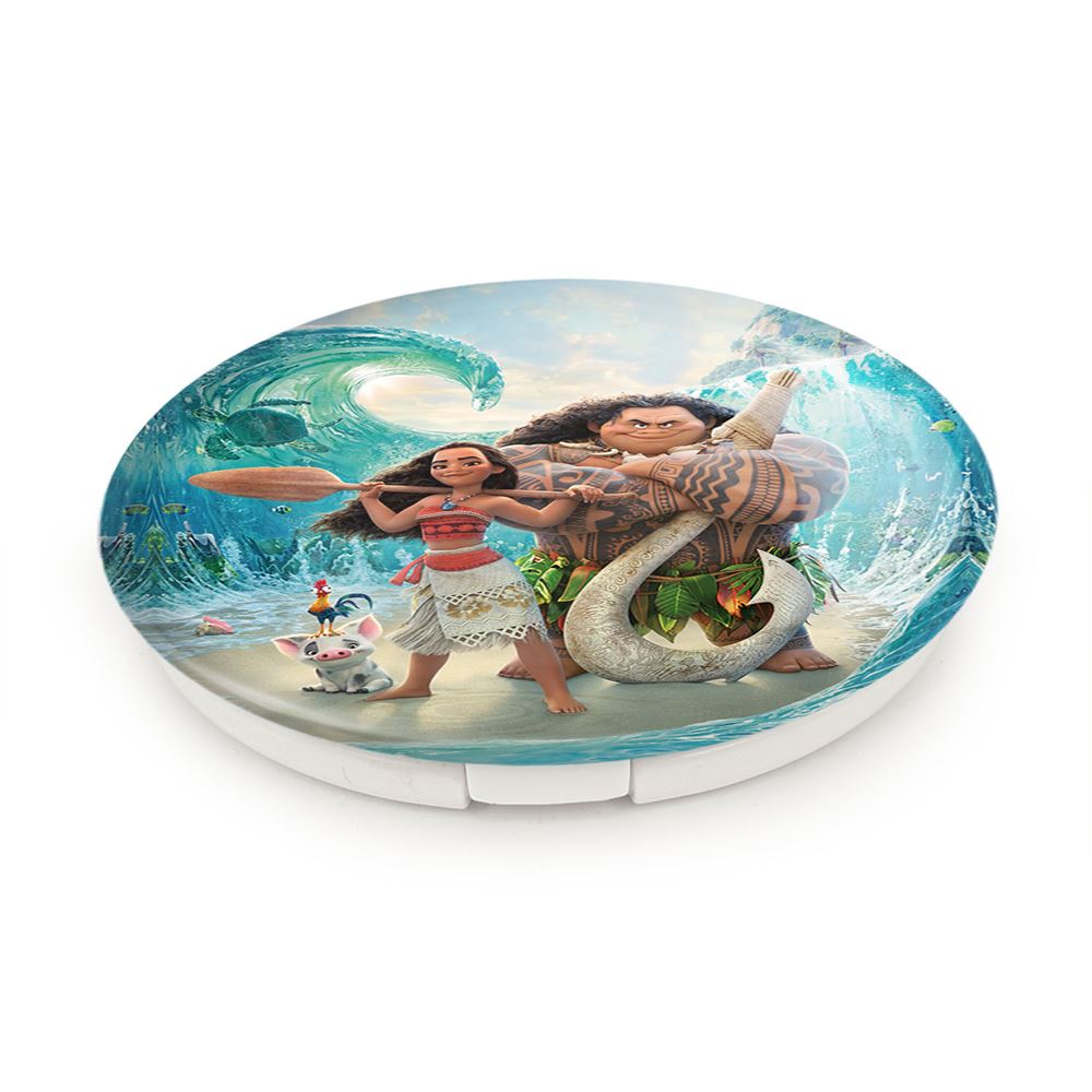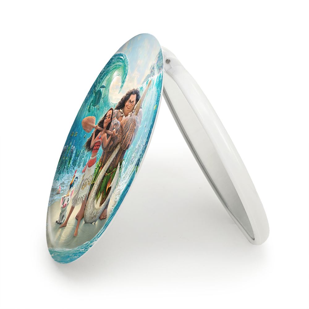 آینه های تاشو موآنا Moana خندالو، از جنس پلاستیک فشرده ABS تولید شده و به رنگ سفید می باشد. یکی از آینه ها ابعاد واقعی را نشان داده و دیگری با قابلیت بزرگنمایی، جزئیات را بهتر نمایش می دهد. ابعاد هر یک از آینه ها، دایره ای به قطر 7.5 سانت می باشد که نه خیلی بزرگ و غیر قابل استفاده در کیف آرایشی ست و نه خیلی کوچک که تصویر خاصی در آن مشاهده نشود. آینه تاشو موآنا Moana سایزی استاندارد و کارآمد دارد و در هر کیفی جا میگیرد. چاپ طرح بوسیله چاپگرهای دیجیتال شش رنگ با شفافیت و کیفیتی مثال زدنی بر روی یک وجه از بدنه ی آینه انجام گرفته و با روکش لمینت حرارتی پوشیده شده که در مقابل آسیب و خط و خش مقاوم بوده و کیفیت بالایی دارد. درب آینه بوسیله قفل بدنه ی آن، باز نمی ماند و کاملا بسته می شود و مناسب قرار گیری در کیف لوازم آرایش و کیف های کوچک دستی نیز هست. آینه های تاشو موآنا Moana خندالو با تنوع طرحی بسیار بالا، سلیقه هر نوع مخاطبی را تامین میکند.