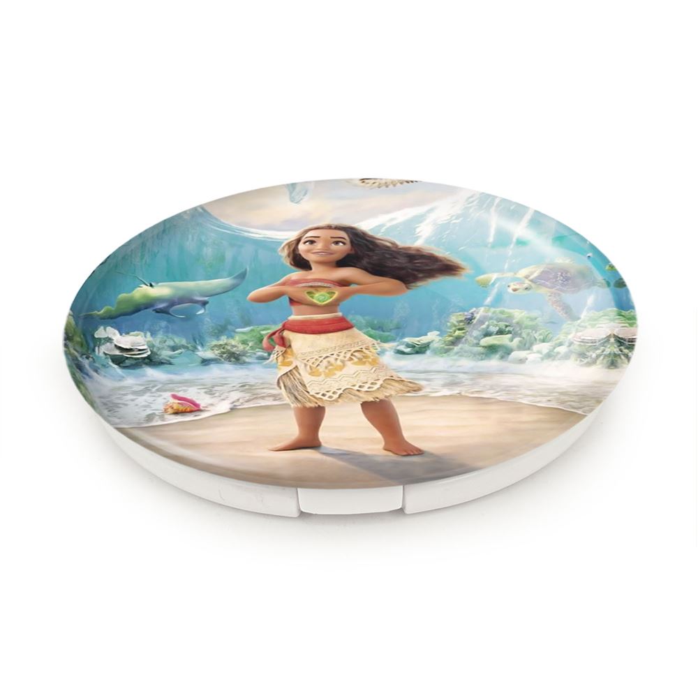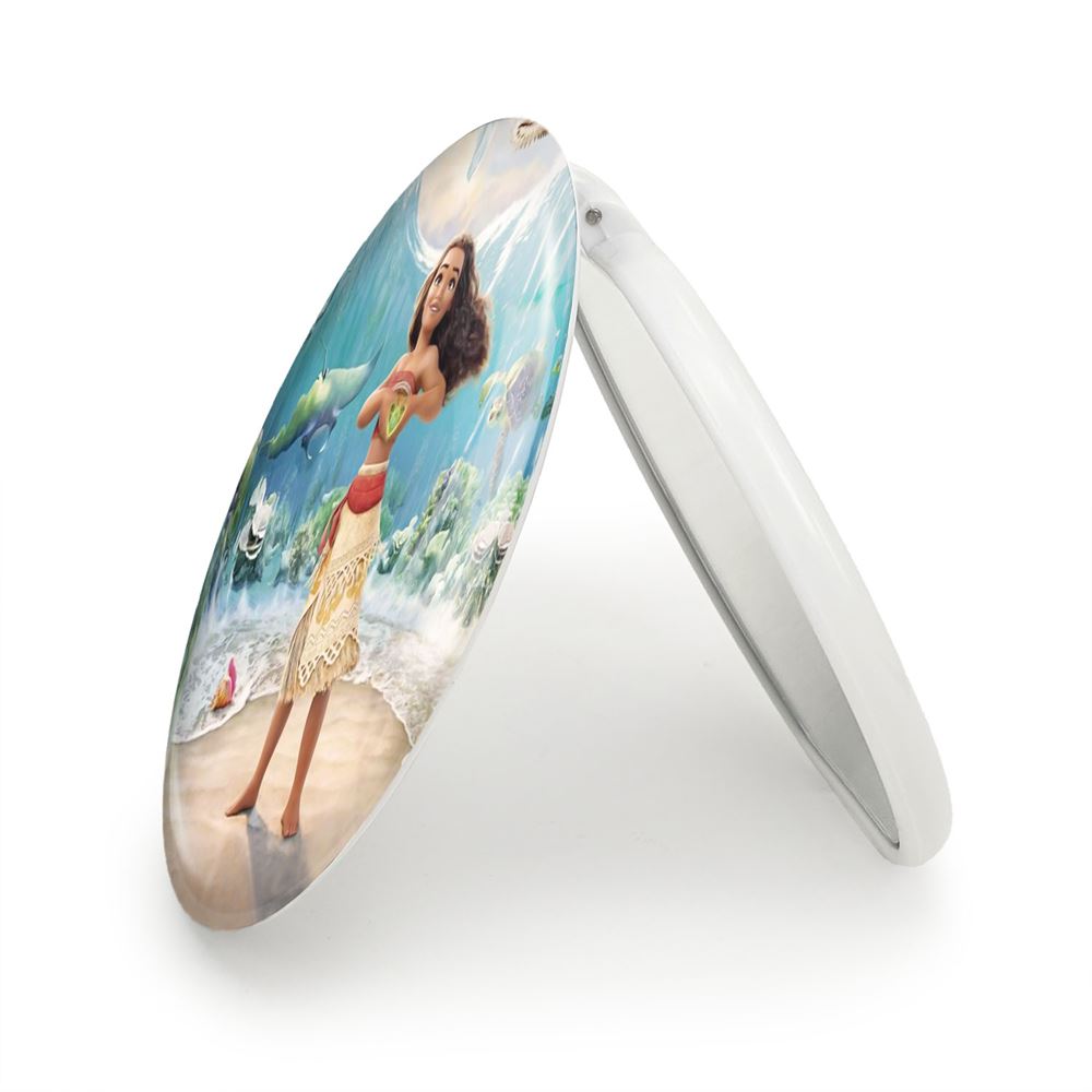 آینه های تاشو موآنا Moana خندالو، از جنس پلاستیک فشرده ABS تولید شده و به رنگ سفید می باشد. یکی از آینه ها ابعاد واقعی را نشان داده و دیگری با قابلیت بزرگنمایی، جزئیات را بهتر نمایش می دهد. ابعاد هر یک از آینه ها، دایره ای به قطر 7.5 سانت می باشد که نه خیلی بزرگ و غیر قابل استفاده در کیف آرایشی ست و نه خیلی کوچک که تصویر خاصی در آن مشاهده نشود. آینه تاشو موآنا Moana سایزی استاندارد و کارآمد دارد و در هر کیفی جا میگیرد. چاپ طرح بوسیله چاپگرهای دیجیتال شش رنگ با شفافیت و کیفیتی مثال زدنی بر روی یک وجه از بدنه ی آینه انجام گرفته و با روکش لمینت حرارتی پوشیده شده که در مقابل آسیب و خط و خش مقاوم بوده و کیفیت بالایی دارد. درب آینه بوسیله قفل بدنه ی آن، باز نمی ماند و کاملا بسته می شود و مناسب قرار گیری در کیف لوازم آرایش و کیف های کوچک دستی نیز هست. آینه های تاشو موآنا Moana خندالو با تنوع طرحی بسیار بالا، سلیقه هر نوع مخاطبی را تامین میکند.