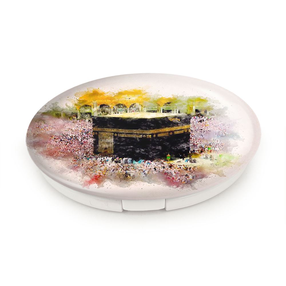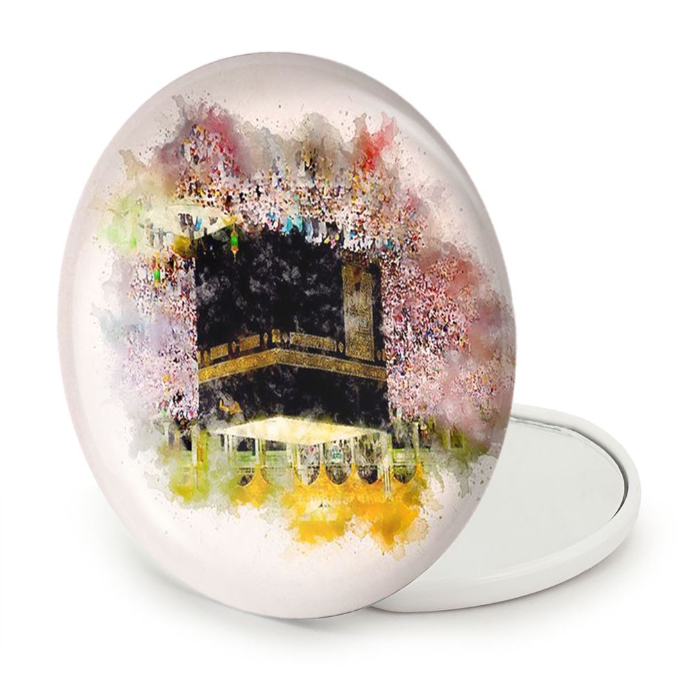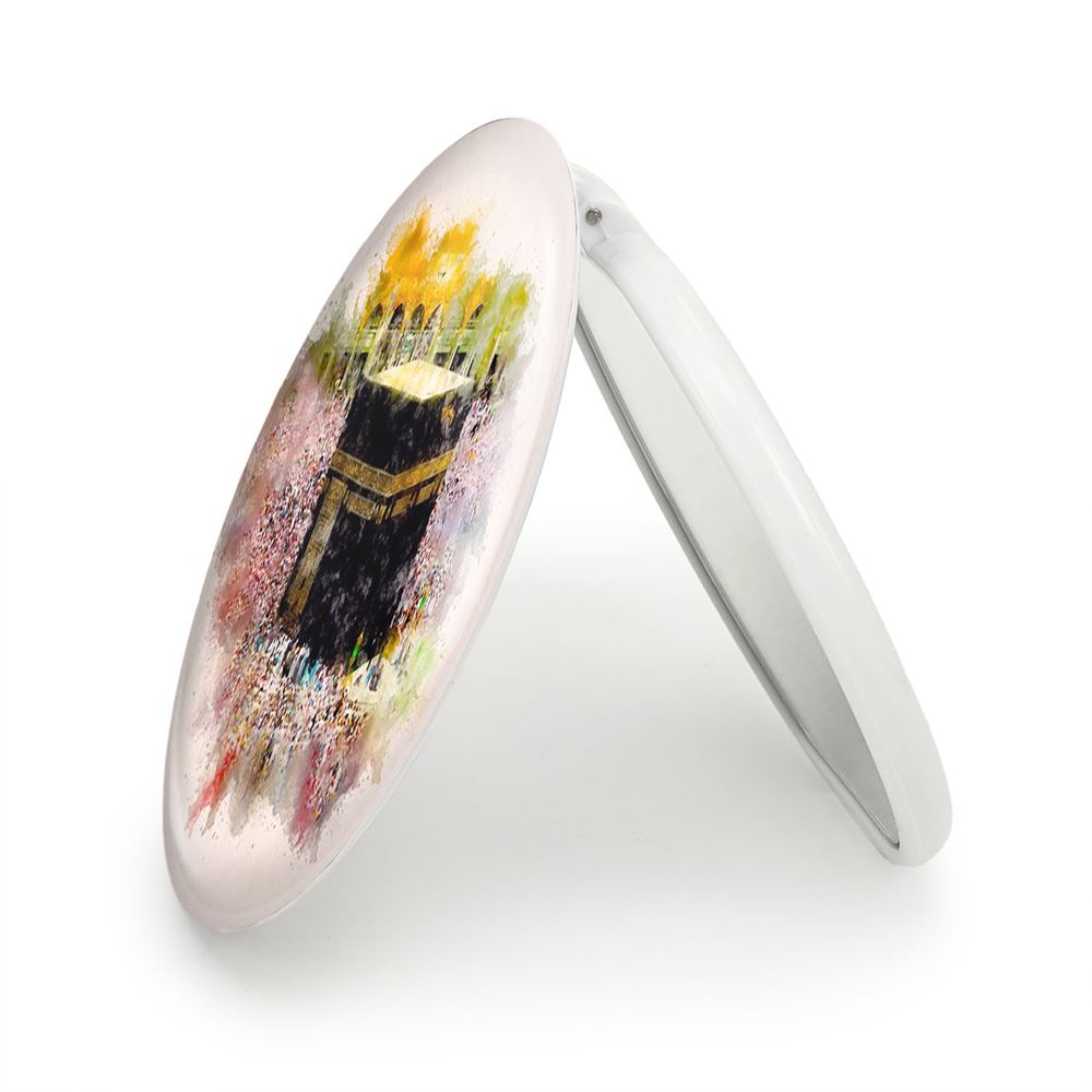 آینه های تاشو مکه خندالو، از جنس پلاستیک فشرده ABS تولید شده و به رنگ سفید می باشد. یکی از آینه ها ابعاد واقعی را نشان داده و دیگری با قابلیت بزرگنمایی، جزئیات را بهتر نمایش می دهد. ابعاد هر یک از آینه ها، دایره ای به قطر 7.5 سانت می باشد که نه خیلی بزرگ و غیر قابل استفاده در کیف آرایشی ست و نه خیلی کوچک که تصویر خاصی در آن مشاهده نشود. آینه تاشو مکه سایزی استاندارد و کارآمد دارد و در هر کیفی جا میگیرد. چاپ طرح بوسیله چاپگرهای دیجیتال شش رنگ با شفافیت و کیفیتی مثال زدنی بر روی یک وجه از بدنه ی آینه انجام گرفته و با روکش لمینت حرارتی پوشیده شده که در مقابل آسیب و خط و خش مقاوم بوده و کیفیت بالایی دارد. درب آینه بوسیله قفل بدنه ی آن، باز نمی ماند و کاملا بسته می شود و مناسب قرار گیری در کیف لوازم آرایش و کیف های کوچک دستی نیز هست. آینه های تاشو مکه خندالو با تنوع طرحی بسیار بالا، سلیقه هر نوع مخاطبی را تامین میکند.